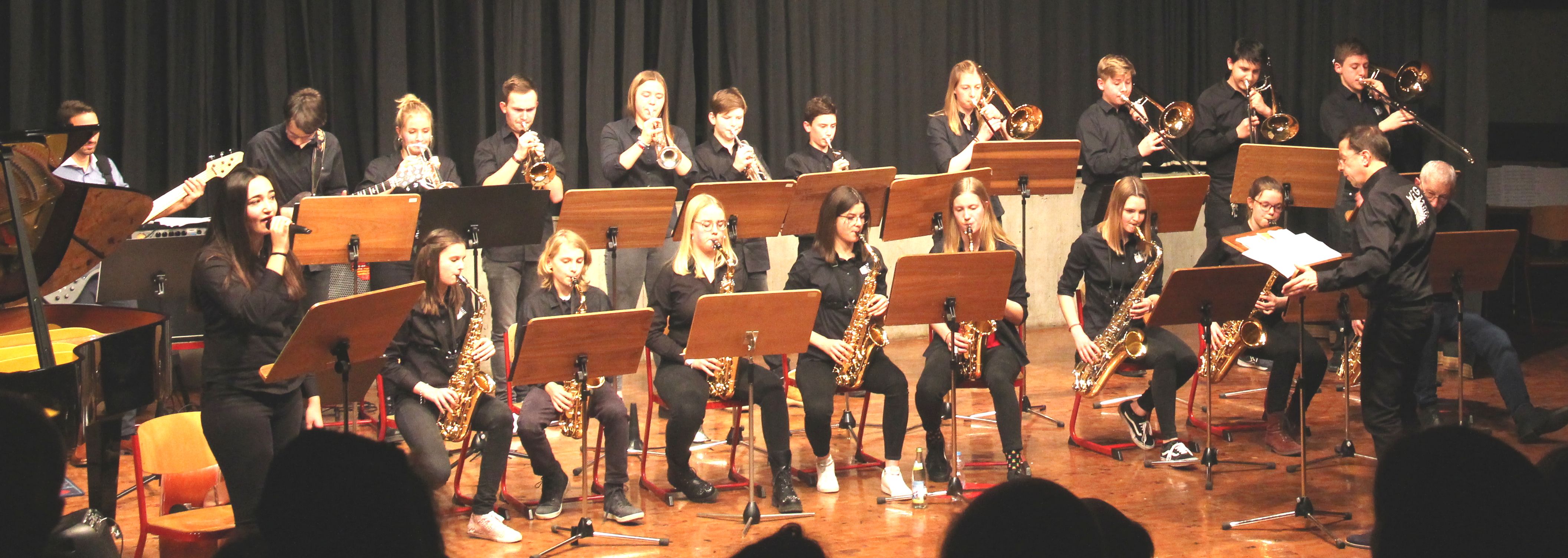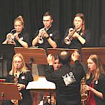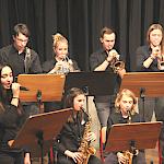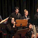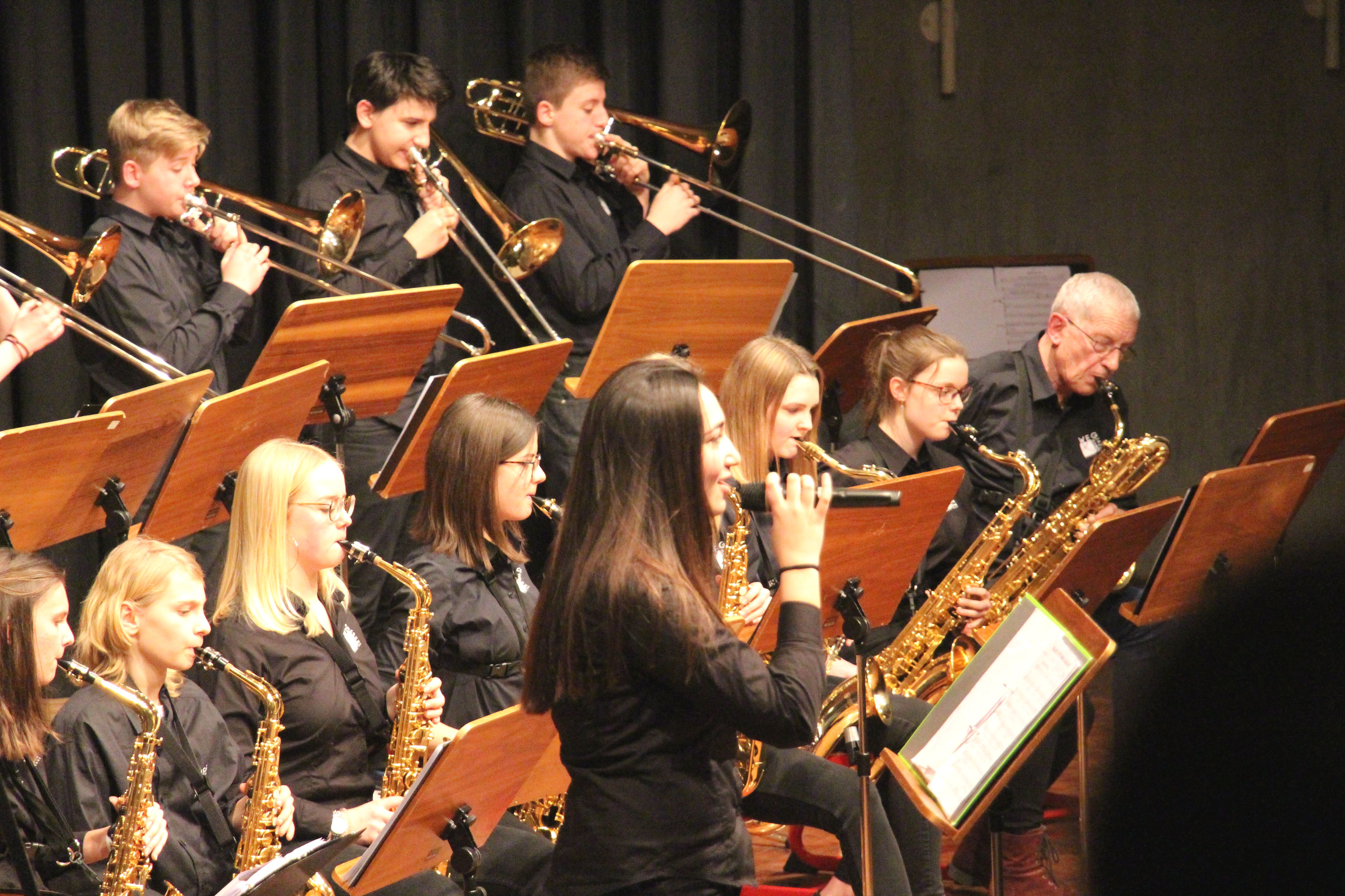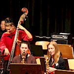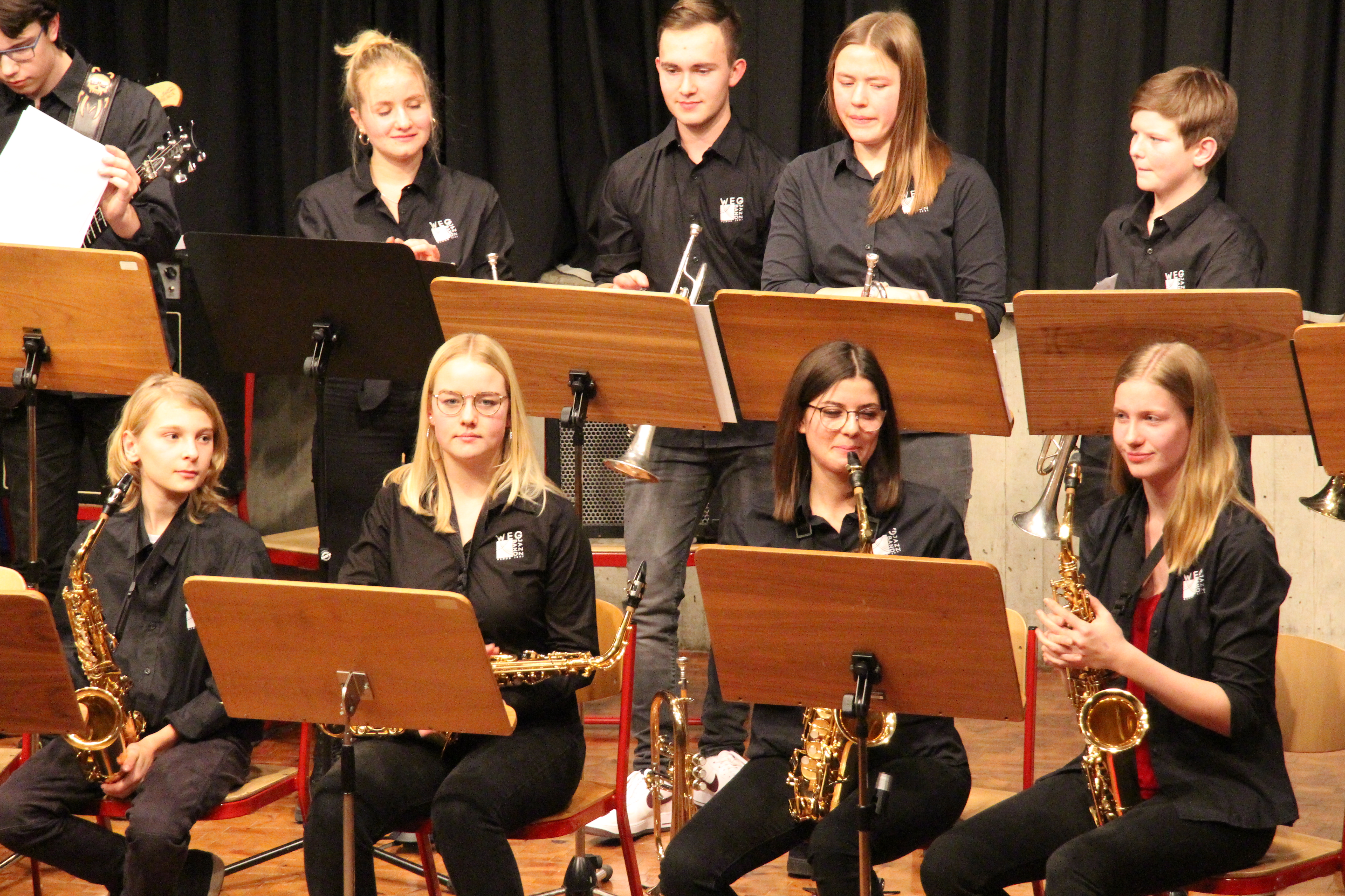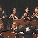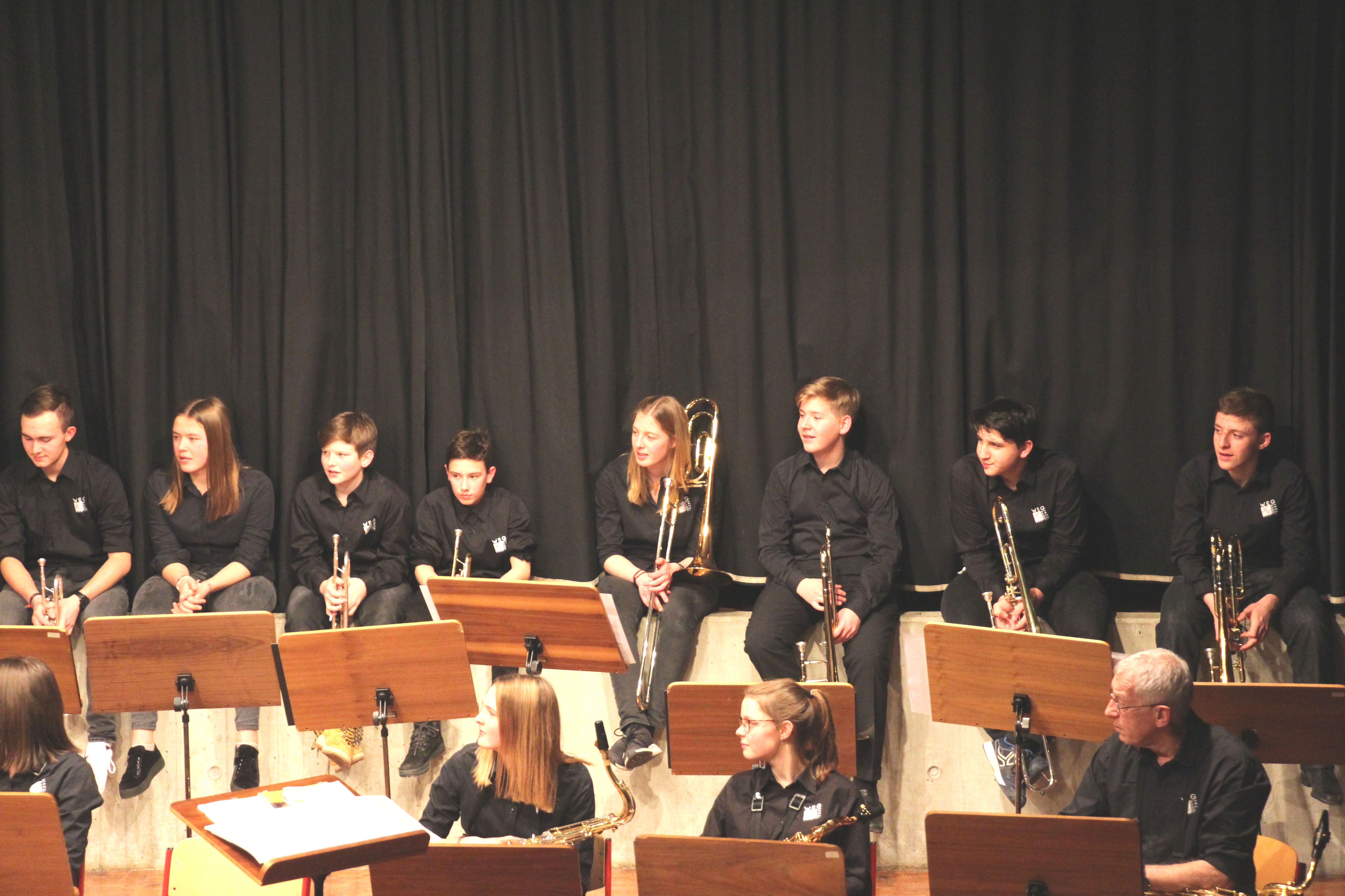 Die Stabübergabe an die „WeG-Jazzband“ erfolgte im Anschluss mit "Pick Up the Pieces", zu dem Harry Berger für sein Saxophonensemble ein Vorspiel komponiert hat, welches von der „WeG-Jazzband“ aufgegriffen und weitergeführt wurde. Dabei zeigte Nina Grether in ihrem Improvisationsteil, zu welchen tollen Leistungen sie mit ihrem Altsaxophon fähig ist. Auch in den folgenden Stücken konnten die Jugendlichen der „WeG-Jazzband“ zeigen, wozu sie solistisch fähig sind: Jonathan Schied improvisierte in der bekannten Ballade „Autumn leaves“ mit seiner Posaune, in Spencer Williams „Basin street blues“ zeigte sich Charlotte Riedel als Stimmführerin des Trompetenregisters in bester Form, während in „Crazy little thing called love“, einem Song der Rockgruppe Queen, wiederum Nina Grether als Solistin hervortrat. Cyndi Laupers lyrisches „Time after time“ wurde ebenfalls sehr einfühlsam, von Emely Brehm begleitet.