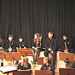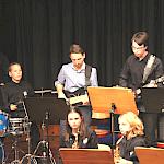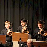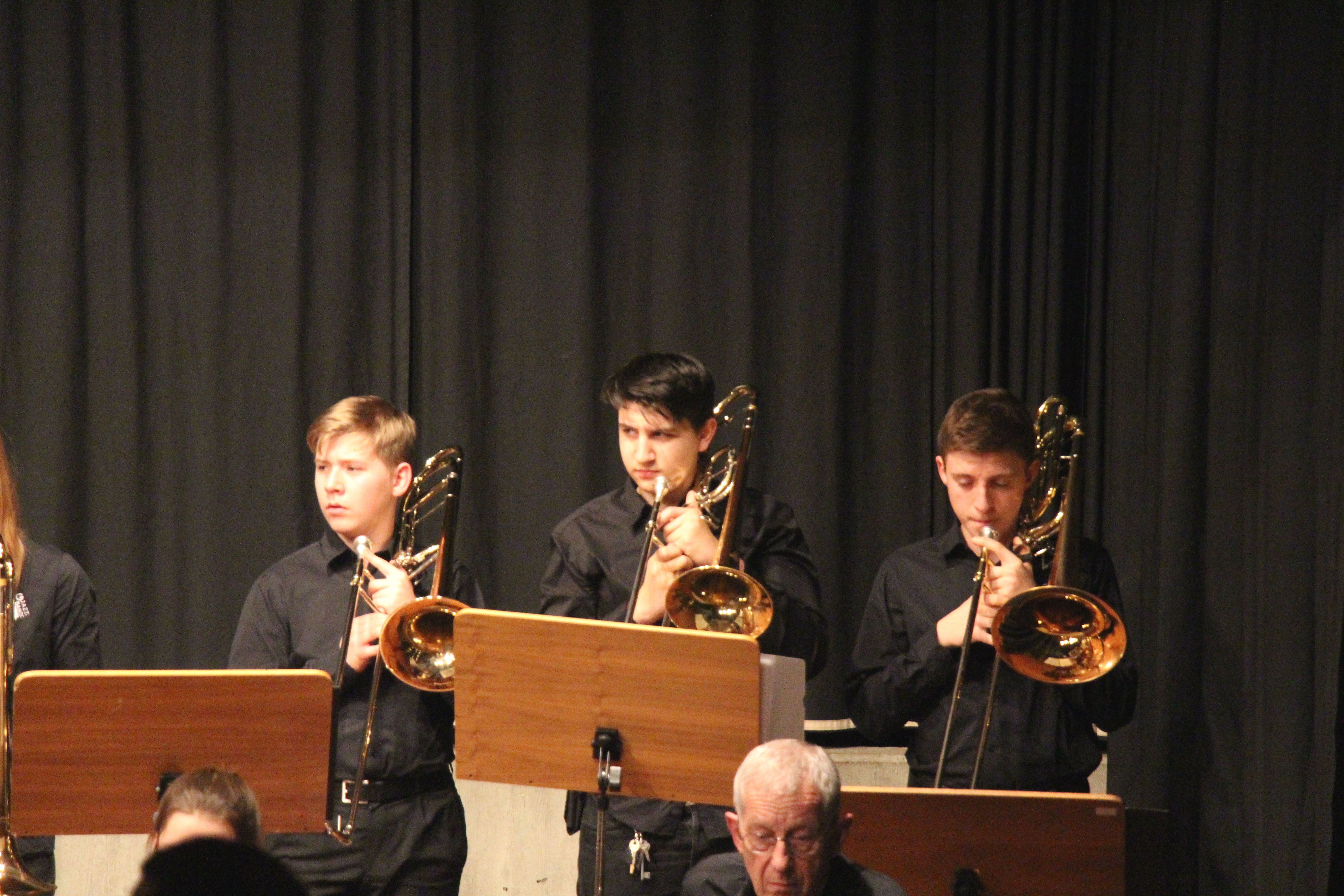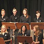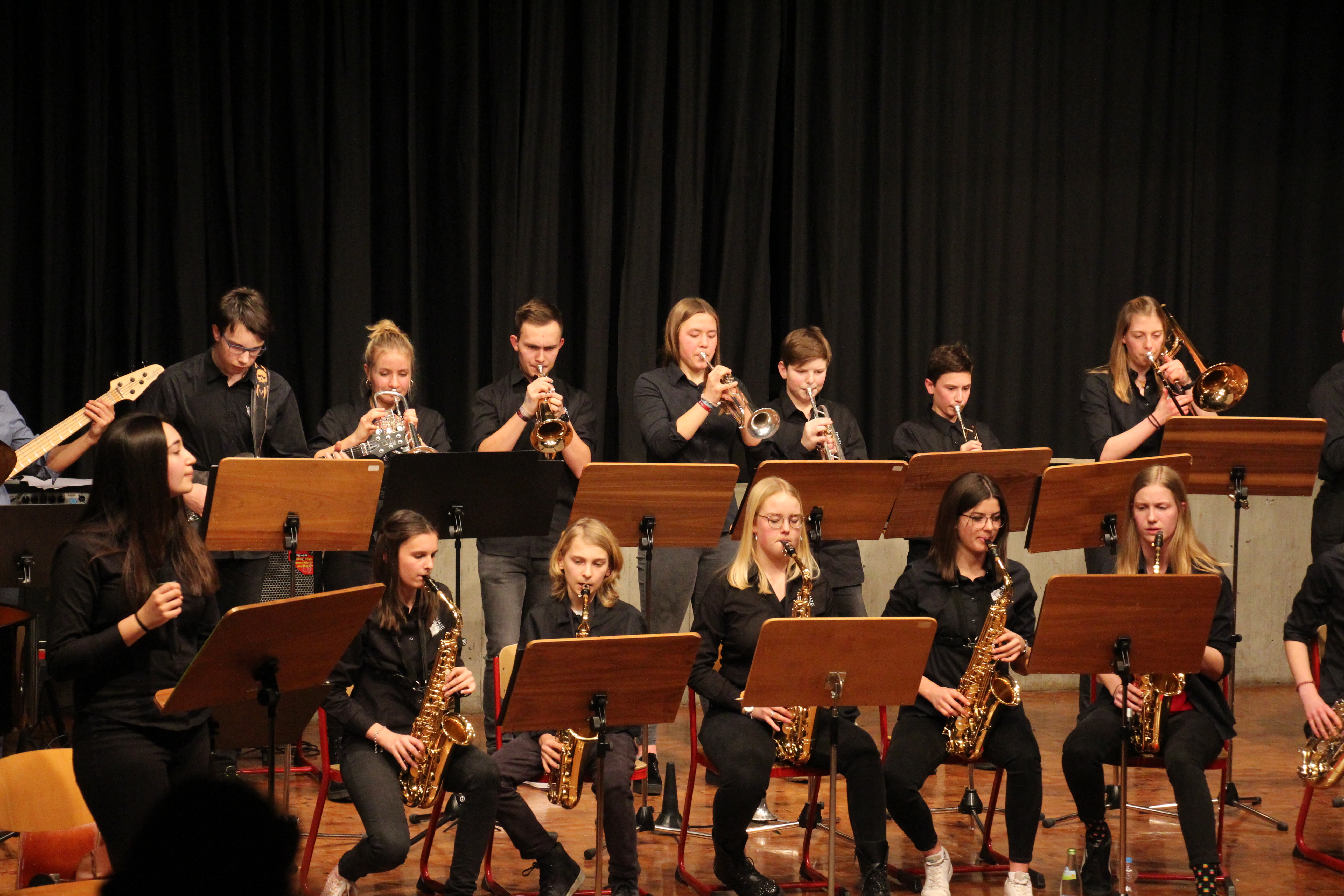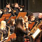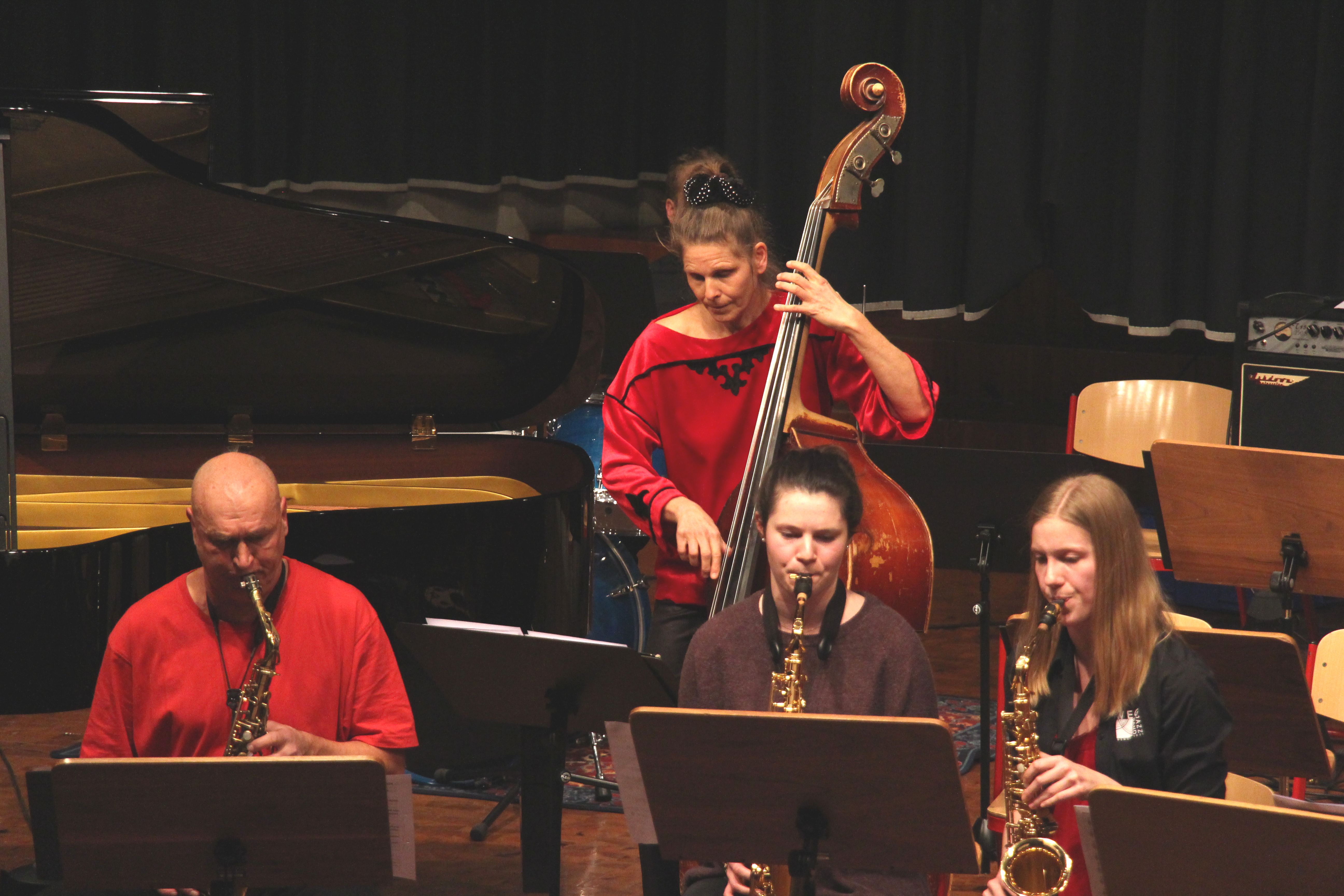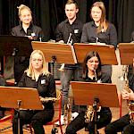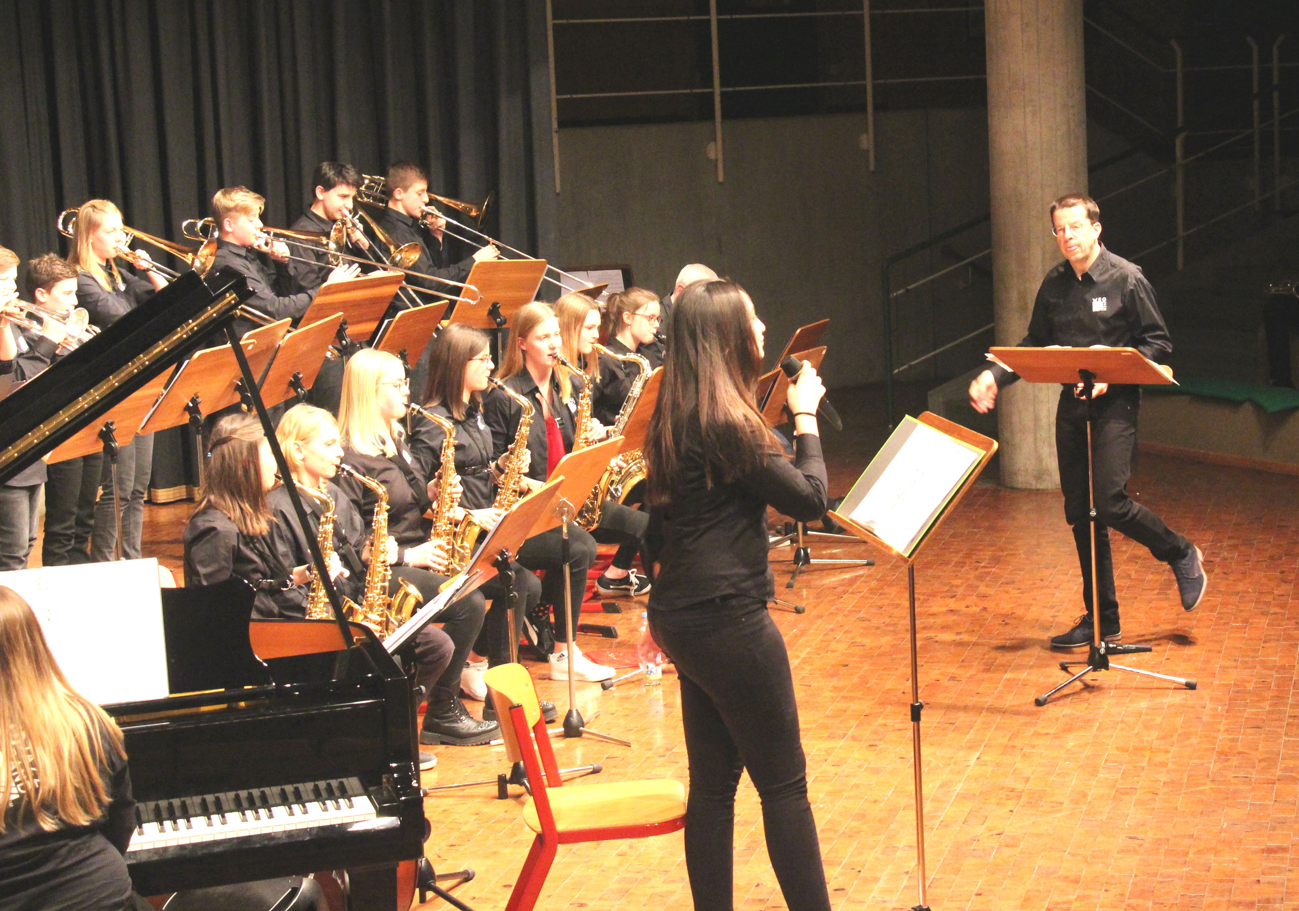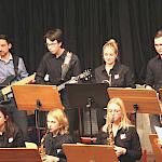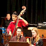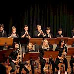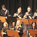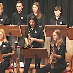 Die Stabübergabe an die „WeG-Jazzband“ erfolgte im Anschluss mit "Pick Up the Pieces", zu dem Harry Berger für sein Saxophonensemble ein Vorspiel komponiert hat, welches von der „WeG-Jazzband“ aufgegriffen und weitergeführt wurde. Dabei zeigte Nina Grether in ihrem Improvisationsteil, zu welchen tollen Leistungen sie mit ihrem Altsaxophon fähig ist. Auch in den folgenden Stücken konnten die Jugendlichen der „WeG-Jazzband“ zeigen, wozu sie solistisch fähig sind: Jonathan Schied improvisierte in der bekannten Ballade „Autumn leaves“ mit seiner Posaune, in Spencer Williams „Basin street blues“ zeigte sich Charlotte Riedel als Stimmführerin des Trompetenregisters in bester Form, während in „Crazy little thing called love“, einem Song der Rockgruppe Queen, wiederum Nina Grether als Solistin hervortrat. Cyndi Laupers lyrisches „Time after time“ wurde ebenfalls sehr einfühlsam, von Emely Brehm begleitet.