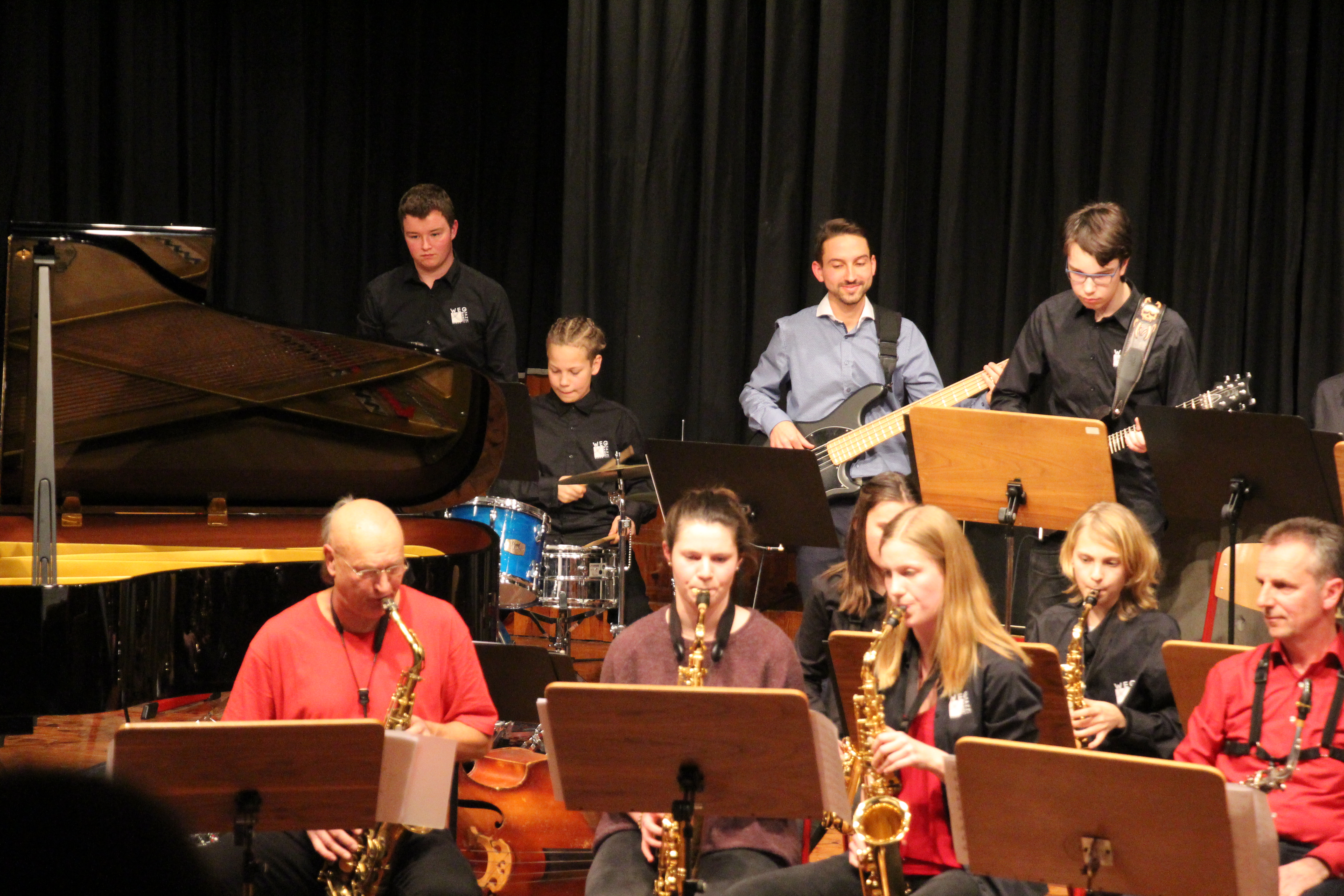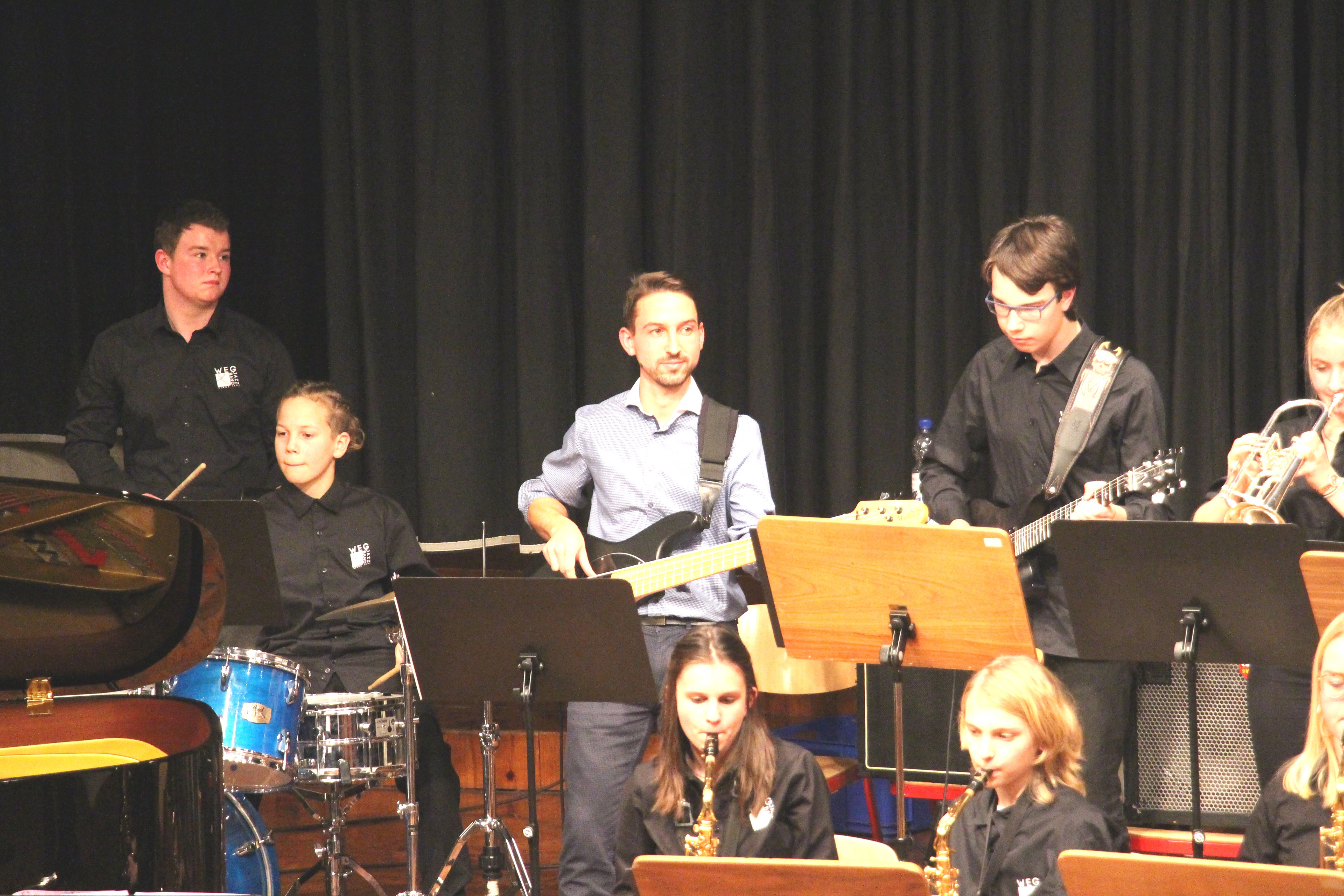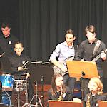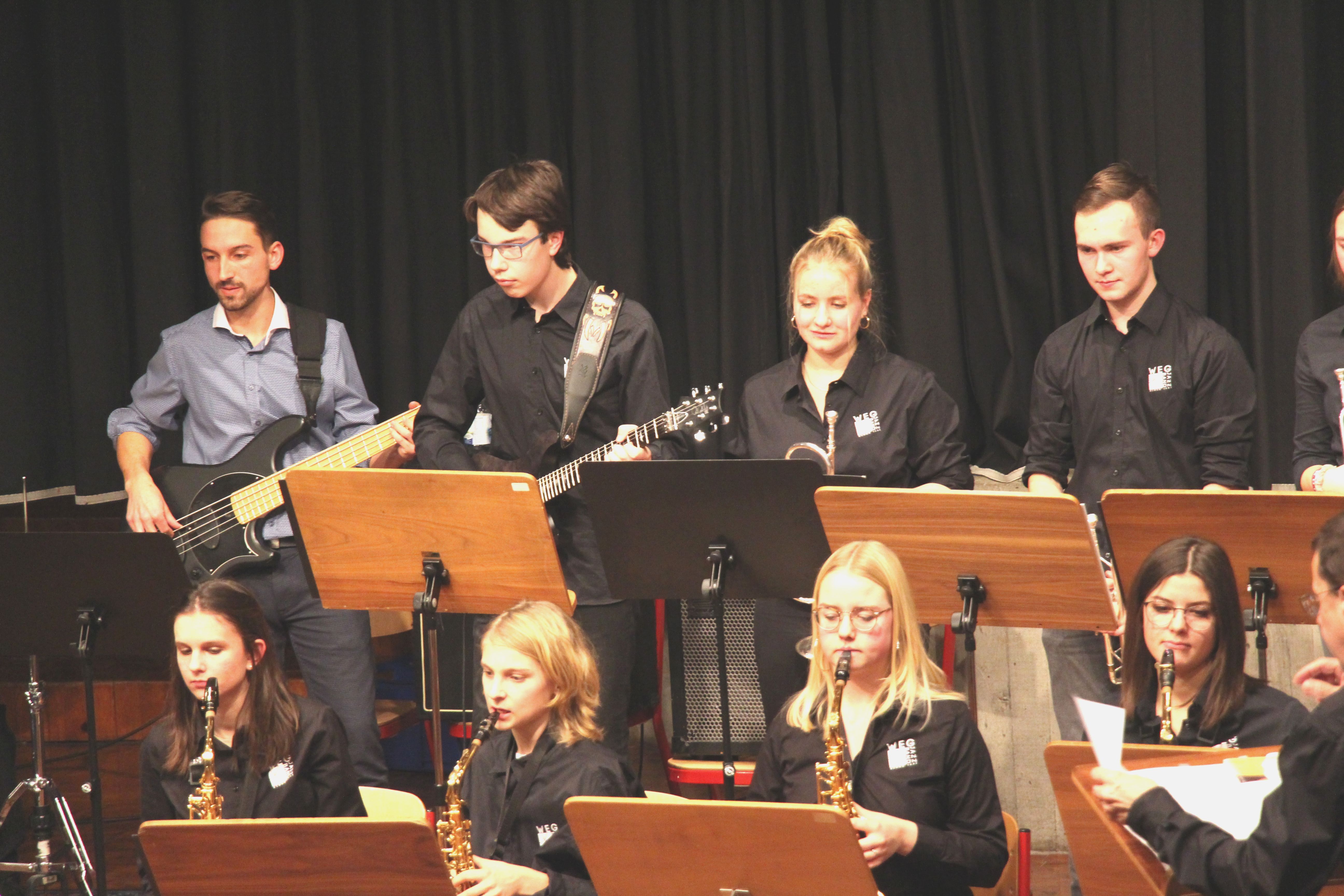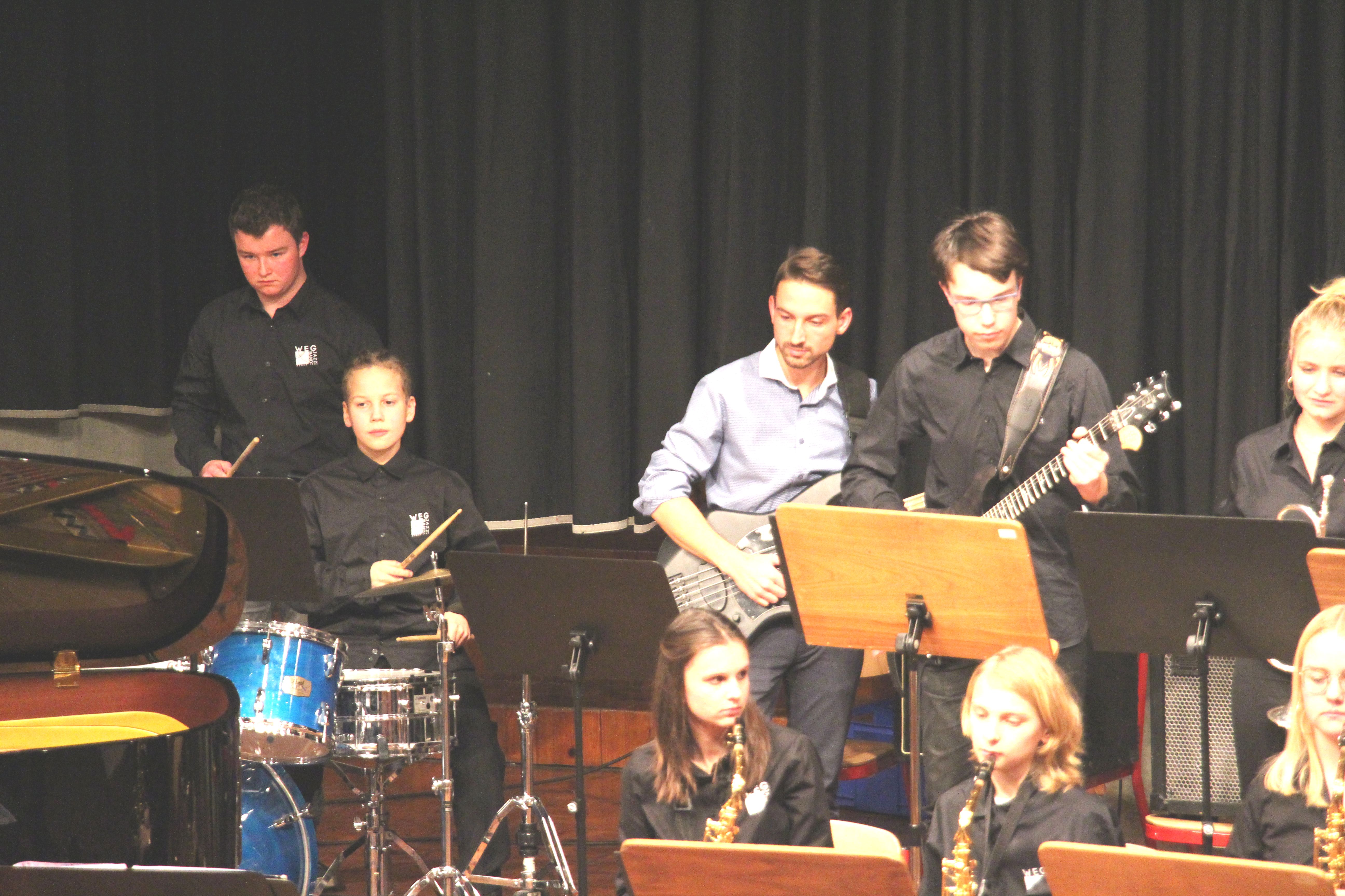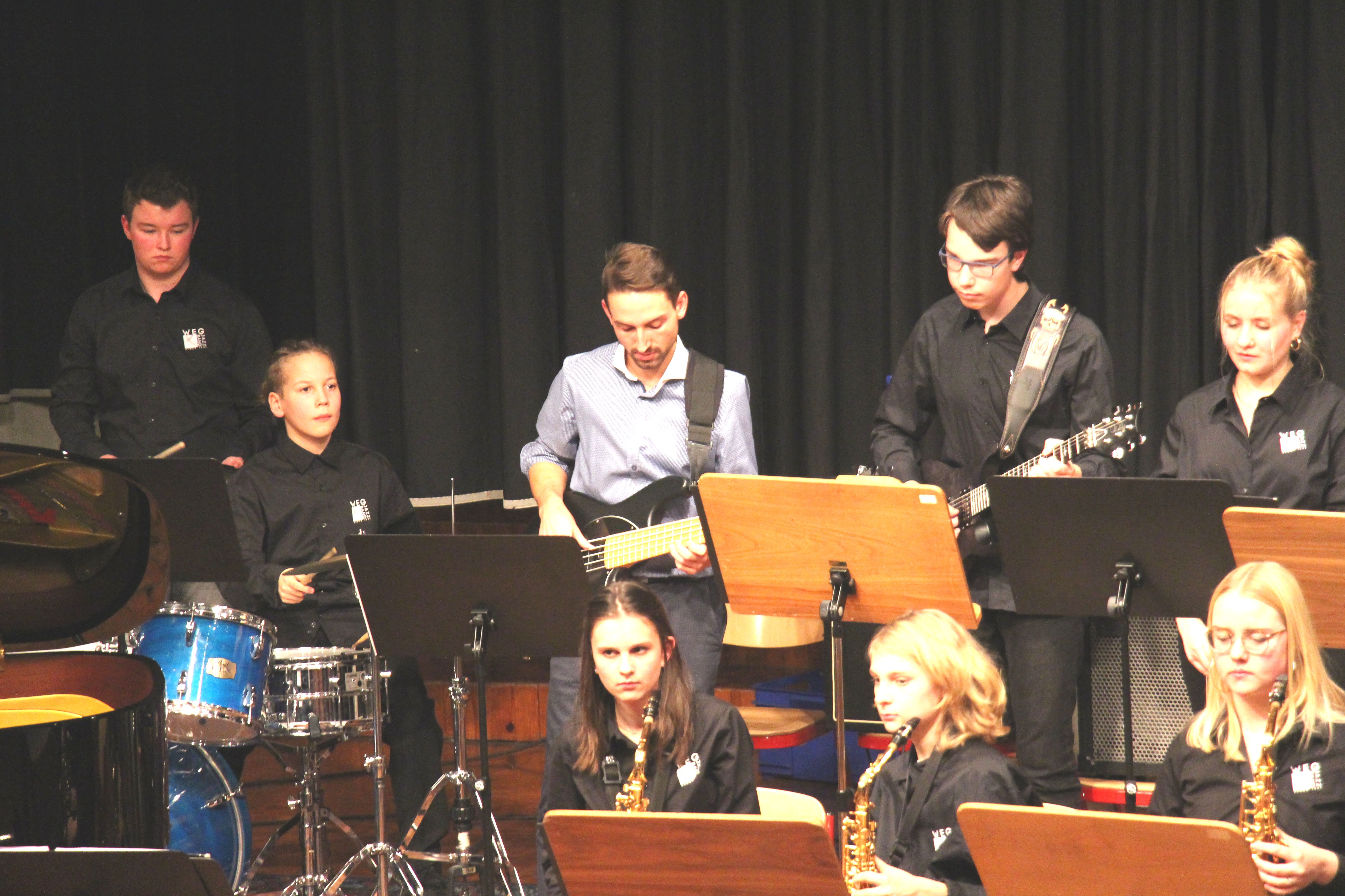 Als besondere Abwechslung erklärte sich der ehemalige „WeG-Jazzband“-Schüler und studierte Jazzmusiker Andreas Schmid bereit, zusammen mit Harry Berger über den Standard „Bye, bye blackbird“ zu improvisieren. Hierbei zeigten beide Musiker ihr sehr hohes musikalisches Niveau, was auch im letzten Stück des Abends „Witchi-Tai-To“ deutlich wurde. Dabei kamen vor allem die folkloristischen Elemente zum Tragen, die der indianischen Saxophonist Jim Pepper in die Originalversion einfließen ließ. Wiederum ließ es sich Harry Berger nicht nehmen, auch dieses Stück für beide Bands umzurangieren. Das Ergebnis konnte sich hören lassen: Nach einem improvisierten Anfang, der aus allen Teilen des werkgymnasialen Foyers erklang, sammelte sich die Gruppe auf der Bühne und musizierte das Musikstück nun gemeinschaftlich mit der „WeG-Jazzband“ sehr überzeugend. Auch hierbei kamen verschiedene Solisten zum Zuge wie Gitarrenlehrer Frank Kettler, der am Altsaxophon sein Können zeigte oder Marlon Bass mit seiner Gitarre. Etwas ganz Besonderes war in diesem Schlussstück nicht nur das Schlagzeugsolo der beiden WeG-Schlagzeuger Aaron Nagel an der Conga und Moritz Sauter am Drumset, sondern auch die gesamte Begleitung der Rhythmussektion. Damit ging ein sehr eindrücklicher und abwechslungsreicher Konzertabend zu Ende, der auch aufgrund des hohen musikalischen Niveaus vom Publikum mit ausdauerndem Beifall bedacht wurde.
