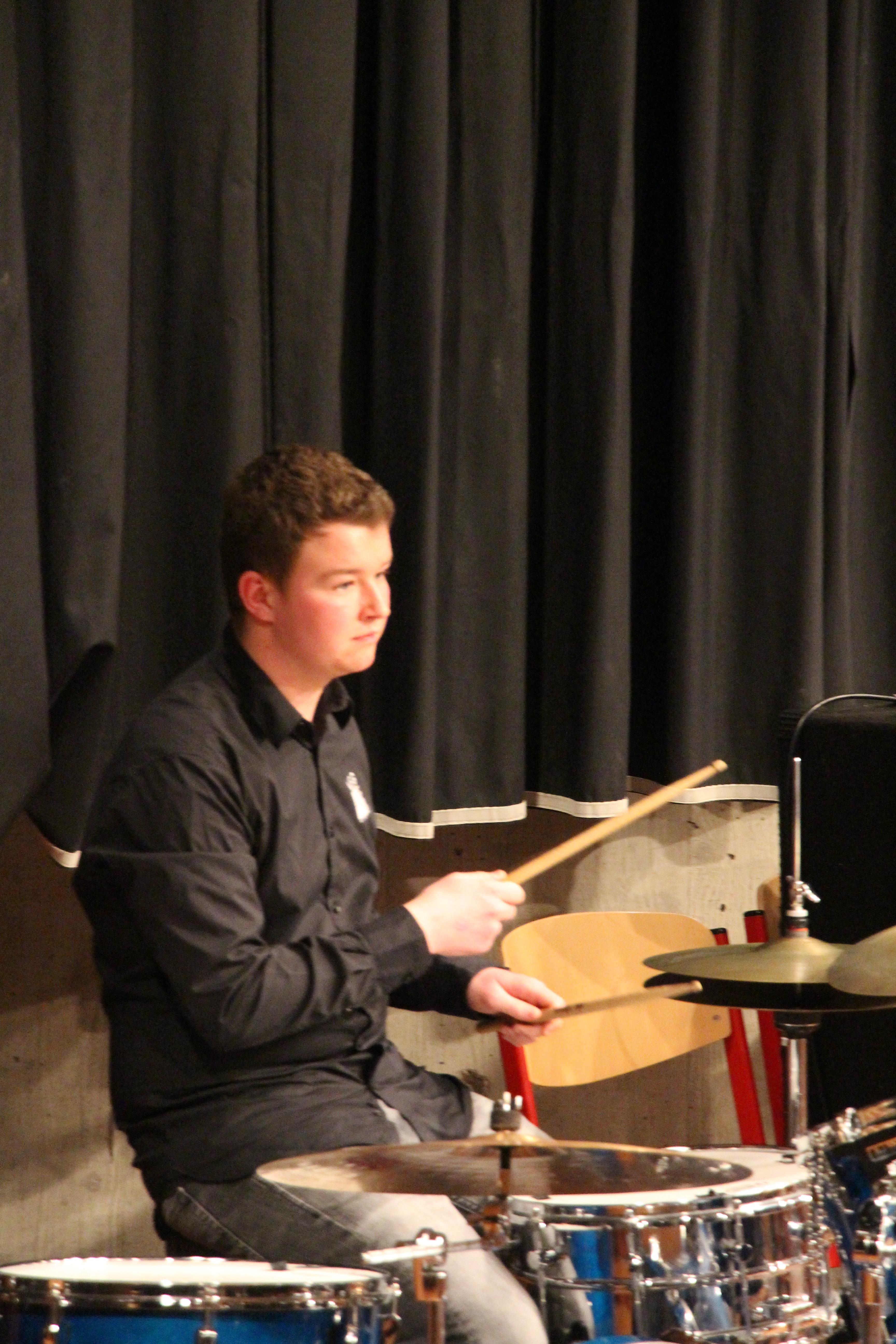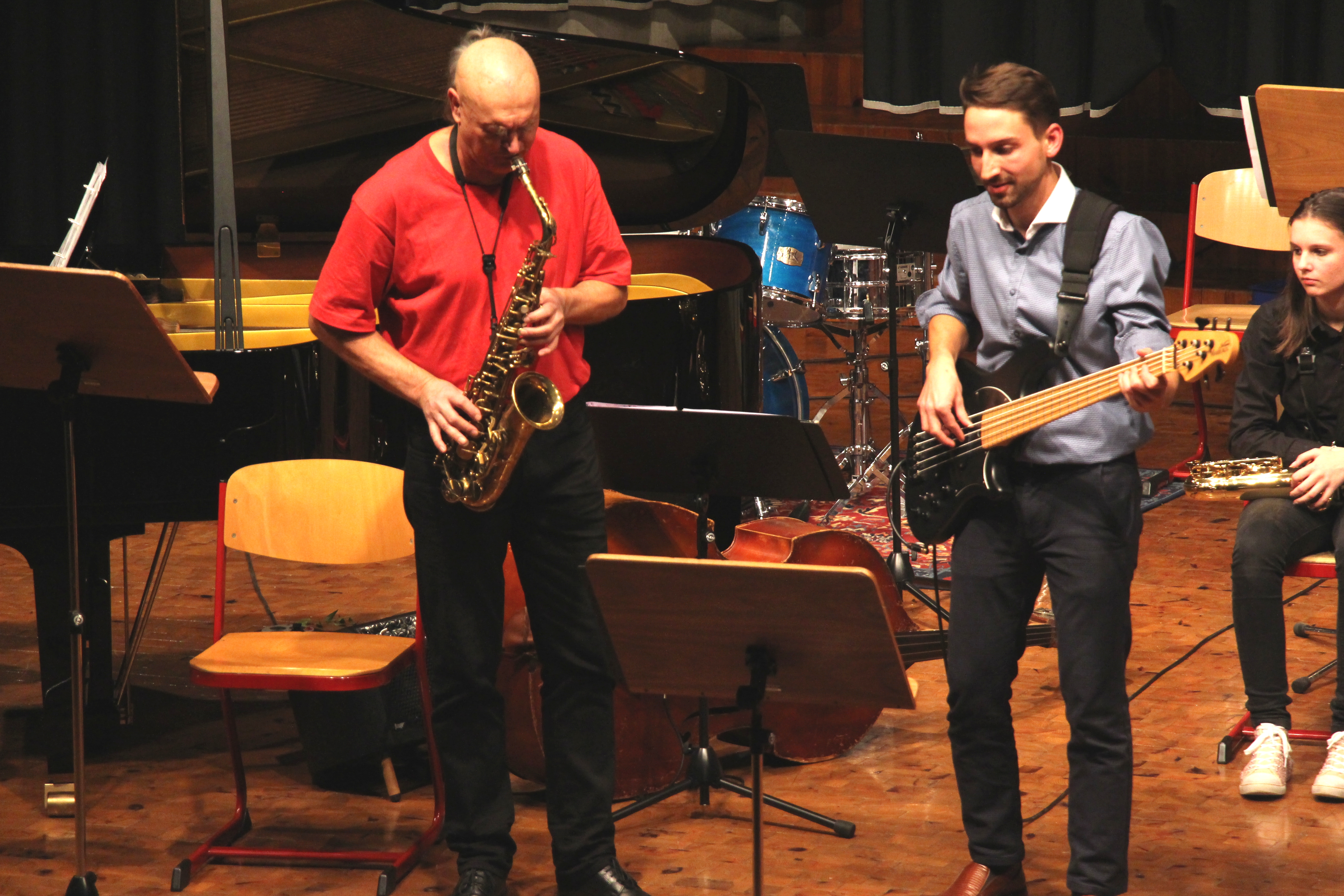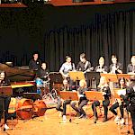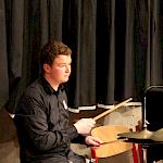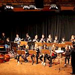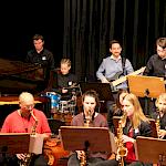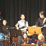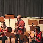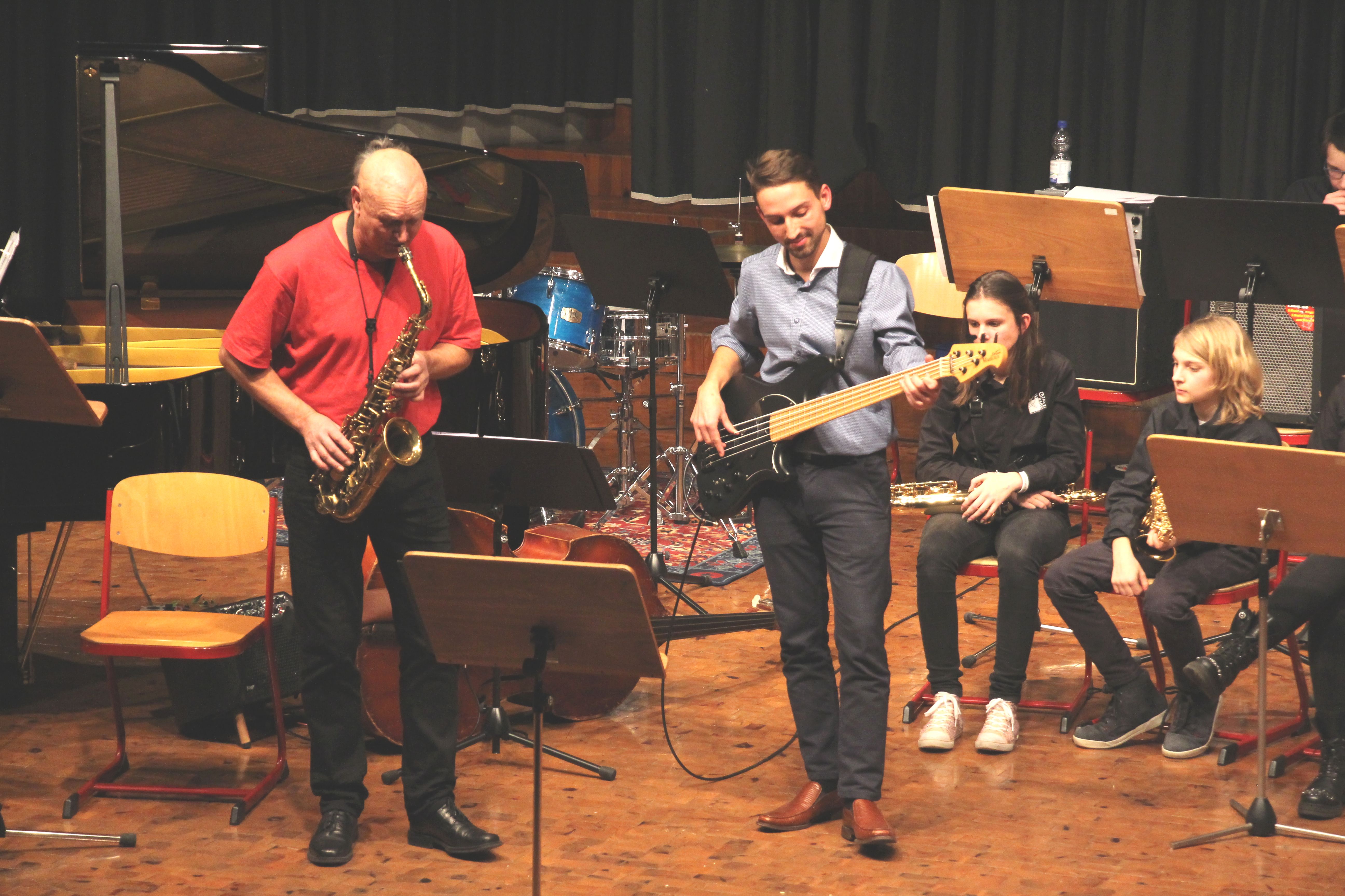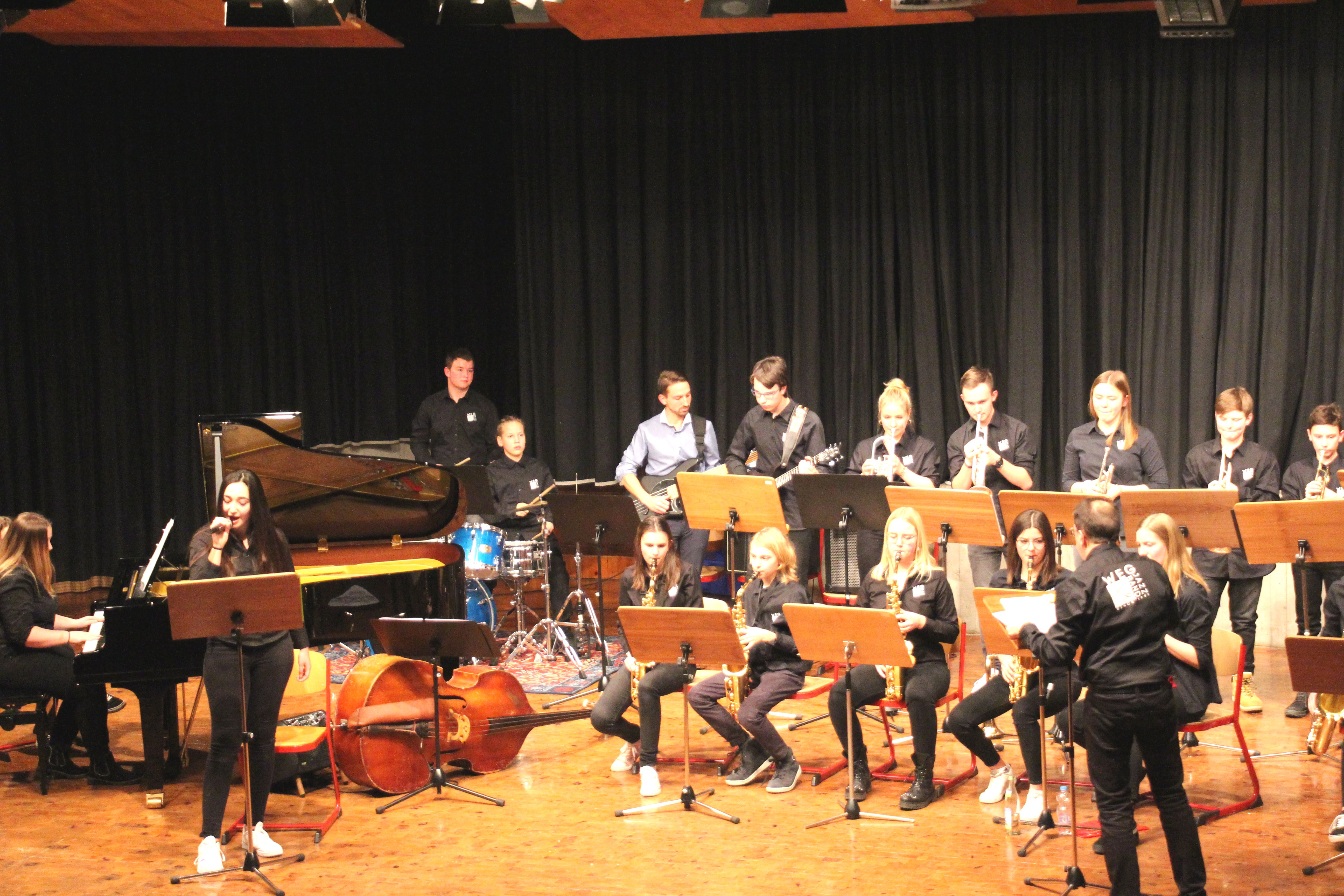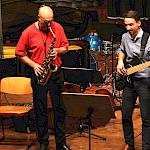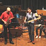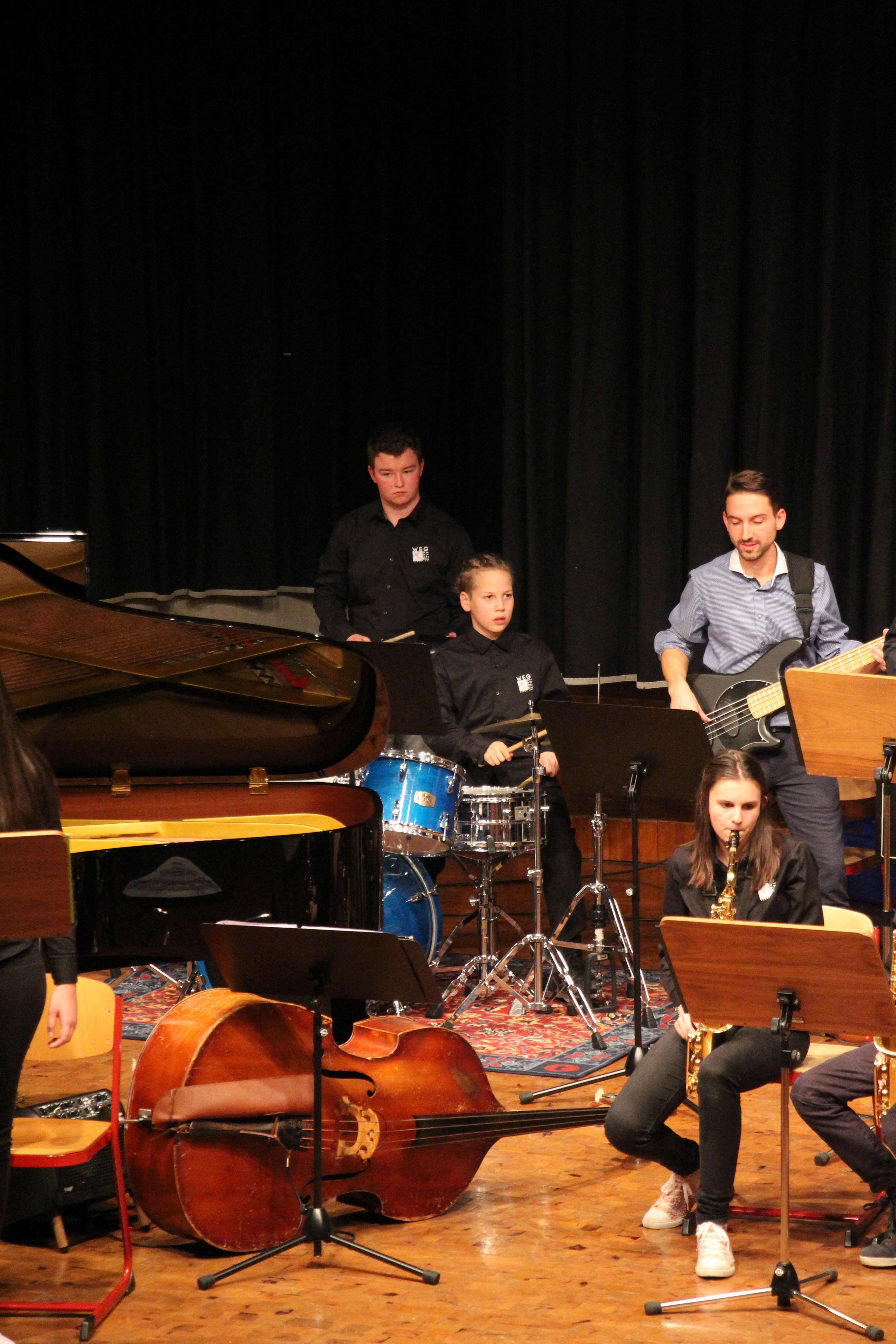 Als besondere Abwechslung erklärte sich der ehemalige „WeG-Jazzband“-Schüler und studierte Jazzmusiker Andreas Schmid bereit, zusammen mit Harry Berger über den Standard „Bye, bye blackbird“ zu improvisieren. Hierbei zeigten beide Musiker ihr sehr hohes musikalisches Niveau, was auch im letzten Stück des Abends „Witchi-Tai-To“ deutlich wurde. Dabei kamen vor allem die folkloristischen Elemente zum Tragen, die der indianischen Saxophonist Jim Pepper in die Originalversion einfließen ließ. Wiederum ließ es sich Harry Berger nicht nehmen, auch dieses Stück für beide Bands umzurangieren. Das Ergebnis konnte sich hören lassen: Nach einem improvisierten Anfang, der aus allen Teilen des werkgymnasialen Foyers erklang, sammelte sich die Gruppe auf der Bühne und musizierte das Musikstück nun gemeinschaftlich mit der „WeG-Jazzband“ sehr überzeugend. Auch hierbei kamen verschiedene Solisten zum Zuge wie Gitarrenlehrer Frank Kettler, der am Altsaxophon sein Können zeigte oder Marlon Bass mit seiner Gitarre. Etwas ganz Besonderes war in diesem Schlussstück nicht nur das Schlagzeugsolo der beiden WeG-Schlagzeuger Aaron Nagel an der Conga und Moritz Sauter am Drumset, sondern auch die gesamte Begleitung der Rhythmussektion. Damit ging ein sehr eindrücklicher und abwechslungsreicher Konzertabend zu Ende, der auch aufgrund des hohen musikalischen Niveaus vom Publikum mit ausdauerndem Beifall bedacht wurde.