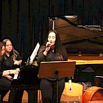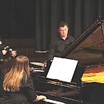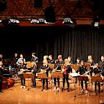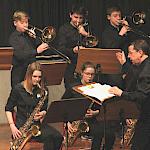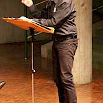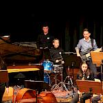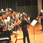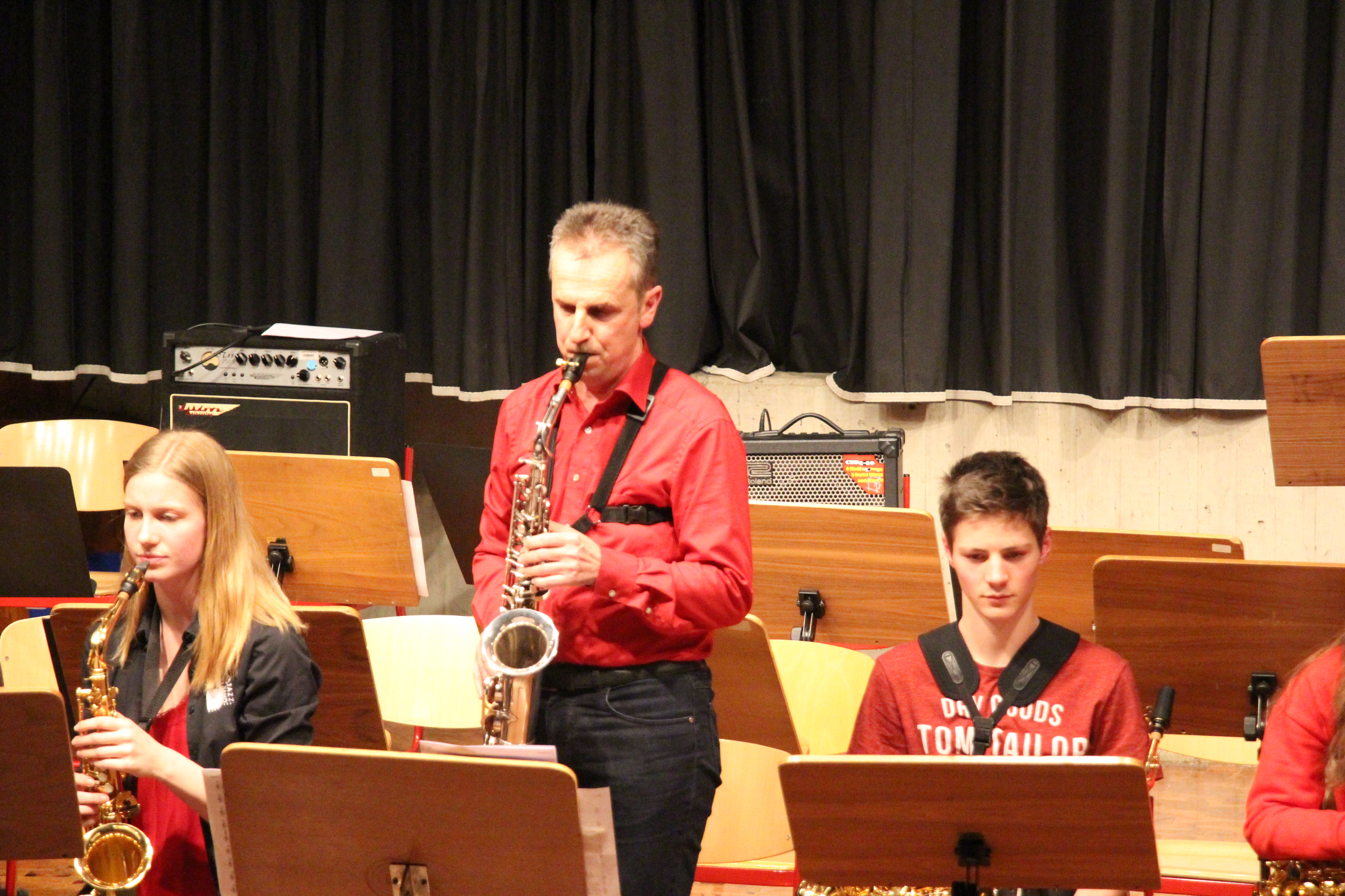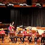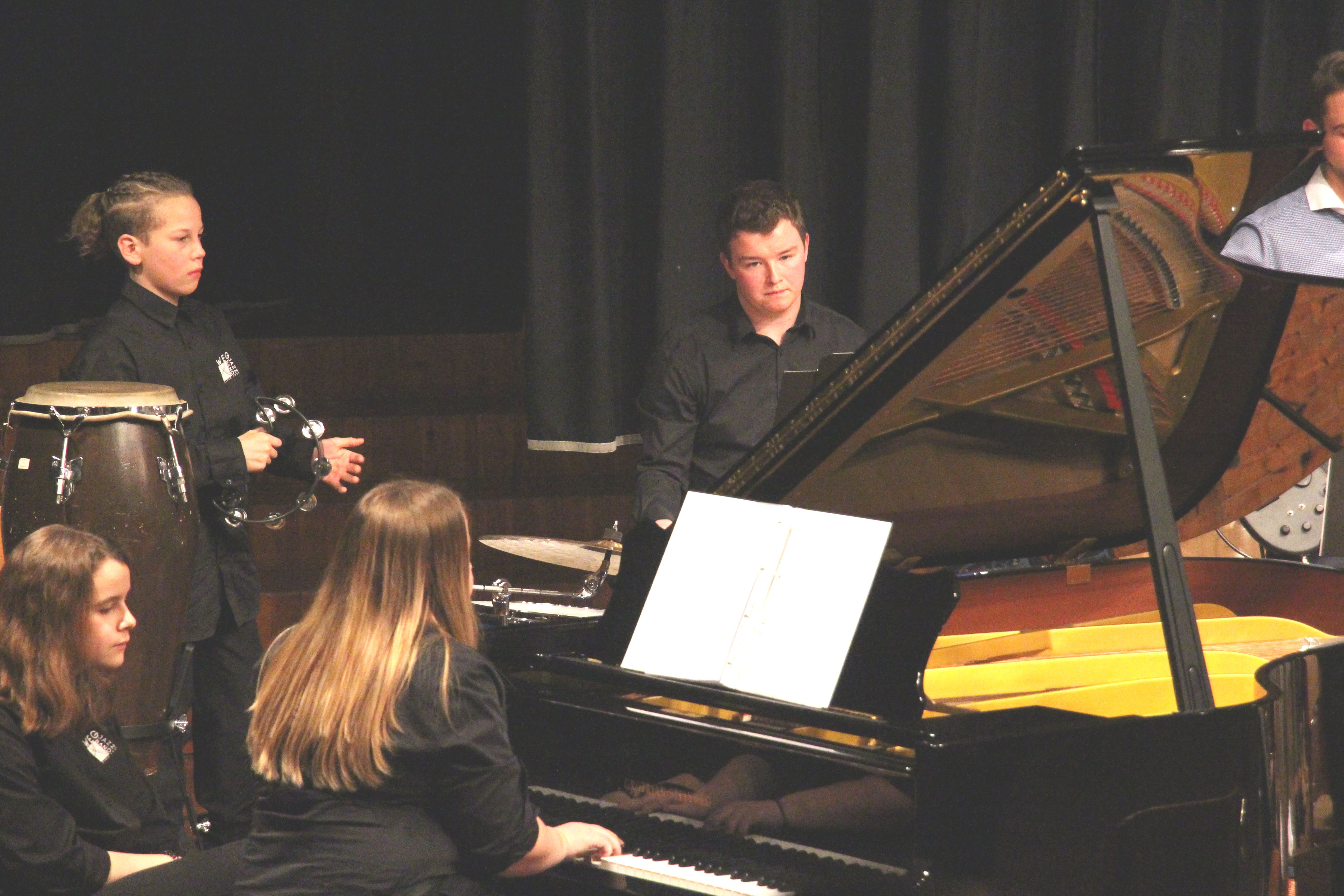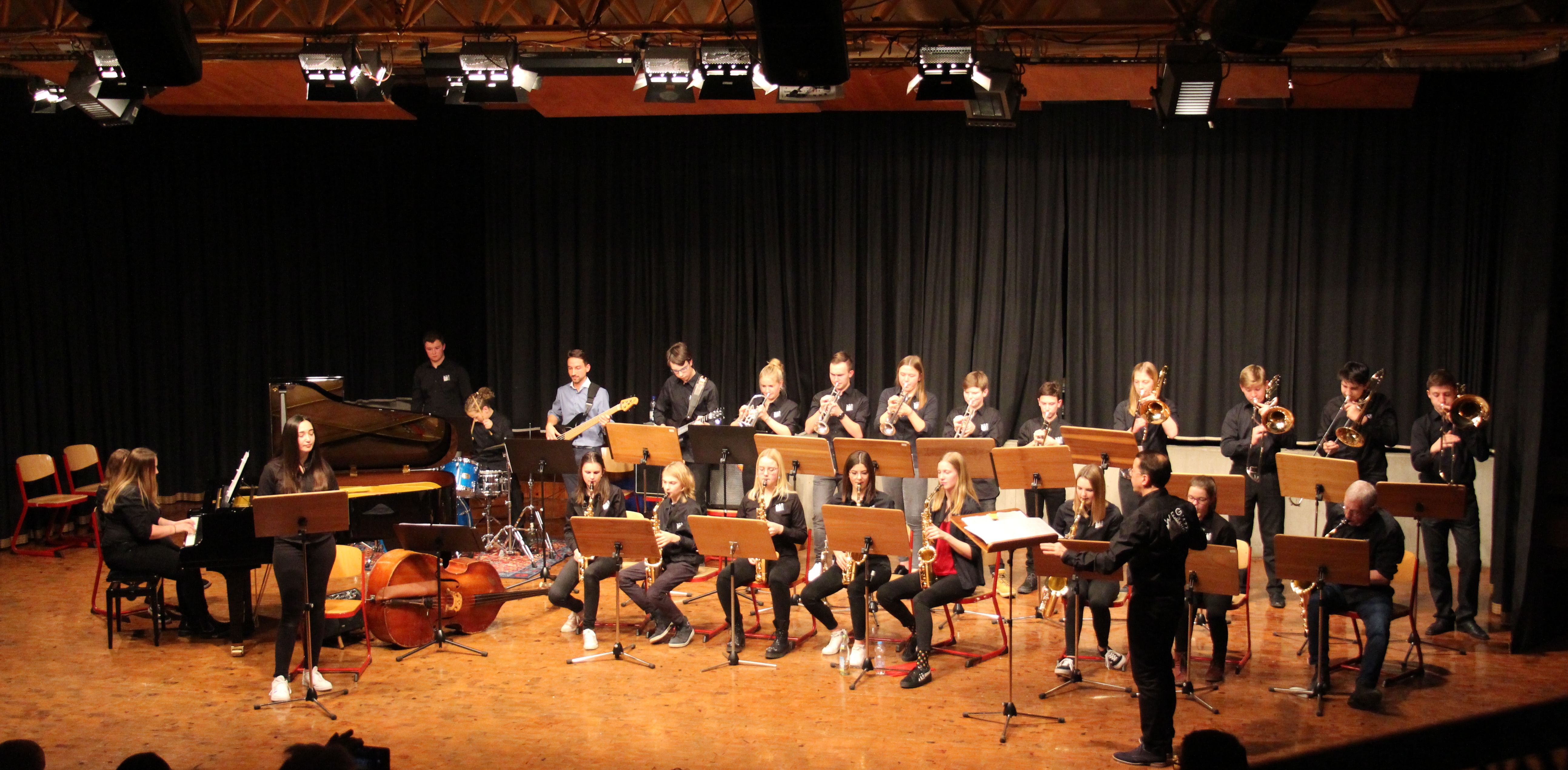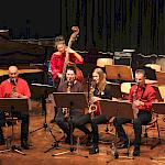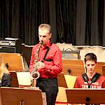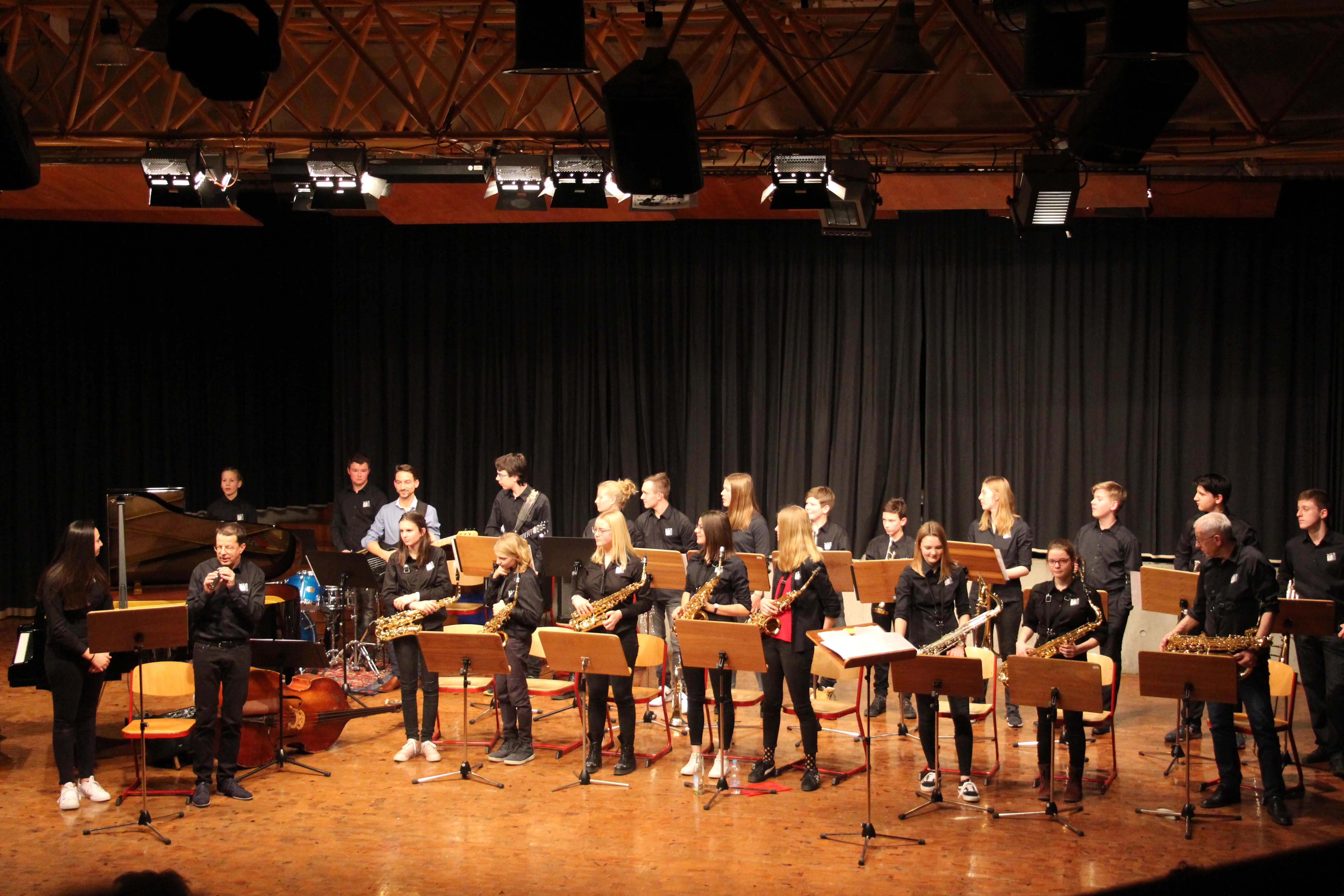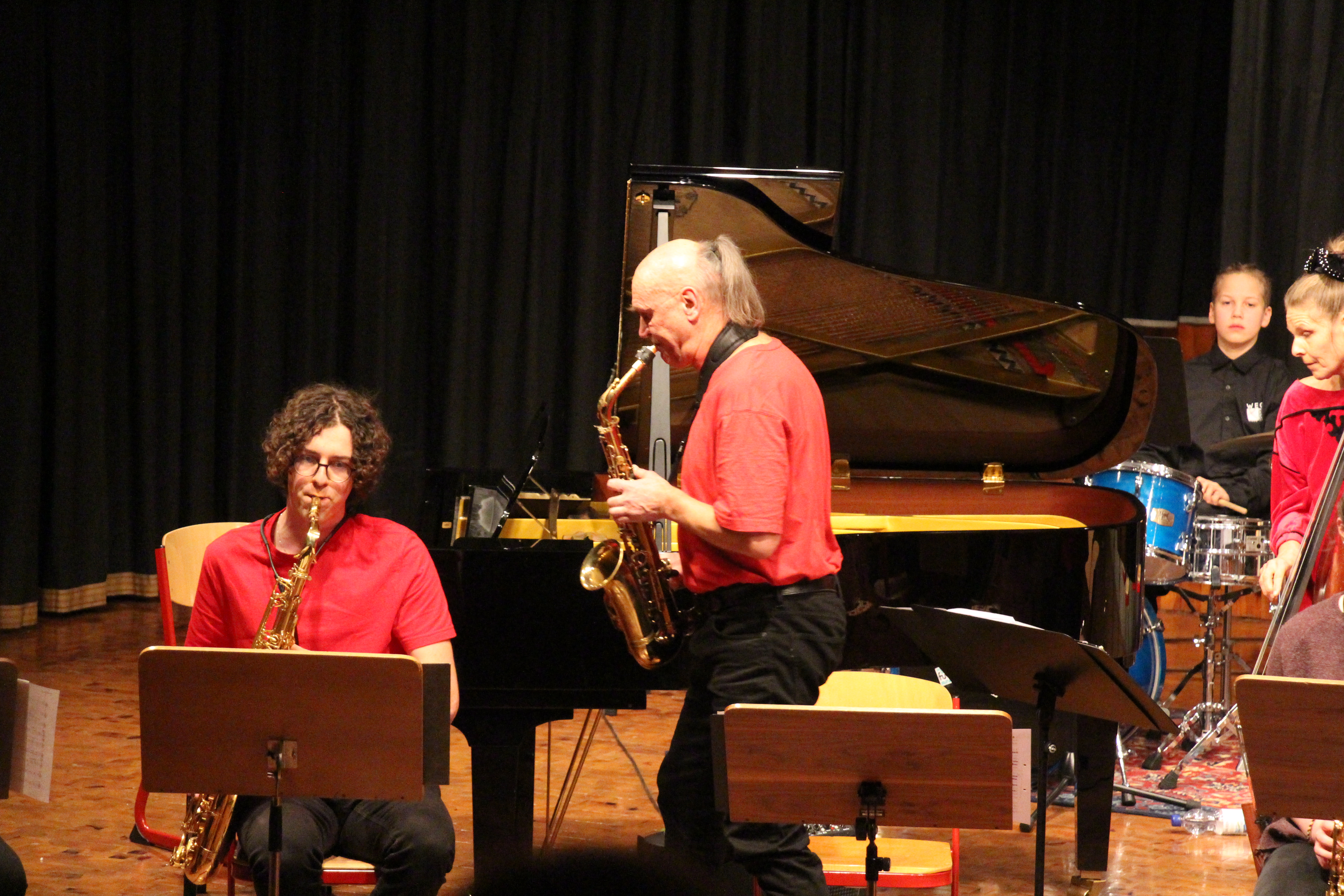 Als besondere Abwechslung erklärte sich der ehemalige „WeG-Jazzband“-Schüler und studierte Jazzmusiker Andreas Schmid bereit, zusammen mit Harry Berger über den Standard „Bye, bye blackbird“ zu improvisieren. Hierbei zeigten beide Musiker ihr sehr hohes musikalisches Niveau, was auch im letzten Stück des Abends „Witchi-Tai-To“ deutlich wurde. Dabei kamen vor allem die folkloristischen Elemente zum Tragen, die der indianischen Saxophonist Jim Pepper in die Originalversion einfließen ließ. Wiederum ließ es sich Harry Berger nicht nehmen, auch dieses Stück für beide Bands umzurangieren. Das Ergebnis konnte sich hören lassen: Nach einem improvisierten Anfang, der aus allen Teilen des werkgymnasialen Foyers erklang, sammelte sich die Gruppe auf der Bühne und musizierte das Musikstück nun gemeinschaftlich mit der „WeG-Jazzband“ sehr überzeugend. Auch hierbei kamen verschiedene Solisten zum Zuge wie Gitarrenlehrer Frank Kettler, der am Altsaxophon sein Können zeigte oder Marlon Bass mit seiner Gitarre. Etwas ganz Besonderes war in diesem Schlussstück nicht nur das Schlagzeugsolo der beiden WeG-Schlagzeuger Aaron Nagel an der Conga und Moritz Sauter am Drumset, sondern auch die gesamte Begleitung der Rhythmussektion. Damit ging ein sehr eindrücklicher und abwechslungsreicher Konzertabend zu Ende, der auch aufgrund des hohen musikalischen Niveaus vom Publikum mit ausdauerndem Beifall bedacht wurde.
