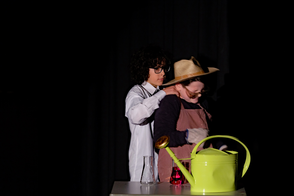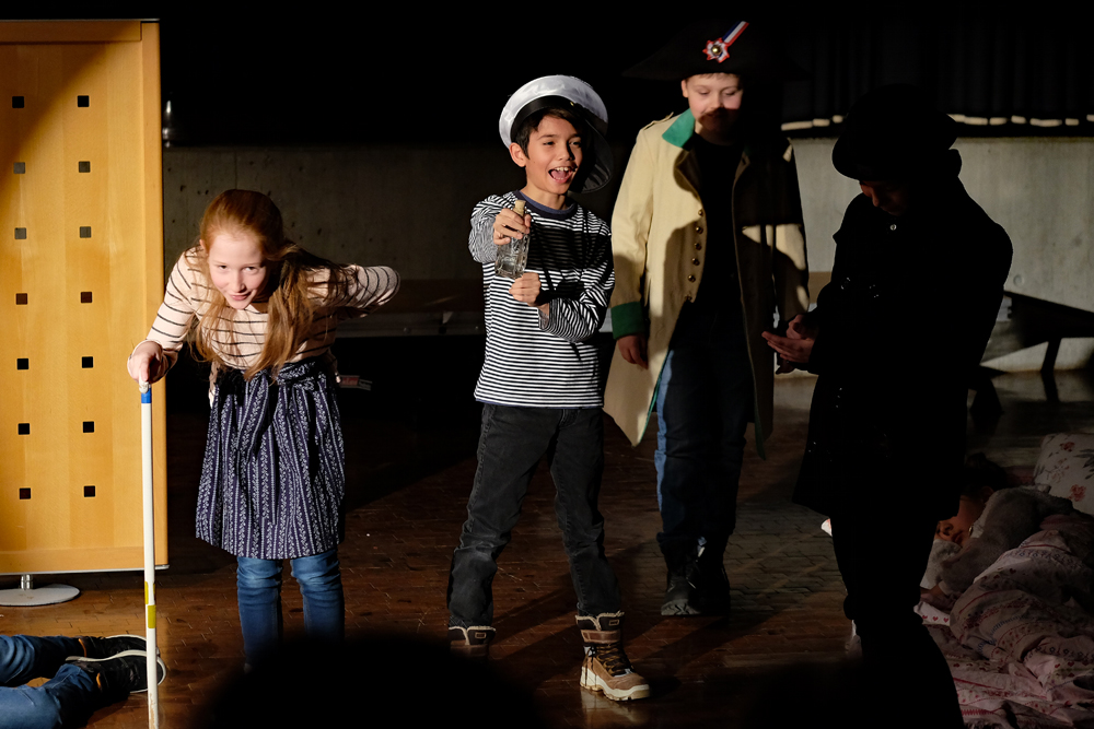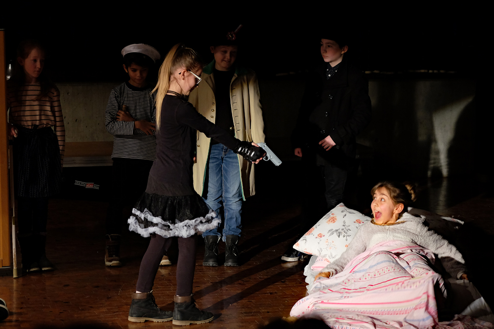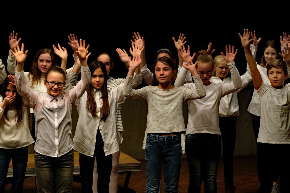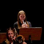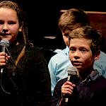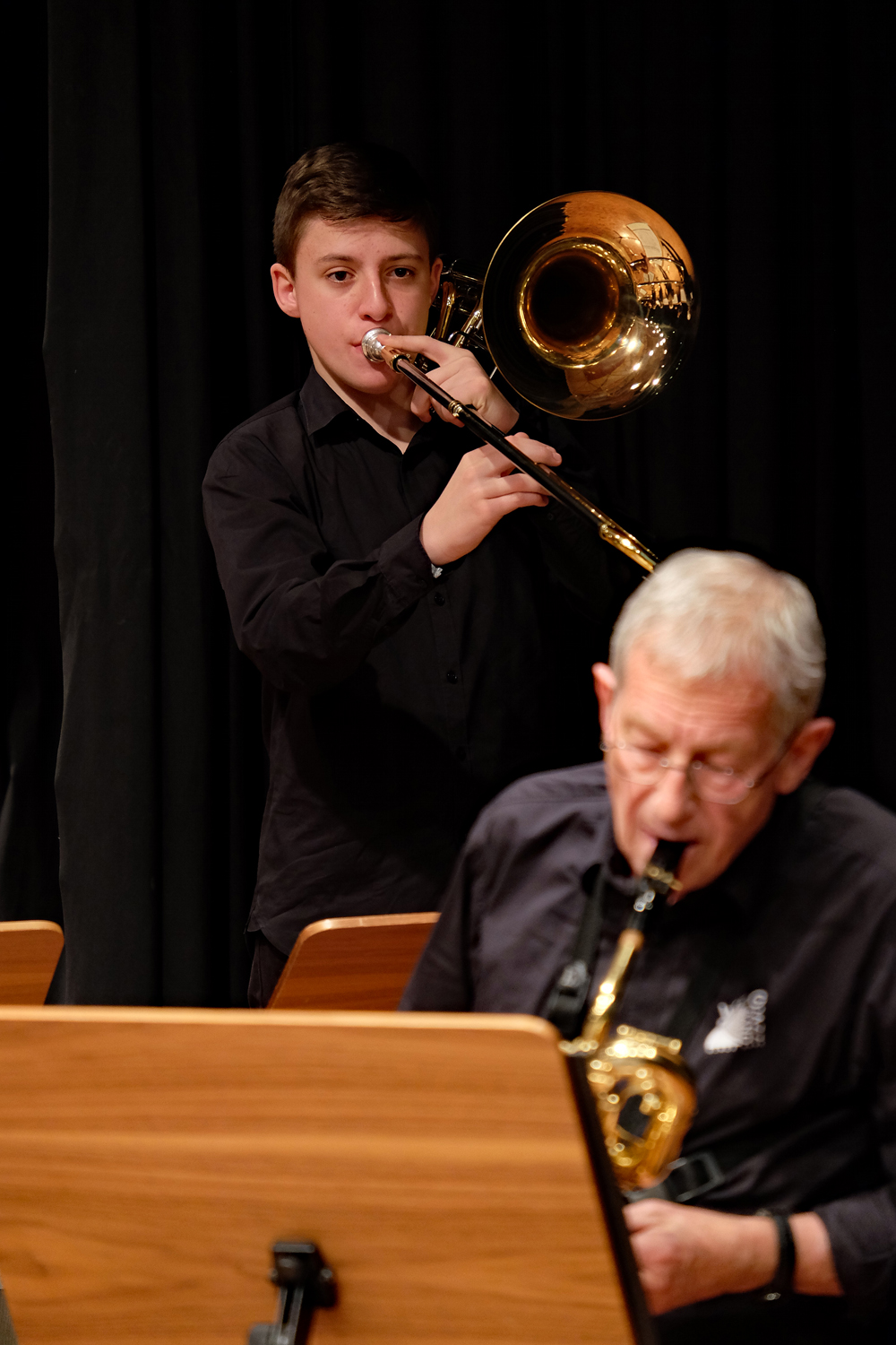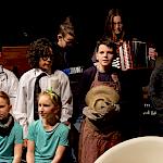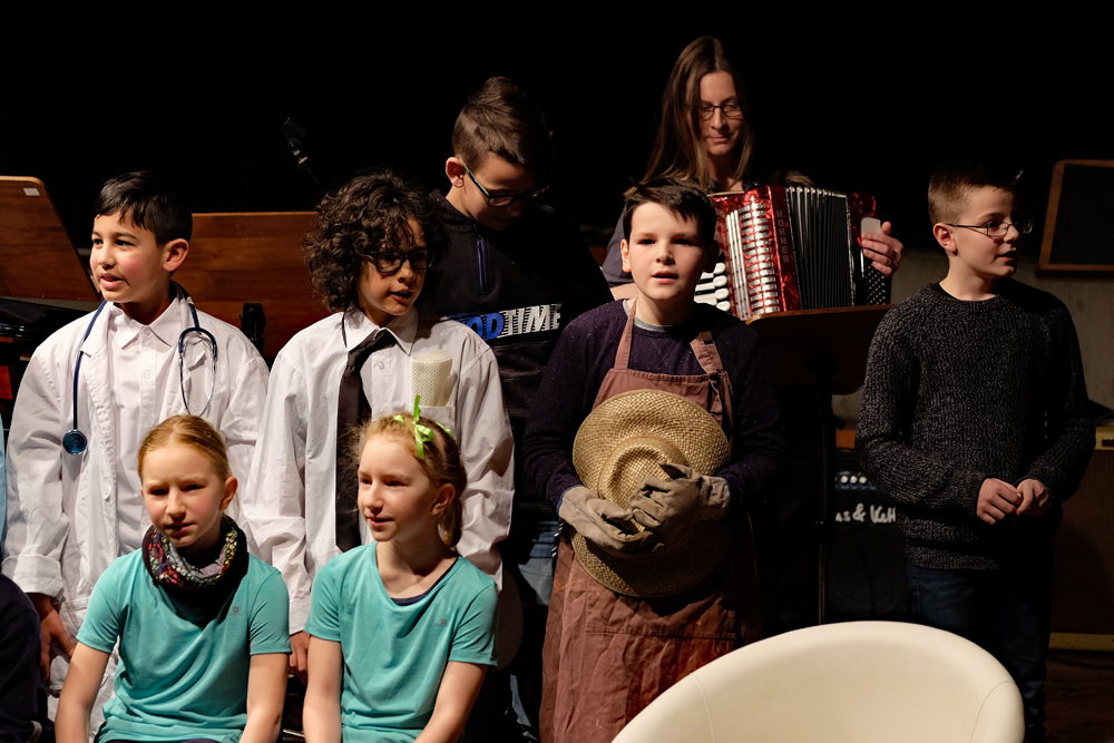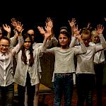 Nach der Pause überraschte die Klasse 5b mit einer szenischen Darstellung des Liedes „Der Mörder war immer der Gärtner“ mit Klassenlehrerin Antje Hoffmann am Akkordeon und Klavierbegleitung durch Tina Greulich. Danach brillierte Dina Tanzmann mit einem Solo-Auftritt. Mit kraftvollem, differenziertem Sound und den beiden Gesangssolistinnen Yamur Tanriverdi und Dina Tanzmann überzeugte die Jazzband von Joachim Kocsis u. a. mit Klassikern wie „Hit the road, Jack“, „Knock on wood“ oder „Tequila“.