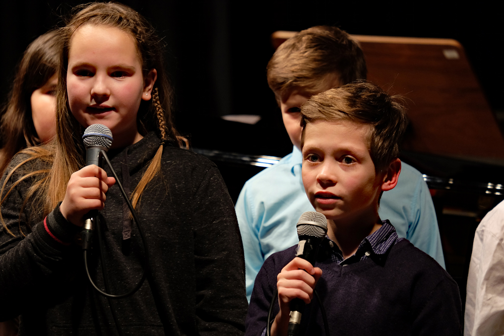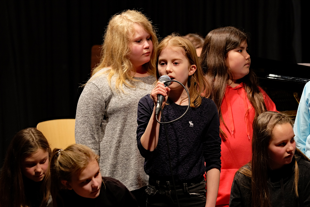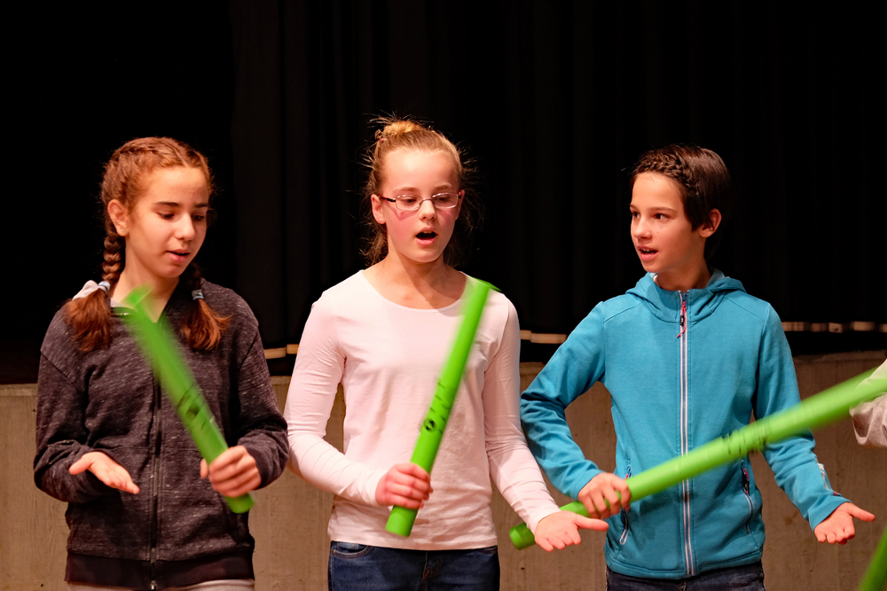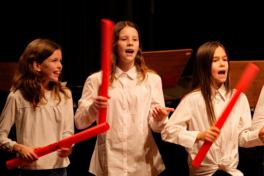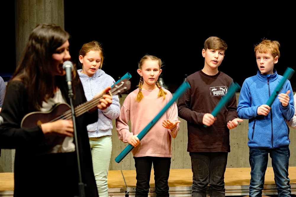 Den Auftakt des Neujahrskonzerts, das von Schülerinnen der 8. Klasse moderiert wurde, gestaltete der Unterstufenchor unter Leitung von Helga Weber mit einem breit gestreuten Repertoire, das unter anderem den berühmten Titel „I have a dream“ von ABBA enthielt. Im Anschluss trug die Klasse 5a, ausgestattet mit Boomwhackers, zusammen mit Sängerin und Klassenlehrerin Ricarda Rickert an der Ukulele "The Lion sleeps tonight“ vor.