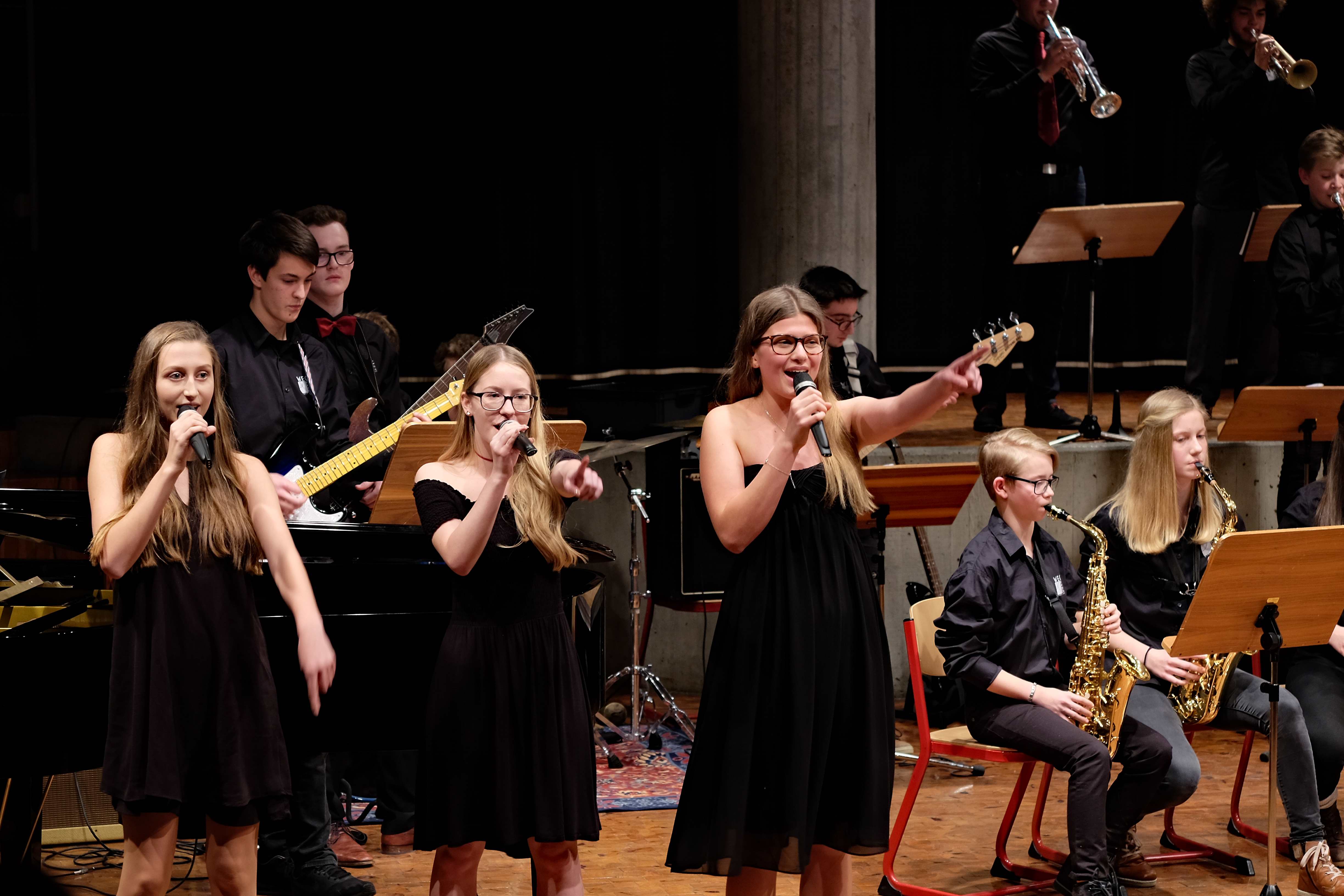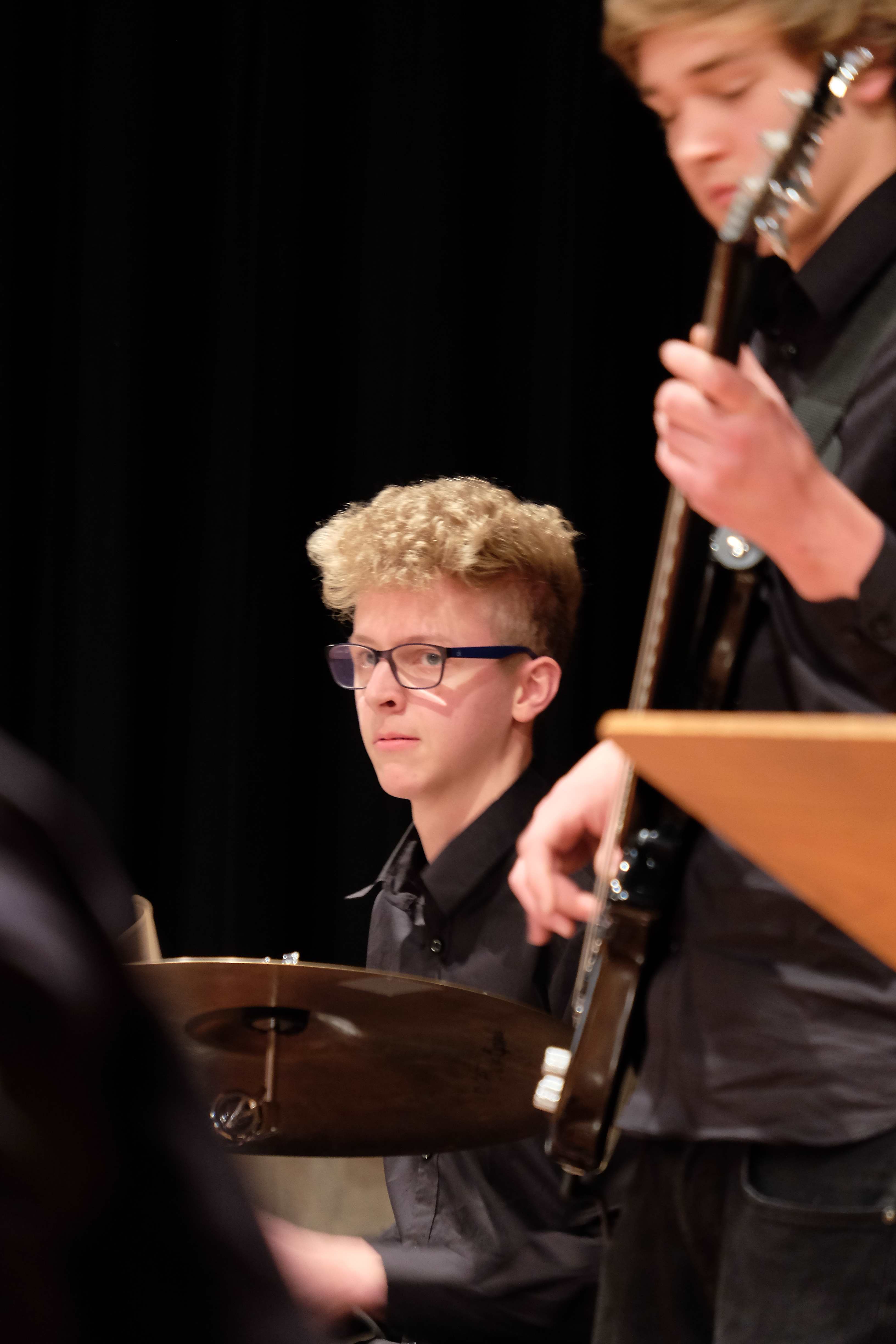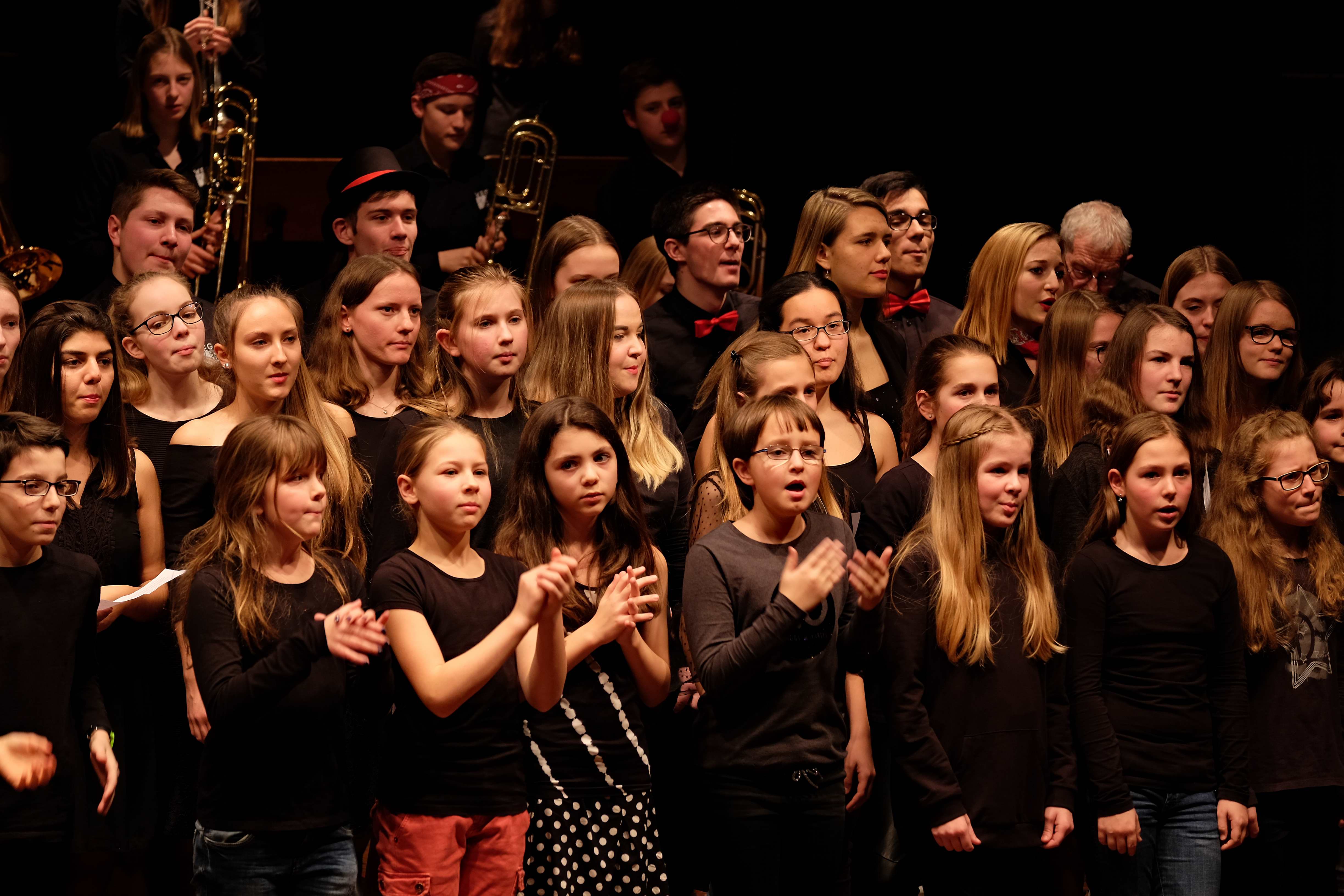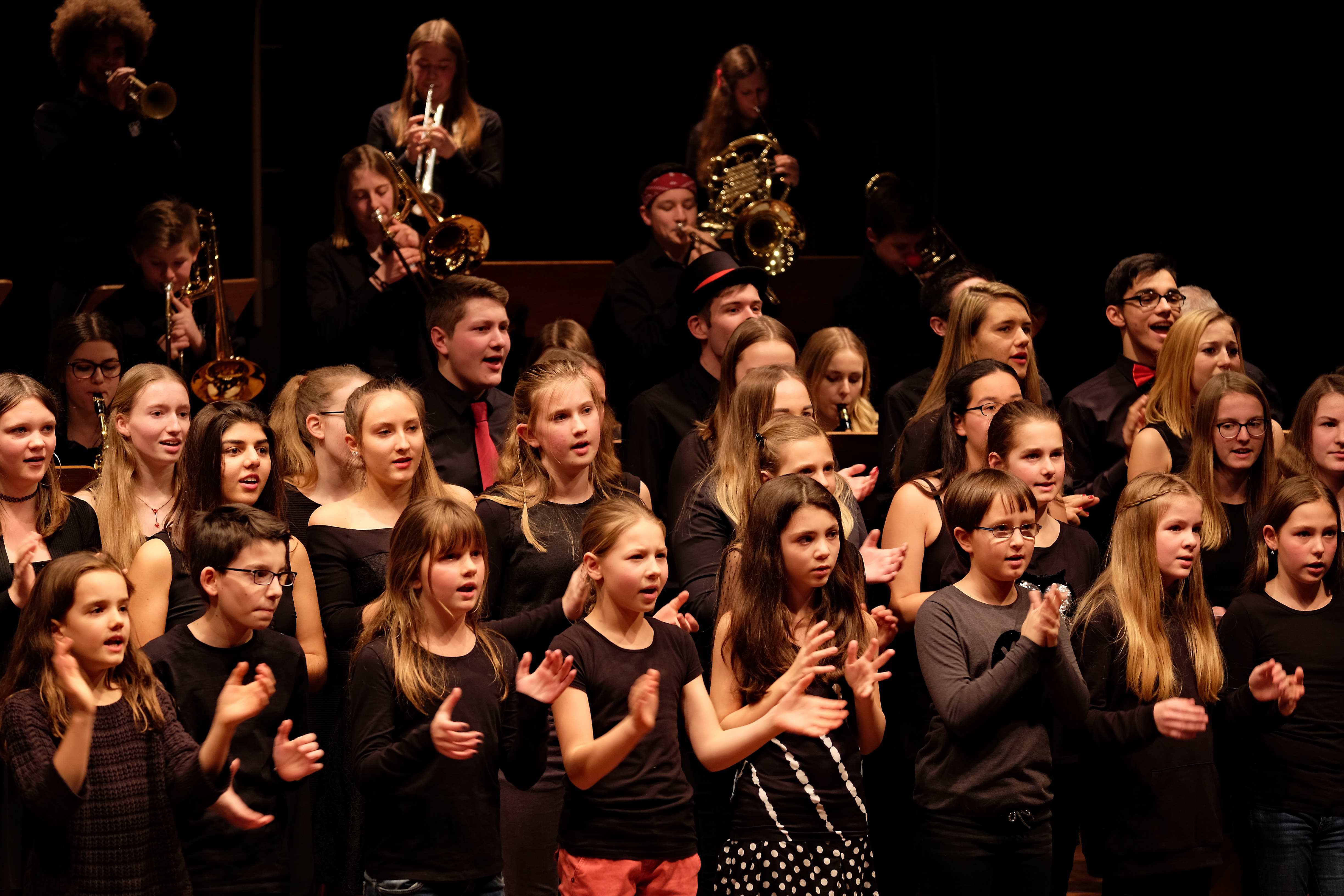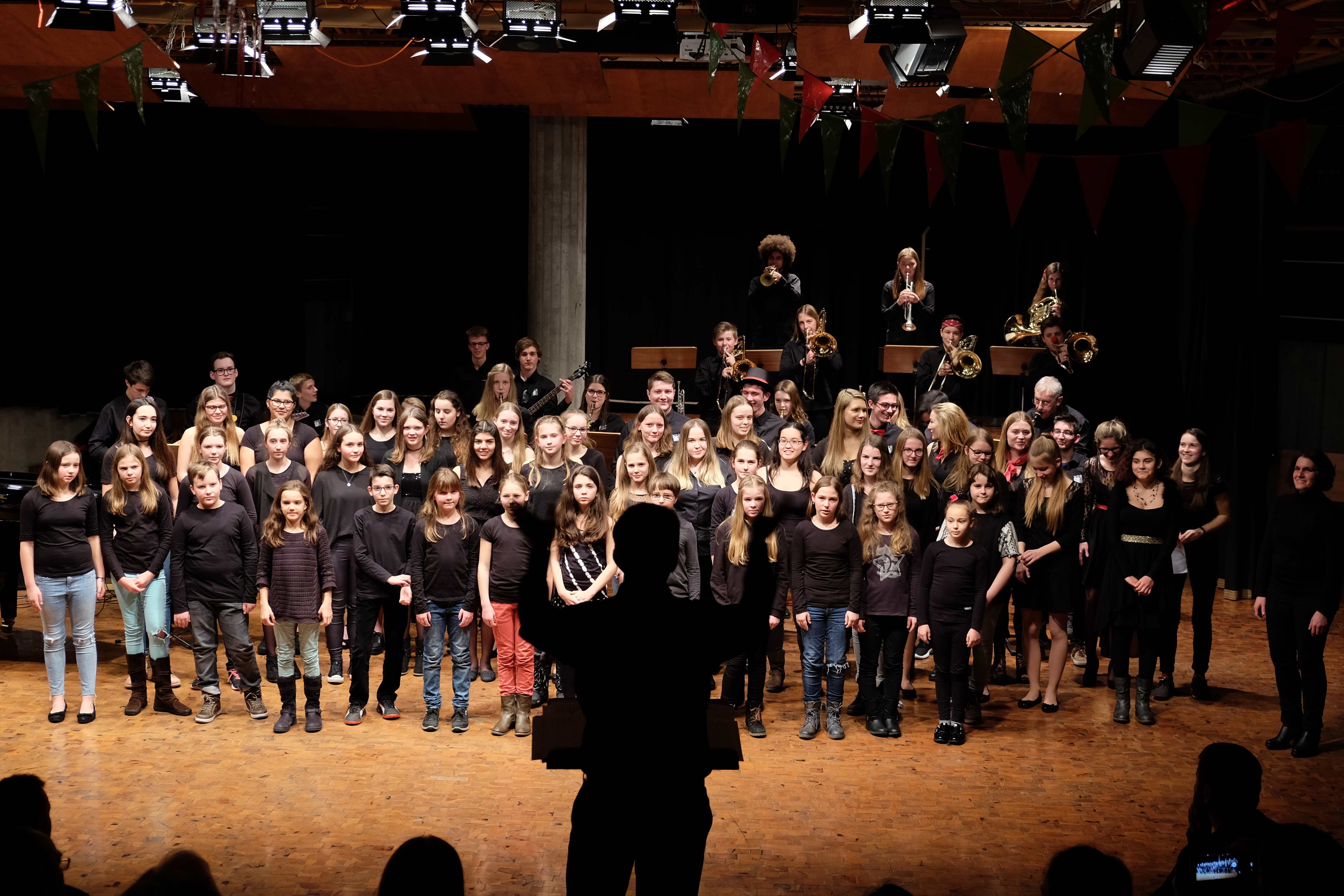 Im Anschluss trat der große Chor auf, der von Marvin Nagel aus der Jahrgangsstufe 2 gekonnt dirigiert und von Chorleiterin Julia Strasser am Klavier begleitet wurde. Das Programm ging quer durch die musikalischen Sparten: Es begann mit einem sehr schön gestalteten „Adiemus“ des walisischen Komponisten Karl Jenkins, es folgten Songs aus dem Musical „Tarzan“, dem Film „Fast and Furious 7“ sowie der besonders beeindruckende Gospelsong „This train“, bei dem der Chor den Gesang auch gestisch unterstützte. Immer wieder setzten auch Schülerinnen und Schüler mit souverän gesungenen Soli besondere Highlights.