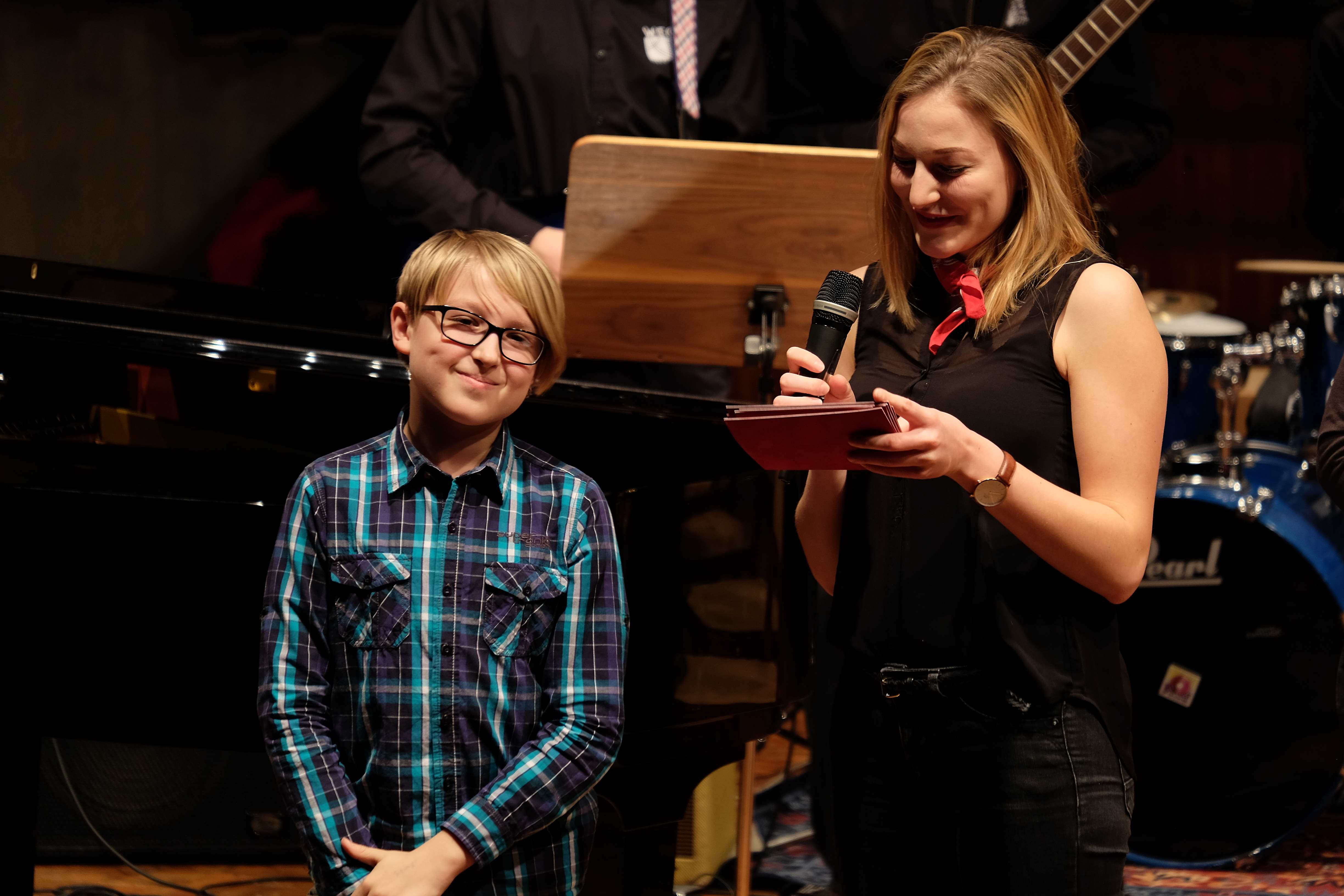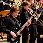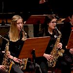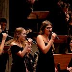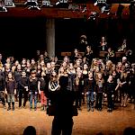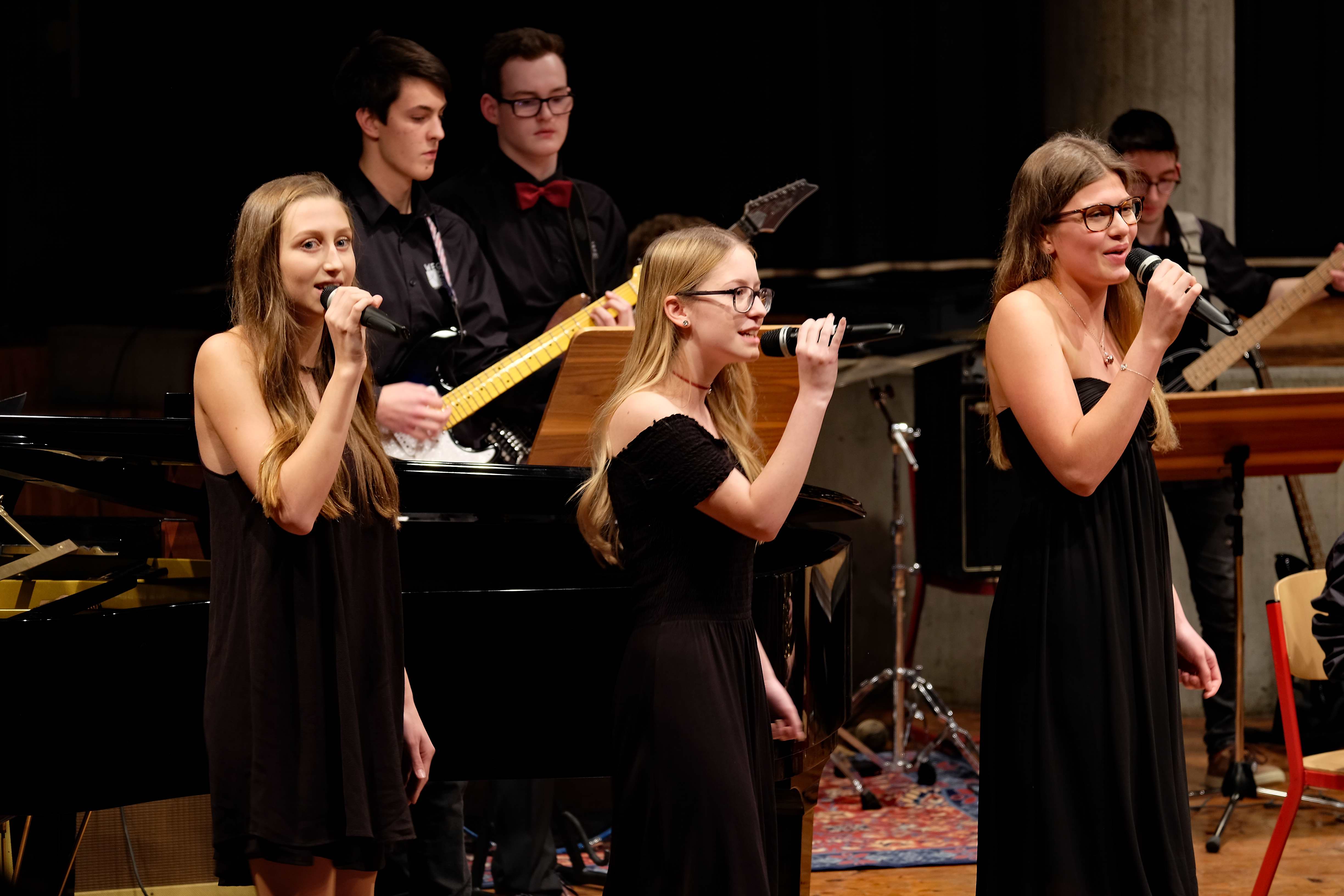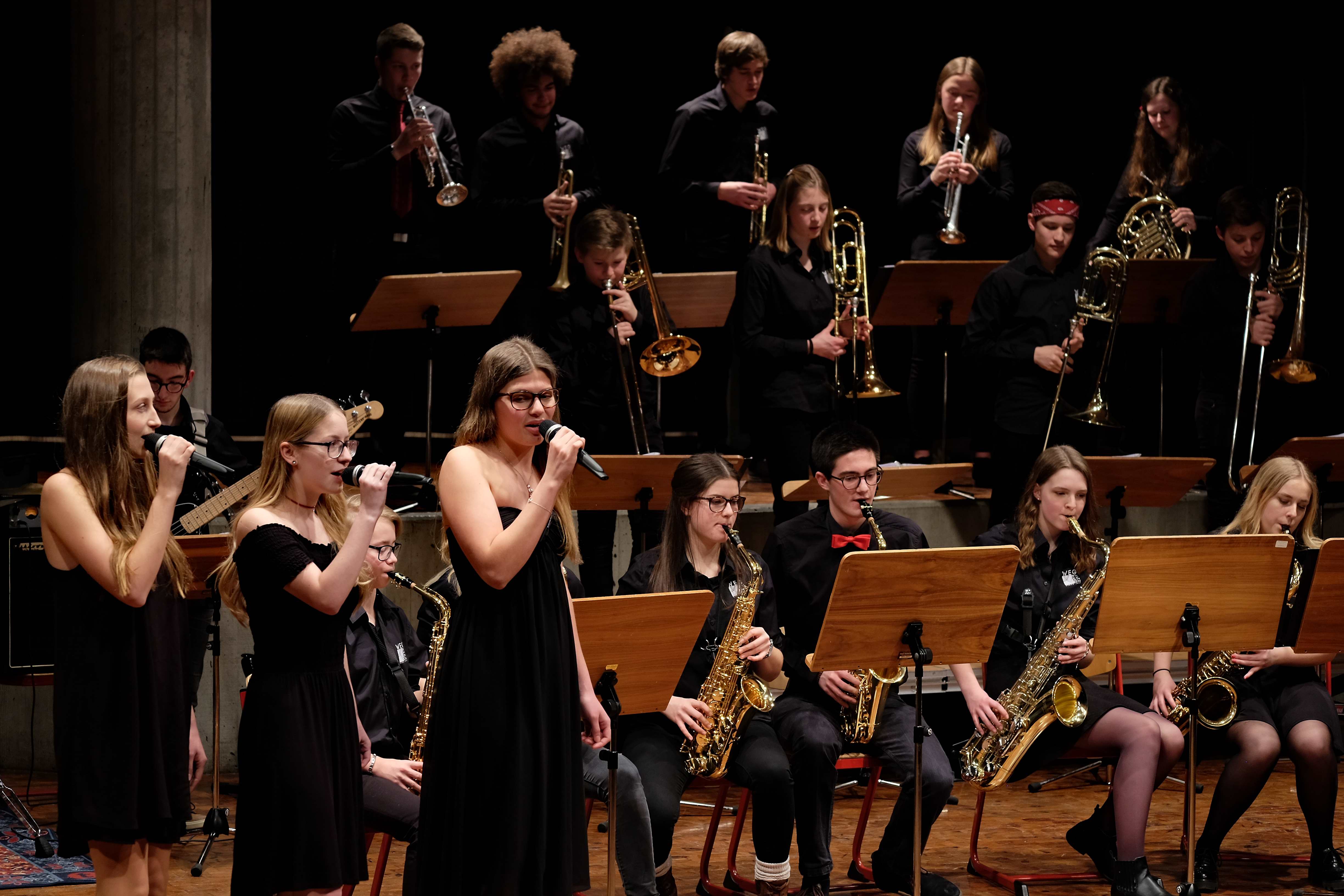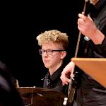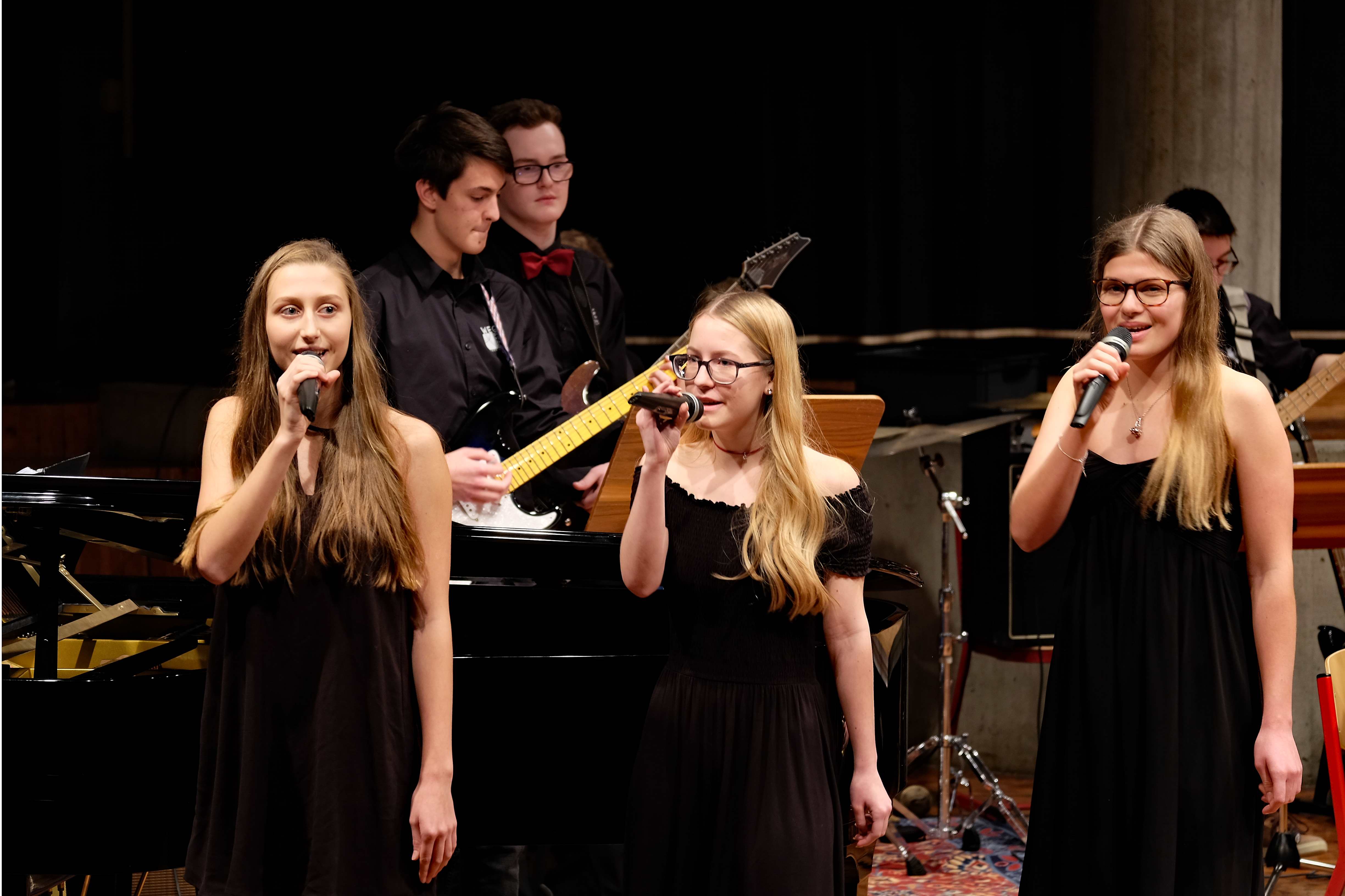 Im Anschluss trat der große Chor auf, der von Marvin Nagel aus der Jahrgangsstufe 2 gekonnt dirigiert und von Chorleiterin Julia Strasser am Klavier begleitet wurde. Das Programm ging quer durch die musikalischen Sparten: Es begann mit einem sehr schön gestalteten „Adiemus“ des walisischen Komponisten Karl Jenkins, es folgten Songs aus dem Musical „Tarzan“, dem Film „Fast and Furious 7“ sowie der besonders beeindruckende Gospelsong „This train“, bei dem der Chor den Gesang auch gestisch unterstützte. Immer wieder setzten auch Schülerinnen und Schüler mit souverän gesungenen Soli besondere Highlights.
