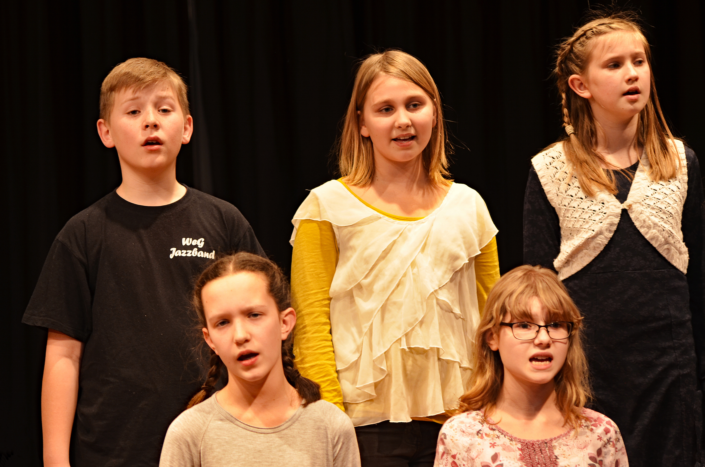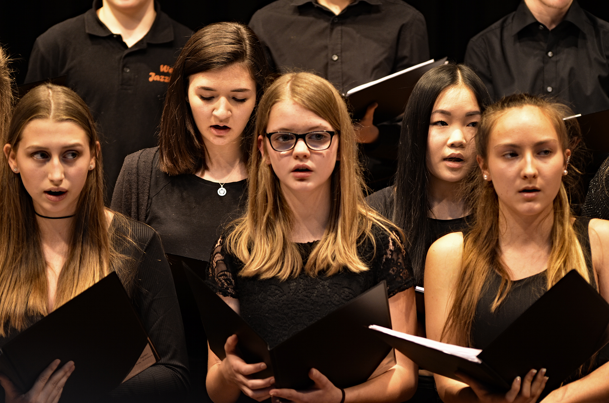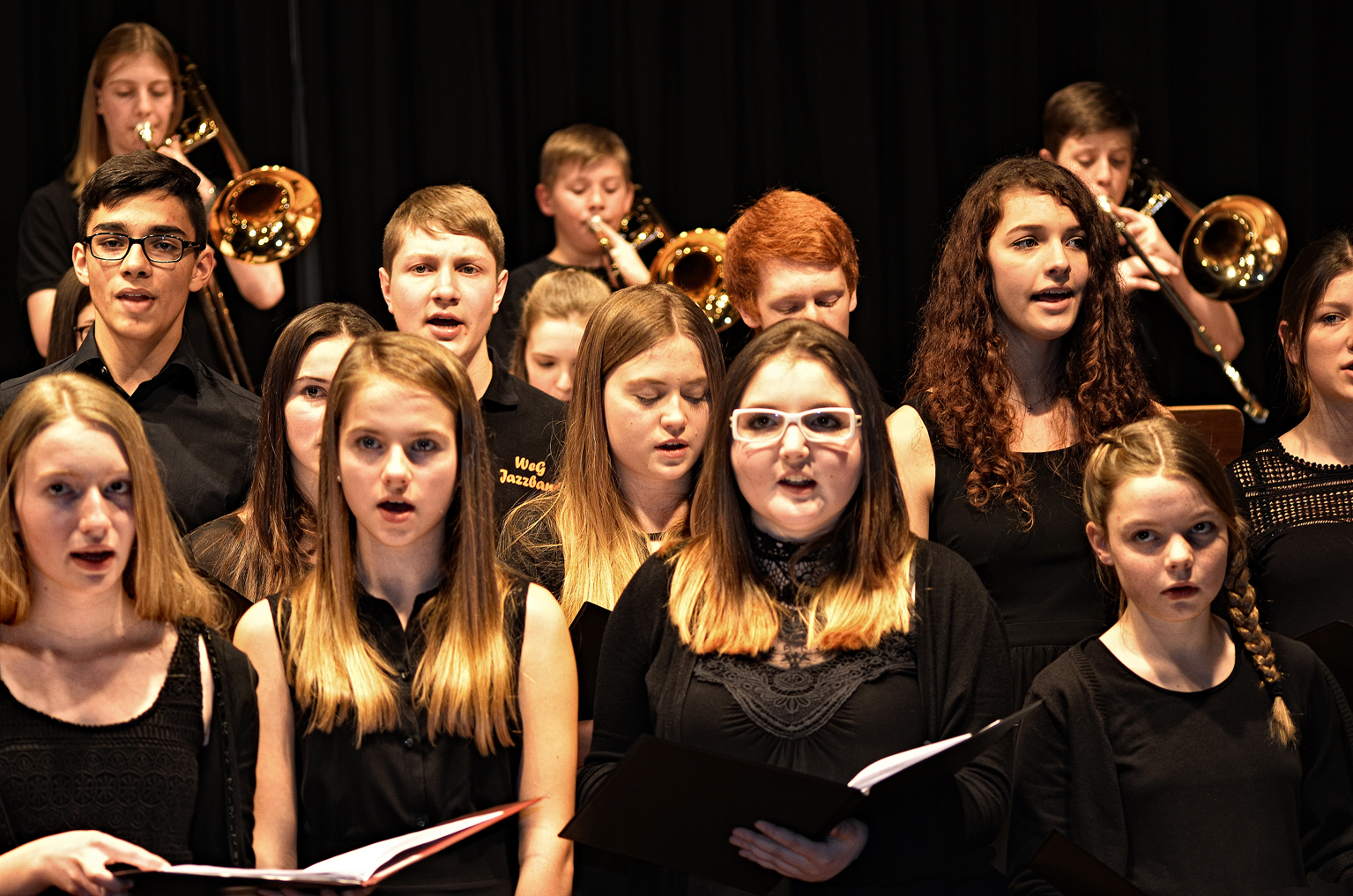 Der Unterstufenchor unter Leitung von Helga Weber eröffnete das Konzert mit drei Liedern, gefolgt von der Jazzband des WeG unter der Leitung von Joachim Kocsis, die bekannte Jazzstücke wie „Pennsylvania 6-5000“ mit Telefonklingel und Kazoo präsentierte. Noch internationaler wurde es dann mit dem Auftritt des großen Chors, dirigiert von Julia Strasser, mit Stücken auf Französisch, Englisch und „Baba Yetu“, einem Vaterunser auf Suaheli. Am Schluss des Programms erwartete das Publikum in der Kulturmulde des WeG noch eine echte Premiere: Die Jazzband spielte zum ersten Mal überhaupt die Titelmelodie „Mission Impossible“ aus den gleichnamigen Filmen.