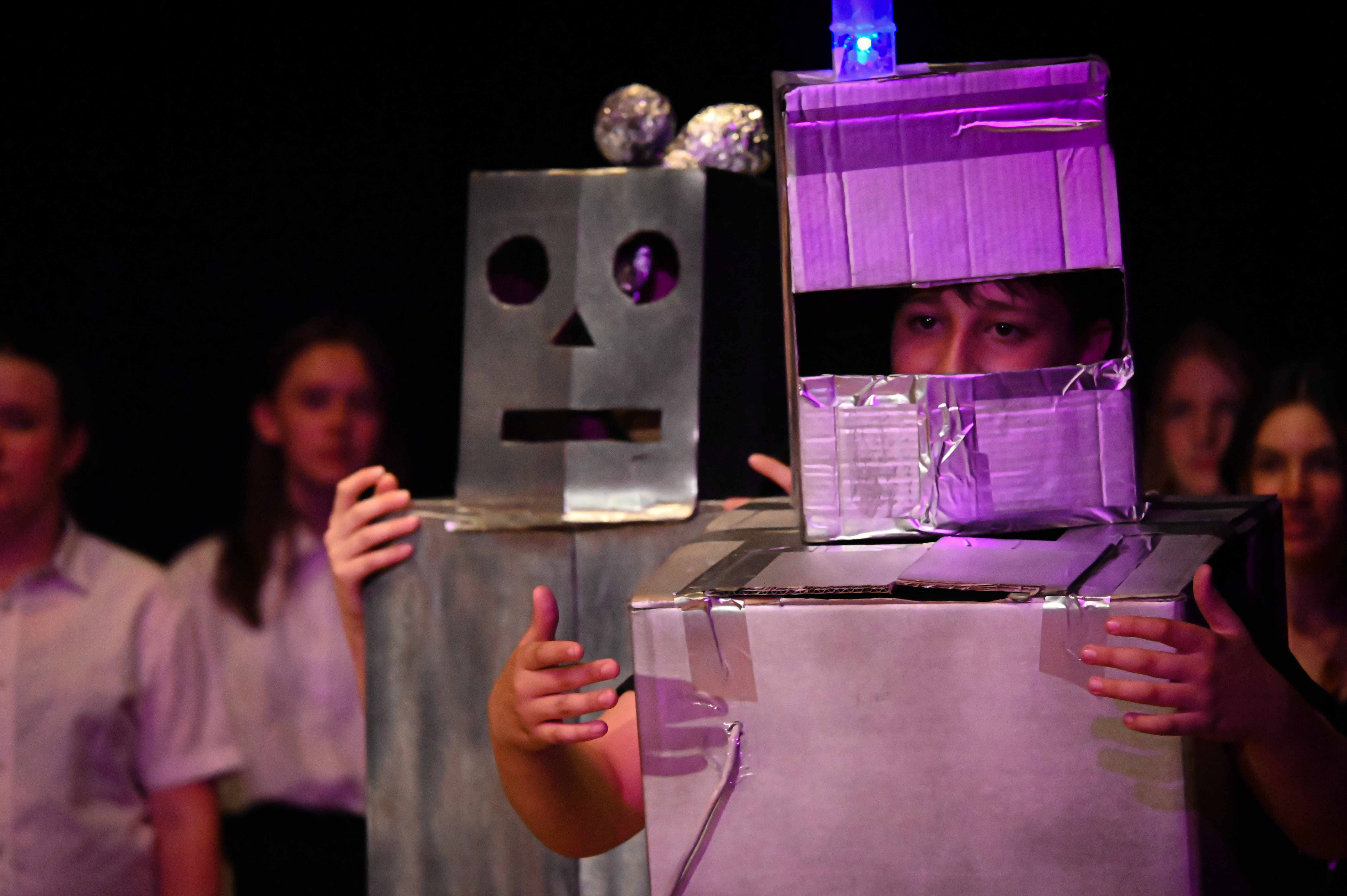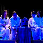 In der nächsten Szene fanden sich die Zuschauer wieder zurück auf der Erde in Janes Indianercafé, wo die traurige, nicht mitgereiste Freundin Lisa zusammen mit Jane und dem Chor musikalisch erklärten, dass „Wünsche nur im Märchen“ beim dritten Mal erfüllt werden. Aber sie endeten mit der Zeile „auch im Leben liegst du manchmal daneben und ein anderes Mal wird dir alles gegeben“. Plötzlich kamen die vier Weltraum-Scooter-Reisenden herein und sie feierten ihr Wiedersehen mit dem mitreißenden Song „Wunschlos glücklich“. Man merkte, wie die Anspannung von allen Akteuren abfiel und alle Siebtklässler begeistert mitsangen. Die Melodie begleitete sicher den ein oder anderen Zuschauer noch eine Weile als Ohrwurm.
