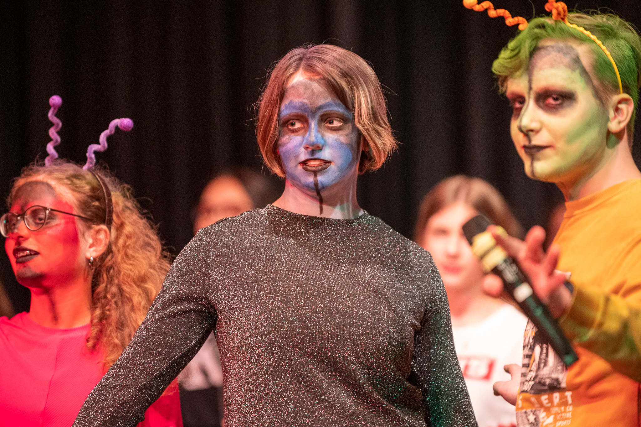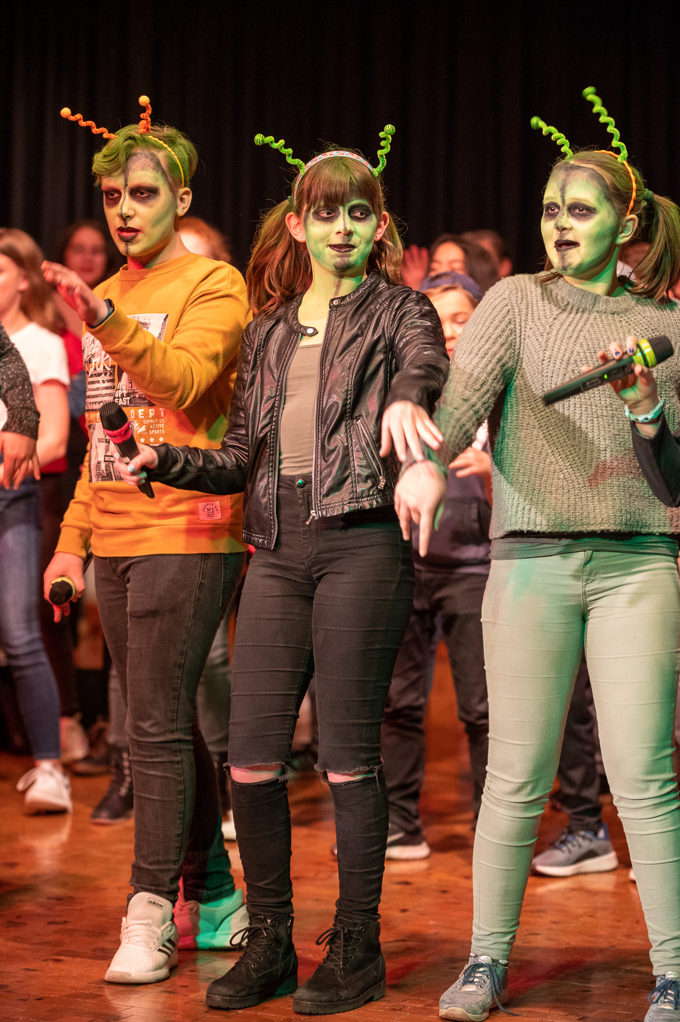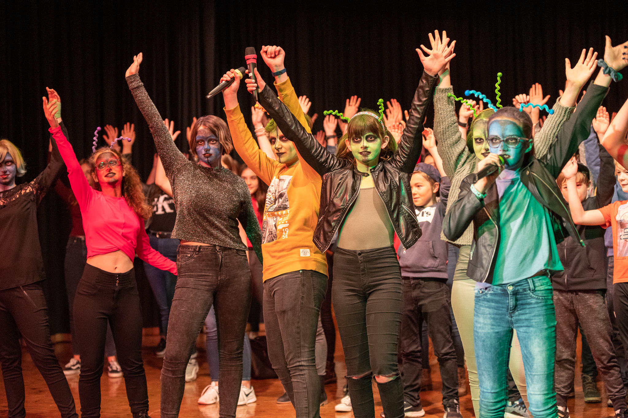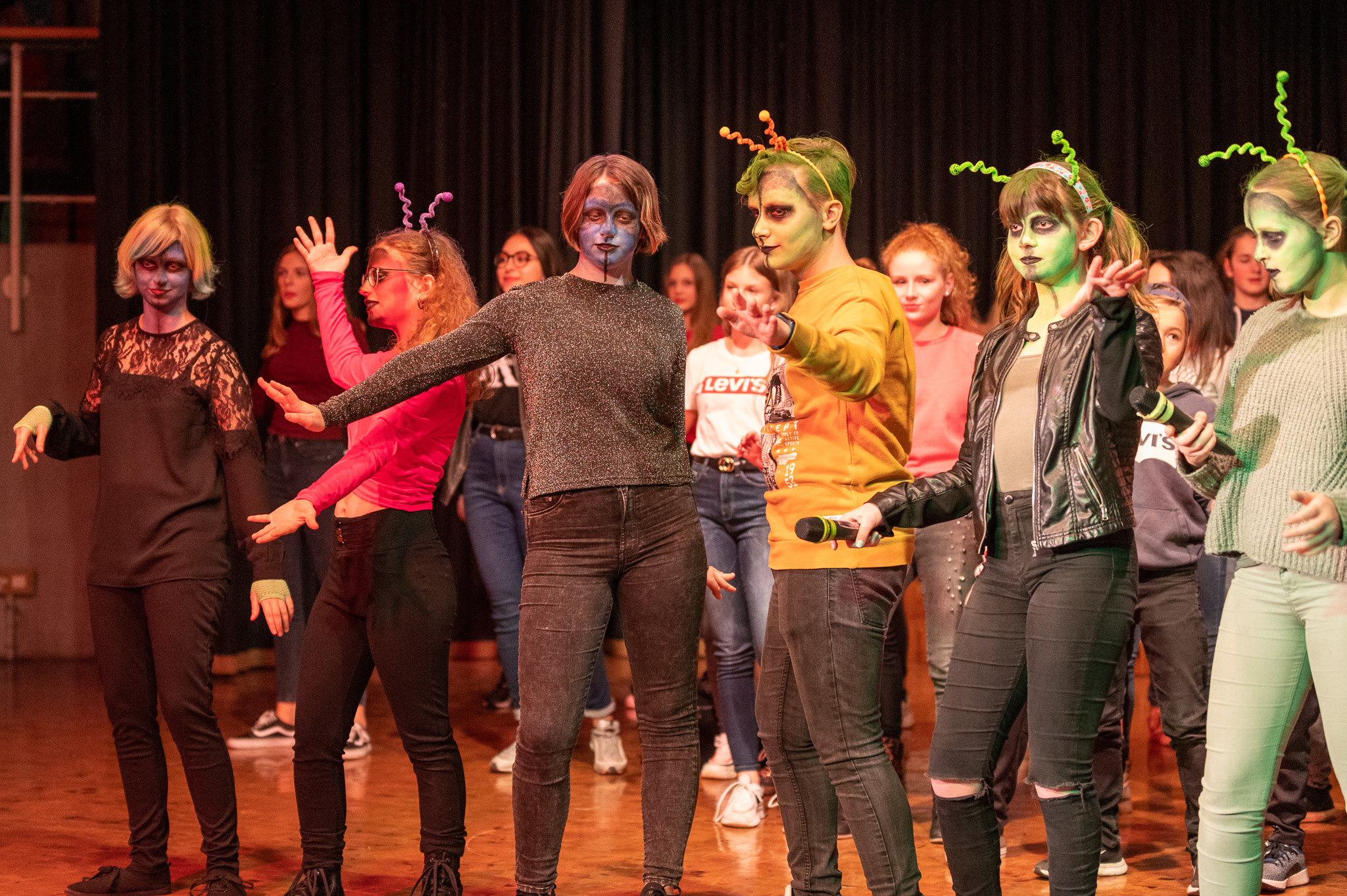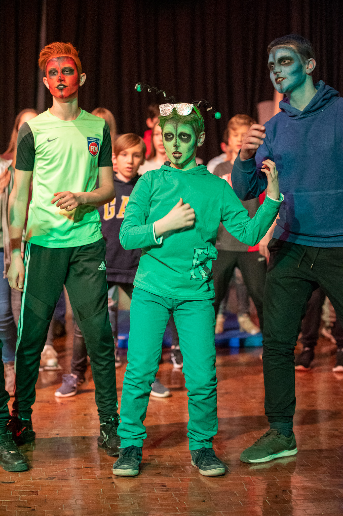 Eine Geschichte hat immer zwei Gesichter. Es kommt jedoch selten vor, dass das so wörtlich gemeint ist wie in der Poolaufführung, die unsere siebten Klassen am 14. Februar in der Kulturmulde unter der Leitung von Frau Strasser, Frau Weber, Frau Greulich und Herrn Kocsis präsentierten. In dem Musical zeigt uns die Hauptfigur Luna ihr zweites Gesicht als Alienmädchen Alienne. Als Luna noch von der Clique der Supercoolen der Schule angefeindet, entwickelt sie sich als Alienne zum absoluten Star. Dabei überzeugte uns besonders die Hauptdarstellerin Pauline ebenso wie die provokant zickig dargestellten „Supercoolen“, angeführt von Emily. In die Geschichte hineingezogen haben uns jedoch nicht nur die Darsteller und die Songs, die meist von einem Chor aus Kindern aller siebten Klassen begleitet wurden, sondern auch das Make—up von einem anderen Stern, das Adel auf die Gesichter der Aliens „beamte“. Nicht zu vergessen ist auch die musikalische Untermalung durch die Band, die durch Peter aus der JG12 tatkräftig unterstützt wurde.