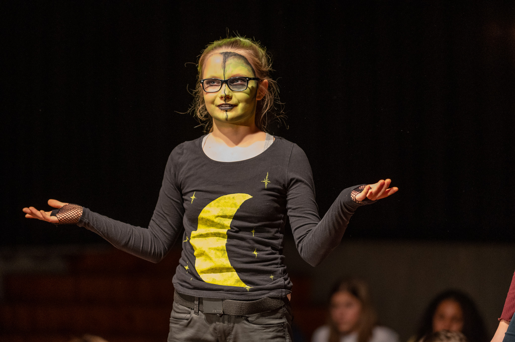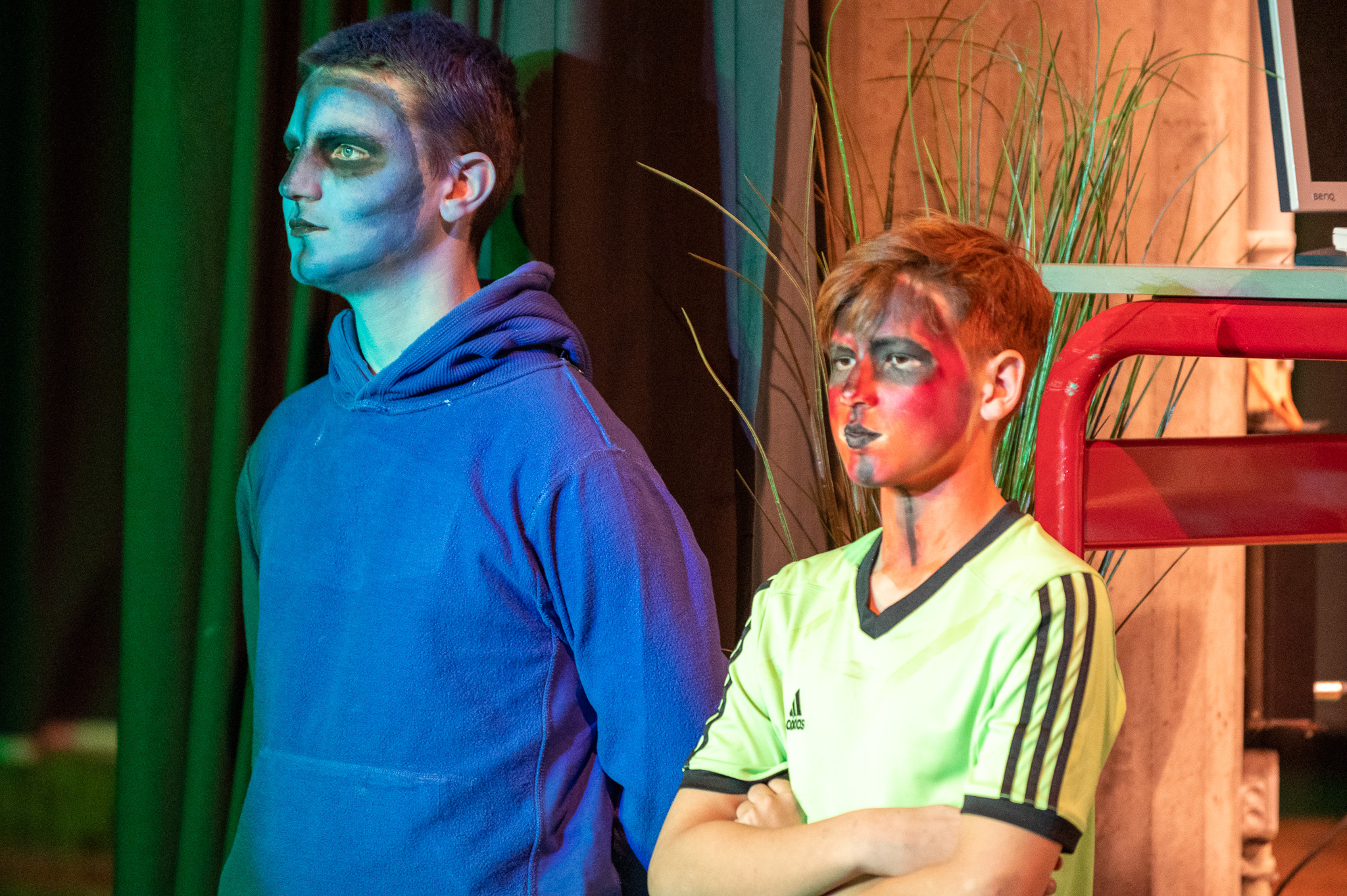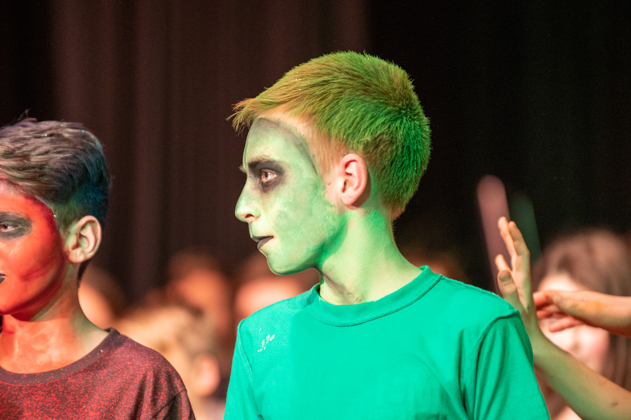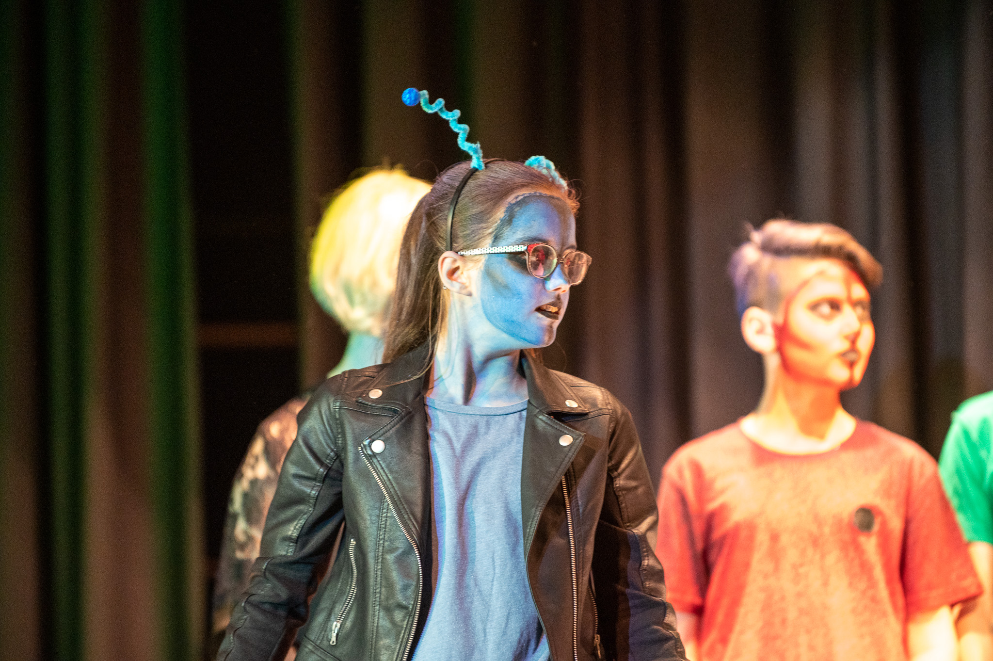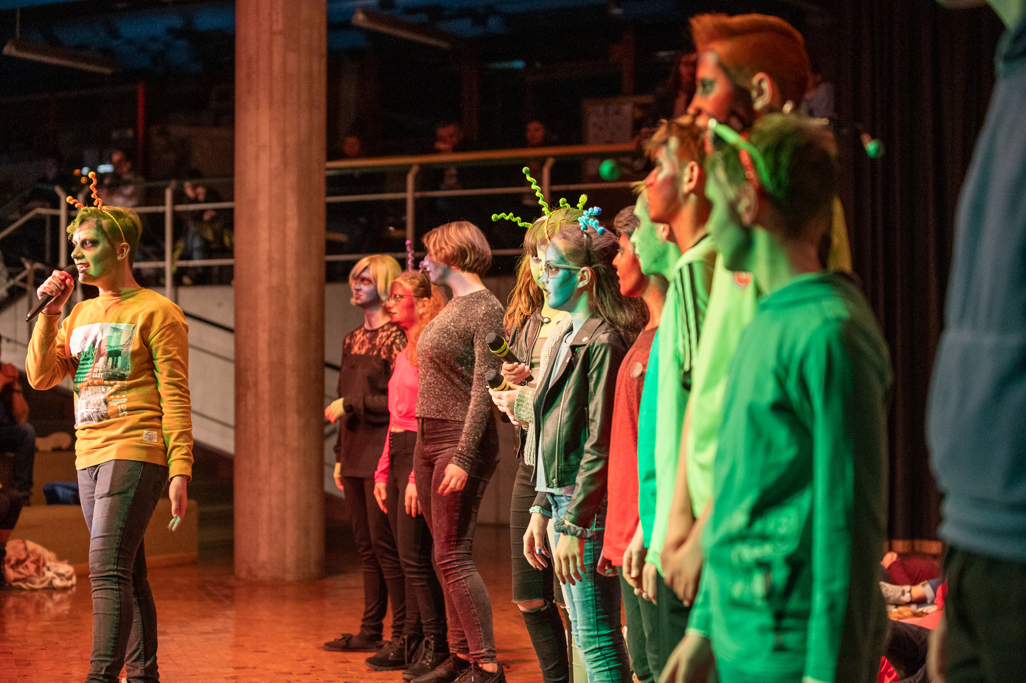 Eine Geschichte hat immer zwei Gesichter. Es kommt jedoch selten vor, dass das so wörtlich gemeint ist wie in der Poolaufführung, die unsere siebten Klassen am 14. Februar in der Kulturmulde unter der Leitung von Frau Strasser, Frau Weber, Frau Greulich und Herrn Kocsis präsentierten. In dem Musical zeigt uns die Hauptfigur Luna ihr zweites Gesicht als Alienmädchen Alienne. Als Luna noch von der Clique der Supercoolen der Schule angefeindet, entwickelt sie sich als Alienne zum absoluten Star. Dabei überzeugte uns besonders die Hauptdarstellerin Pauline ebenso wie die provokant zickig dargestellten „Supercoolen“, angeführt von Emily. In die Geschichte hineingezogen haben uns jedoch nicht nur die Darsteller und die Songs, die meist von einem Chor aus Kindern aller siebten Klassen begleitet wurden, sondern auch das Make—up von einem anderen Stern, das Adel auf die Gesichter der Aliens „beamte“. Nicht zu vergessen ist auch die musikalische Untermalung durch die Band, die durch Peter aus der JG12 tatkräftig unterstützt wurde.