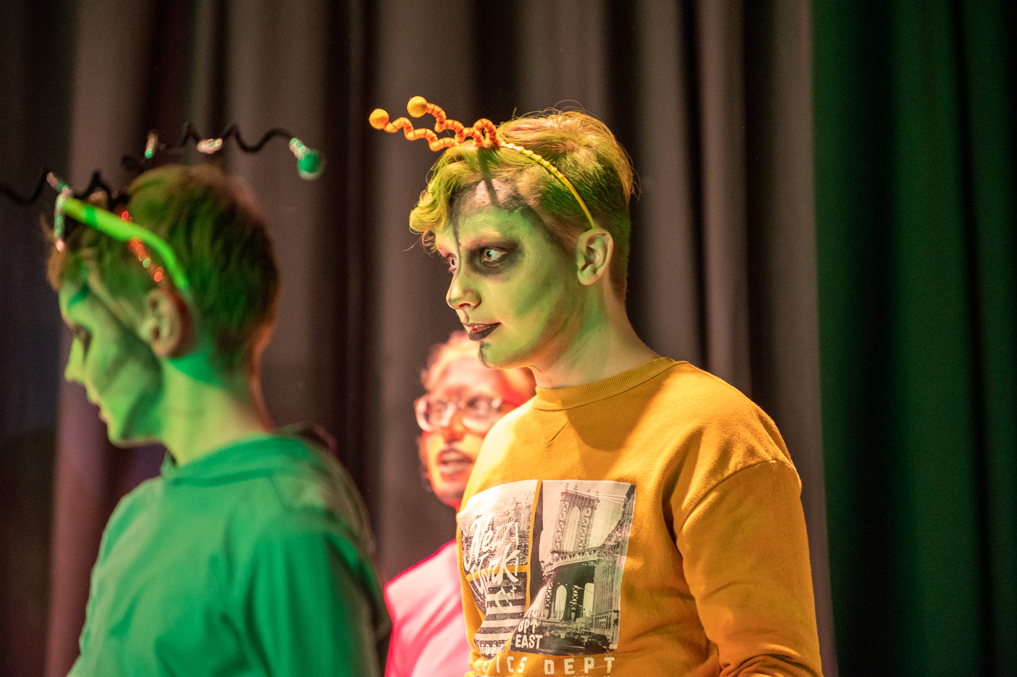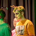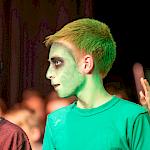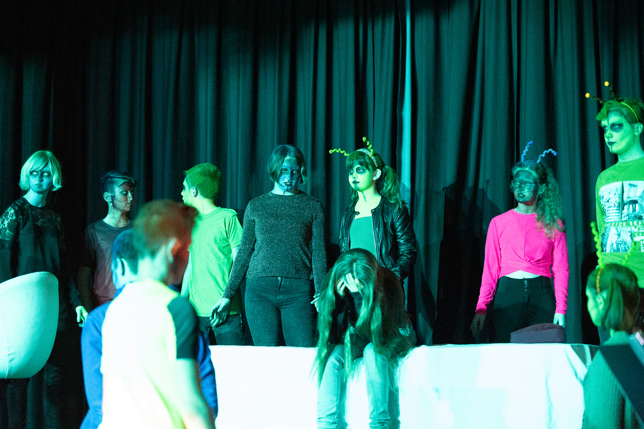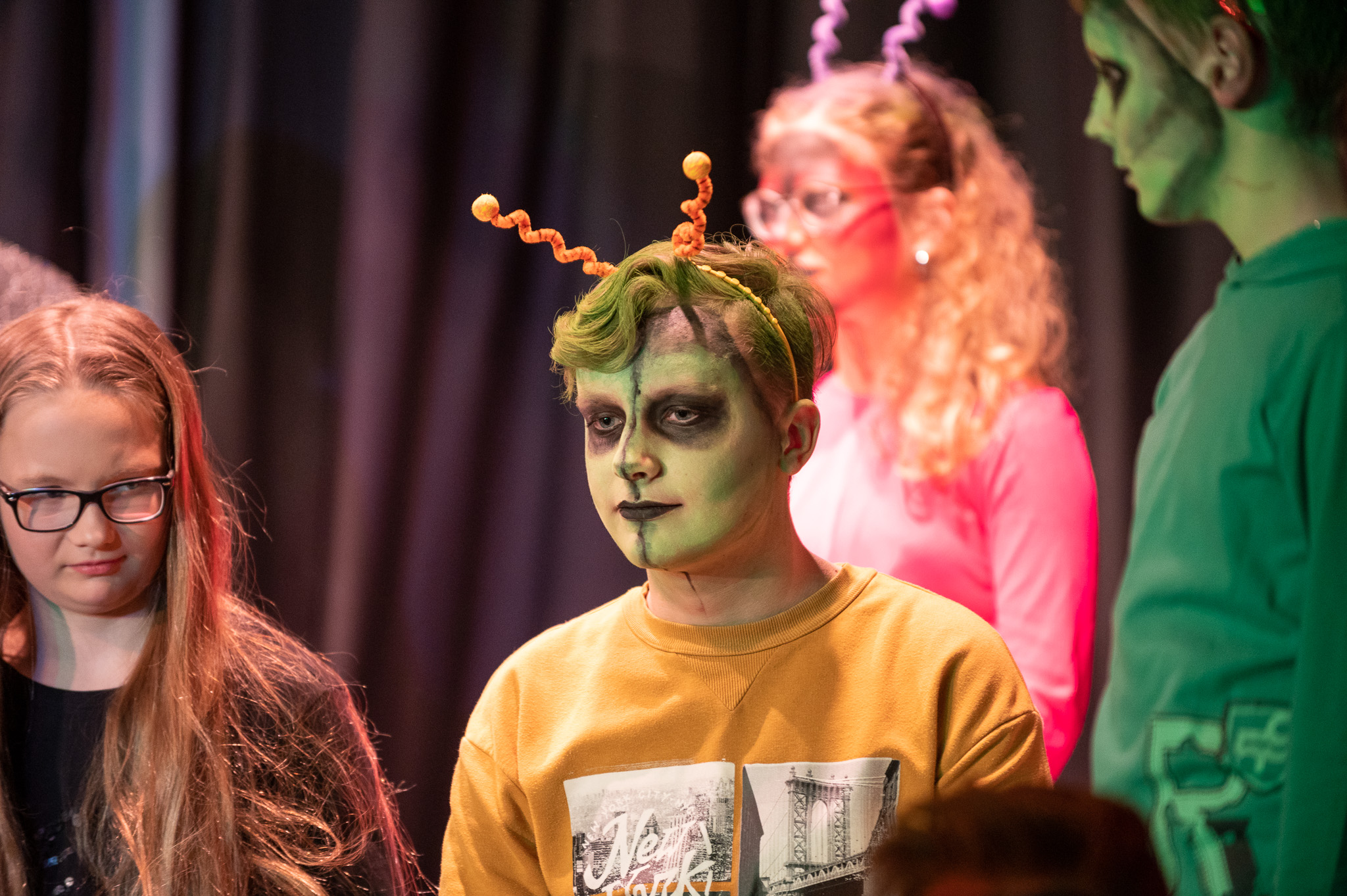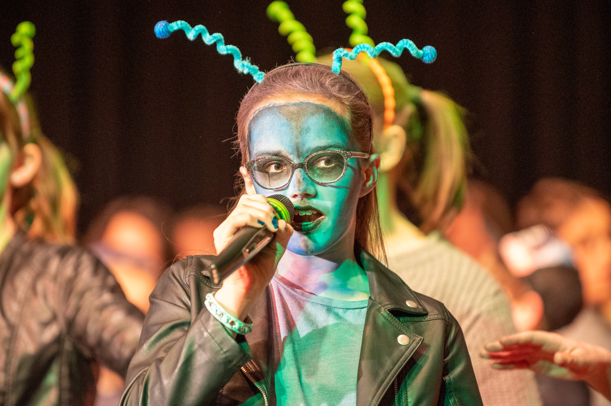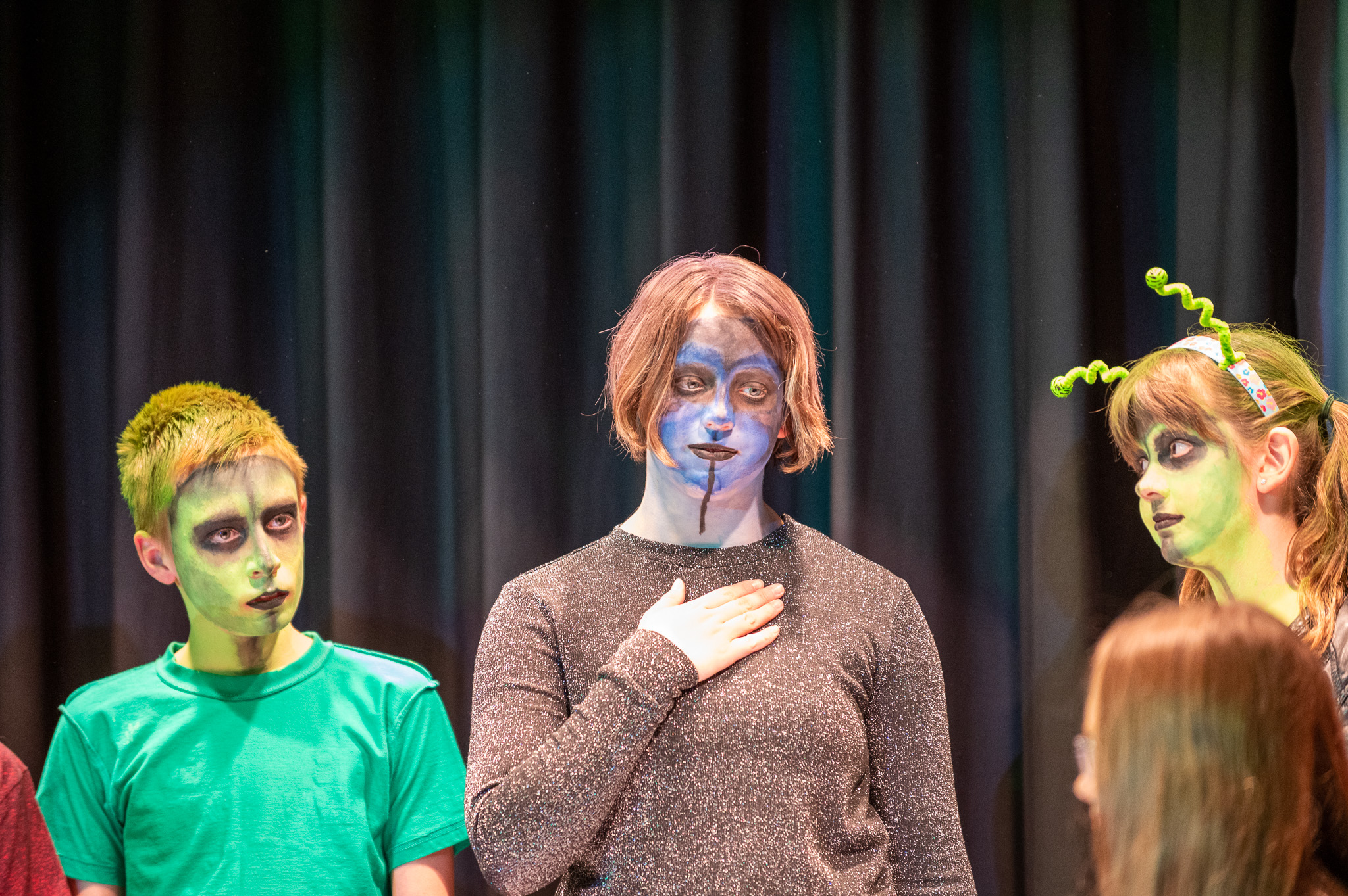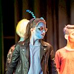 Eine Geschichte hat immer zwei Gesichter. Es kommt jedoch selten vor, dass das so wörtlich gemeint ist wie in der Poolaufführung, die unsere siebten Klassen am 14. Februar in der Kulturmulde unter der Leitung von Frau Strasser, Frau Weber, Frau Greulich und Herrn Kocsis präsentierten. In dem Musical zeigt uns die Hauptfigur Luna ihr zweites Gesicht als Alienmädchen Alienne. Als Luna noch von der Clique der Supercoolen der Schule angefeindet, entwickelt sie sich als Alienne zum absoluten Star. Dabei überzeugte uns besonders die Hauptdarstellerin Pauline ebenso wie die provokant zickig dargestellten „Supercoolen“, angeführt von Emily. In die Geschichte hineingezogen haben uns jedoch nicht nur die Darsteller und die Songs, die meist von einem Chor aus Kindern aller siebten Klassen begleitet wurden, sondern auch das Make—up von einem anderen Stern, das Adel auf die Gesichter der Aliens „beamte“. Nicht zu vergessen ist auch die musikalische Untermalung durch die Band, die durch Peter aus der JG12 tatkräftig unterstützt wurde.