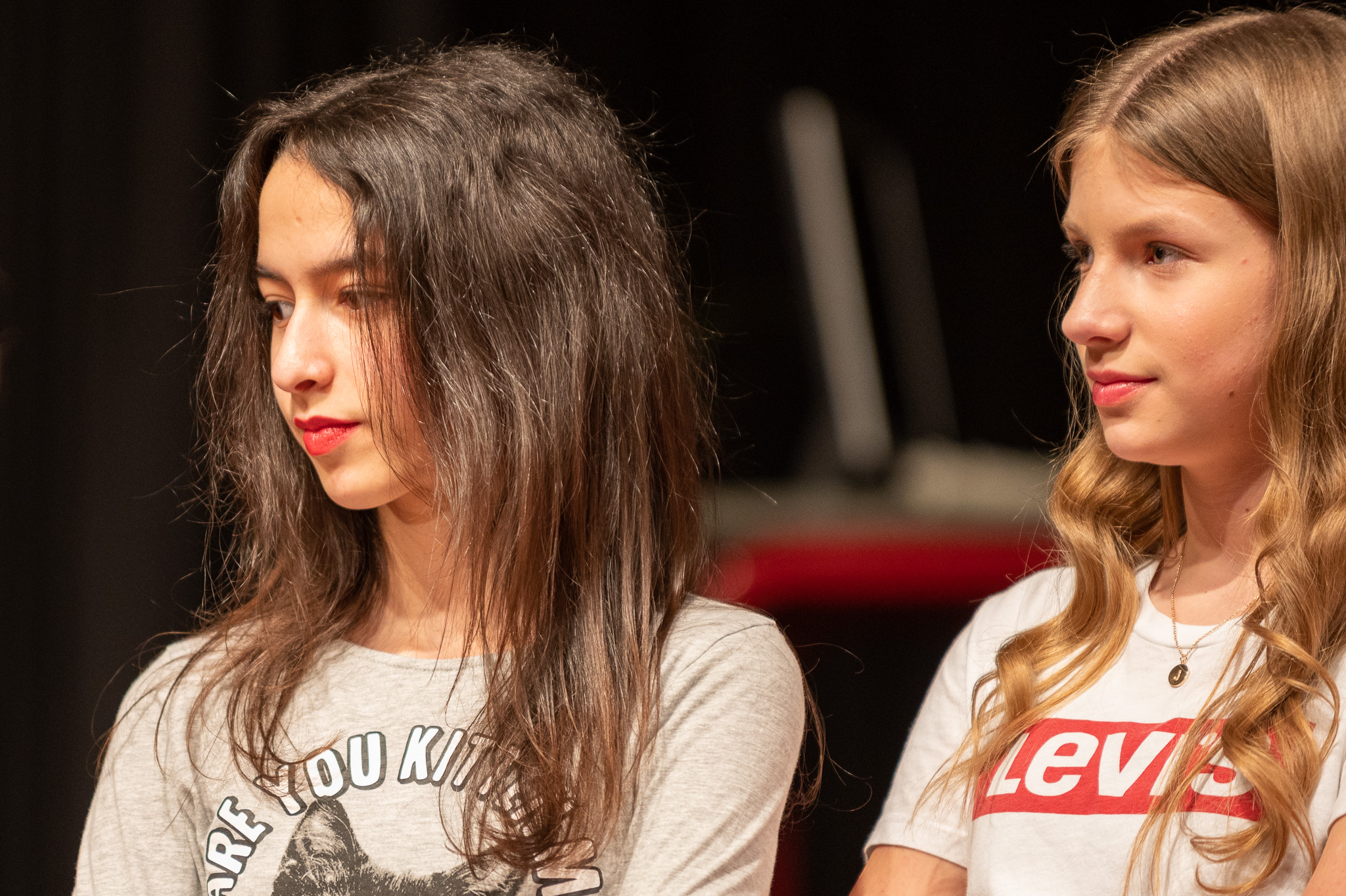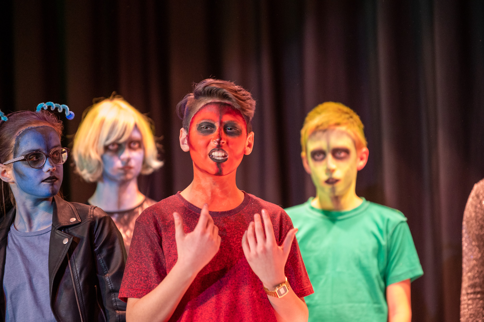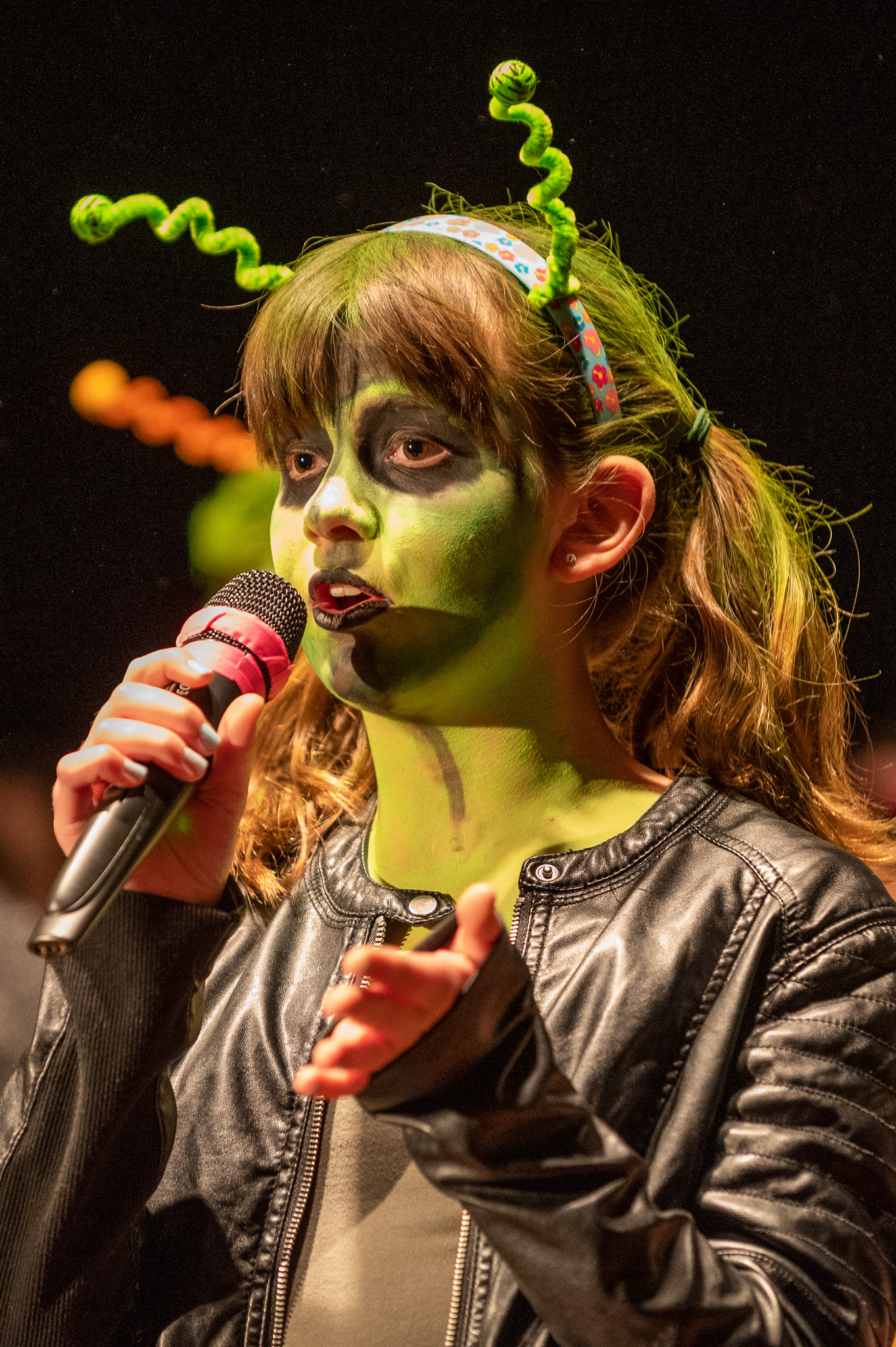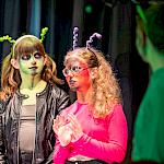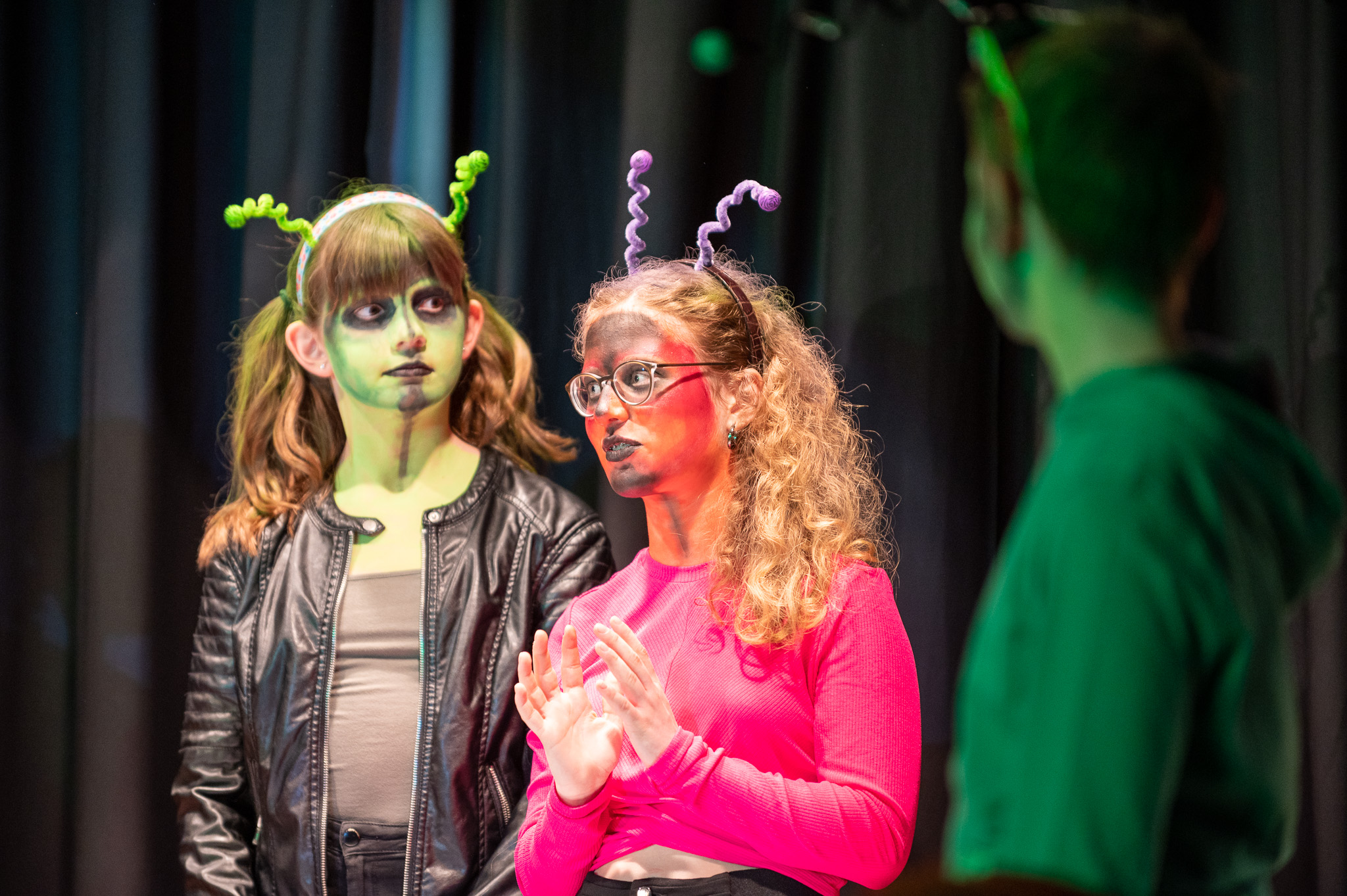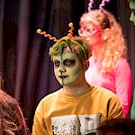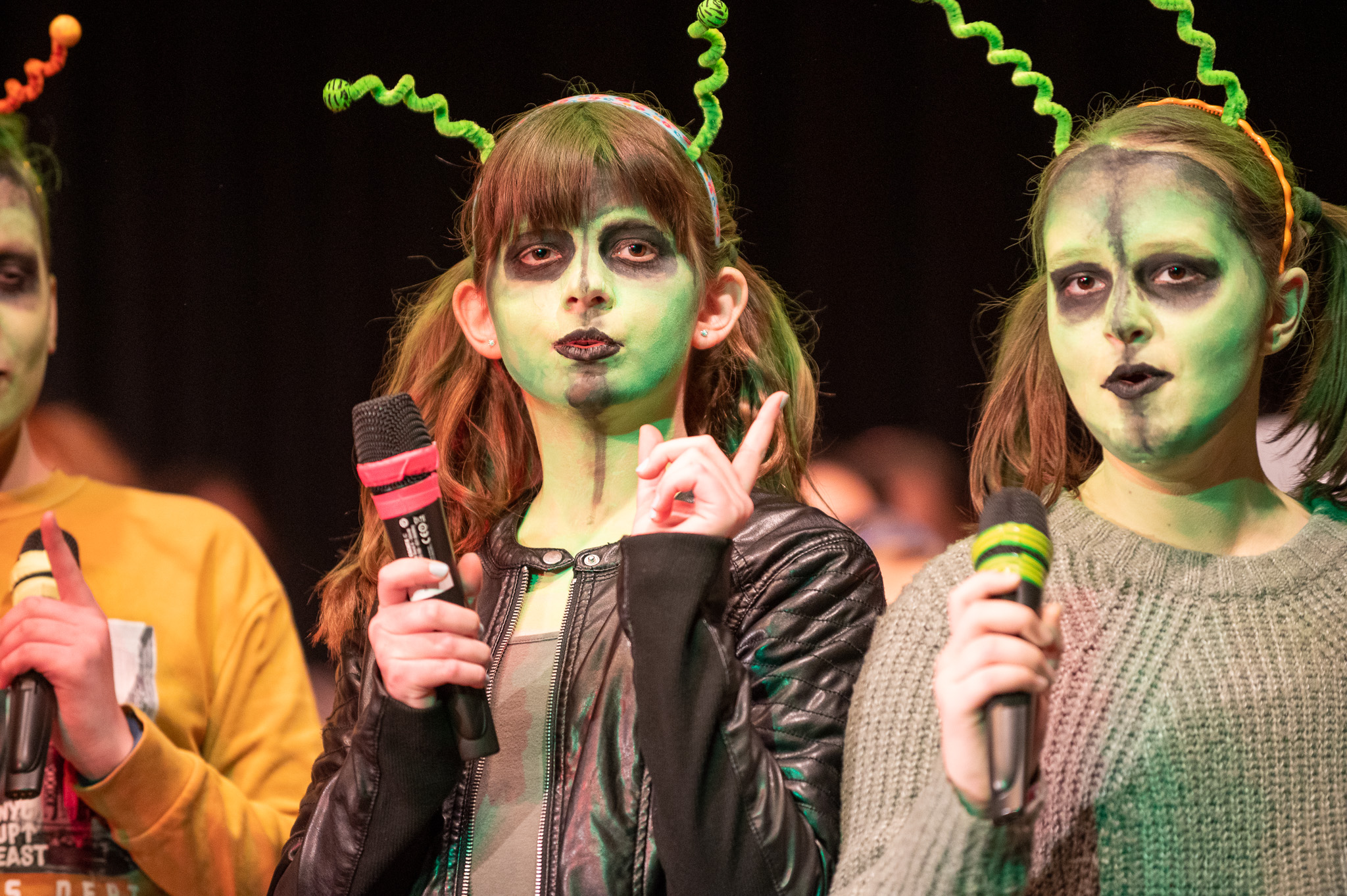 Eine Geschichte hat immer zwei Gesichter. Es kommt jedoch selten vor, dass das so wörtlich gemeint ist wie in der Poolaufführung, die unsere siebten Klassen am 14. Februar in der Kulturmulde unter der Leitung von Frau Strasser, Frau Weber, Frau Greulich und Herrn Kocsis präsentierten. In dem Musical zeigt uns die Hauptfigur Luna ihr zweites Gesicht als Alienmädchen Alienne. Als Luna noch von der Clique der Supercoolen der Schule angefeindet, entwickelt sie sich als Alienne zum absoluten Star. Dabei überzeugte uns besonders die Hauptdarstellerin Pauline ebenso wie die provokant zickig dargestellten „Supercoolen“, angeführt von Emily. In die Geschichte hineingezogen haben uns jedoch nicht nur die Darsteller und die Songs, die meist von einem Chor aus Kindern aller siebten Klassen begleitet wurden, sondern auch das Make—up von einem anderen Stern, das Adel auf die Gesichter der Aliens „beamte“. Nicht zu vergessen ist auch die musikalische Untermalung durch die Band, die durch Peter aus der JG12 tatkräftig unterstützt wurde.