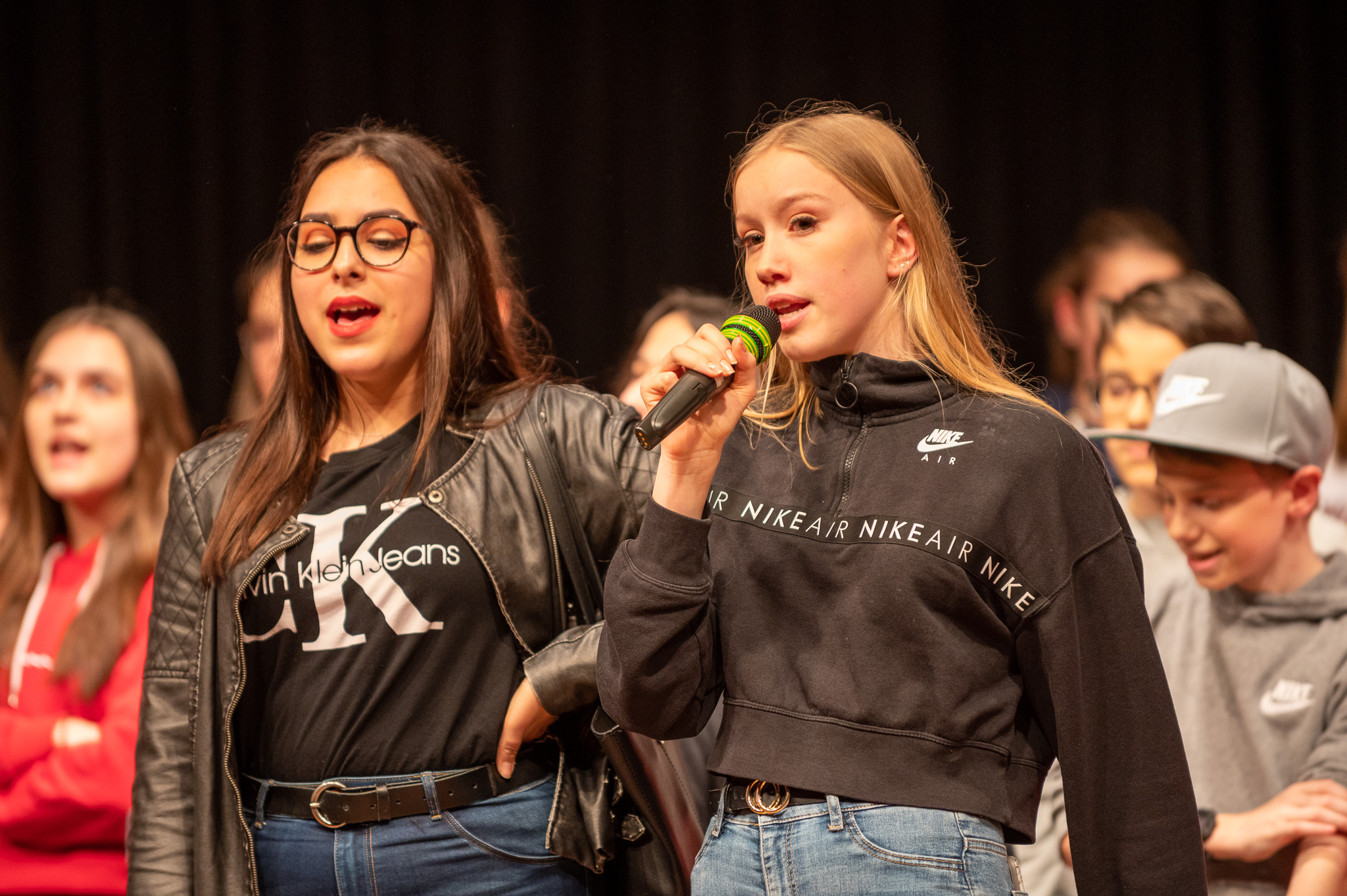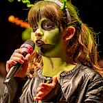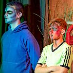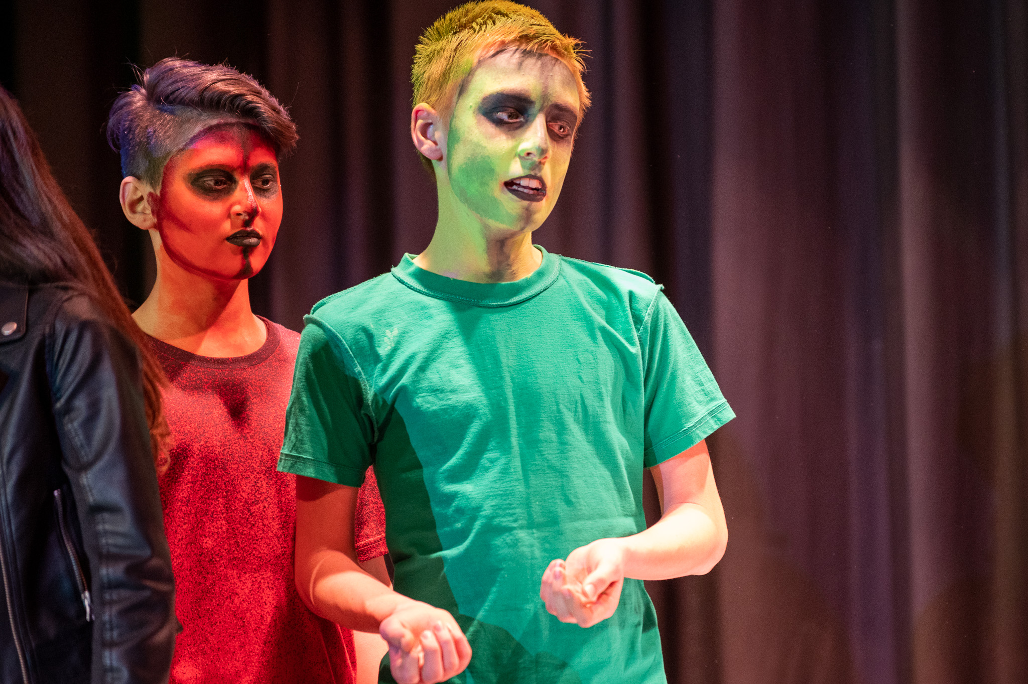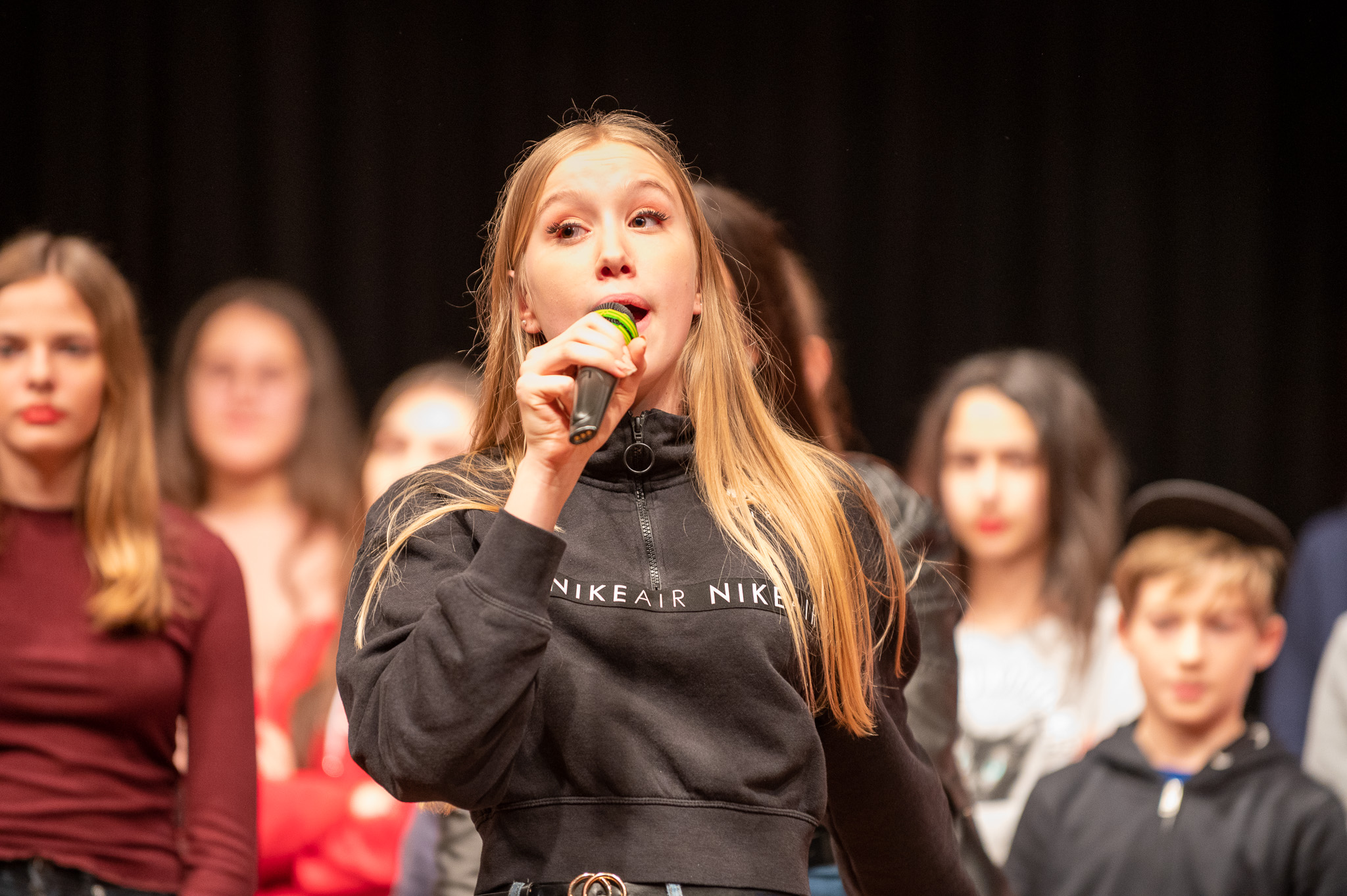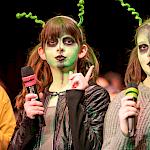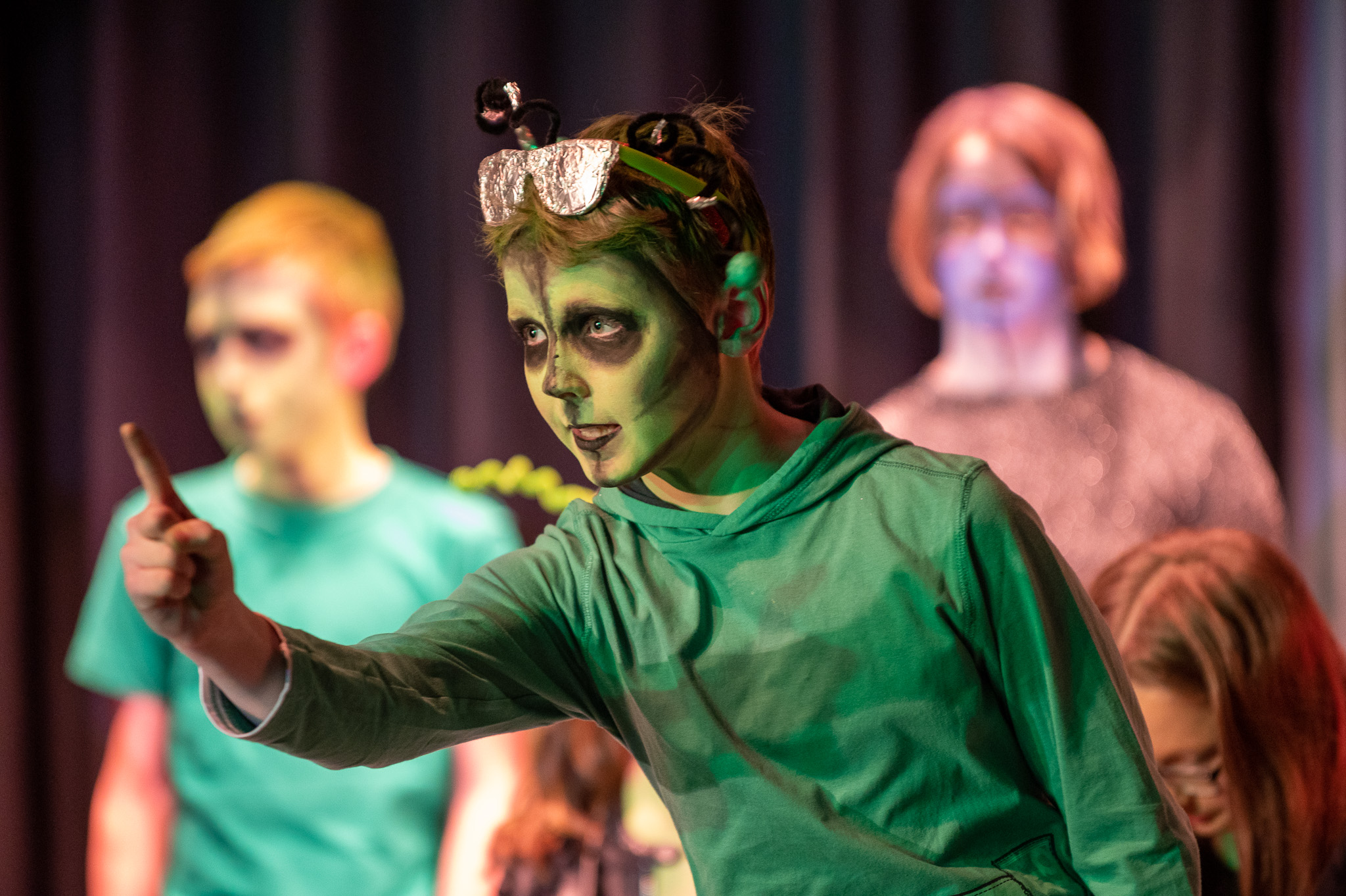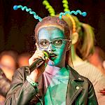 Eine Geschichte hat immer zwei Gesichter. Es kommt jedoch selten vor, dass das so wörtlich gemeint ist wie in der Poolaufführung, die unsere siebten Klassen am 14. Februar in der Kulturmulde unter der Leitung von Frau Strasser, Frau Weber, Frau Greulich und Herrn Kocsis präsentierten. In dem Musical zeigt uns die Hauptfigur Luna ihr zweites Gesicht als Alienmädchen Alienne. Als Luna noch von der Clique der Supercoolen der Schule angefeindet, entwickelt sie sich als Alienne zum absoluten Star. Dabei überzeugte uns besonders die Hauptdarstellerin Pauline ebenso wie die provokant zickig dargestellten „Supercoolen“, angeführt von Emily. In die Geschichte hineingezogen haben uns jedoch nicht nur die Darsteller und die Songs, die meist von einem Chor aus Kindern aller siebten Klassen begleitet wurden, sondern auch das Make—up von einem anderen Stern, das Adel auf die Gesichter der Aliens „beamte“. Nicht zu vergessen ist auch die musikalische Untermalung durch die Band, die durch Peter aus der JG12 tatkräftig unterstützt wurde.