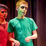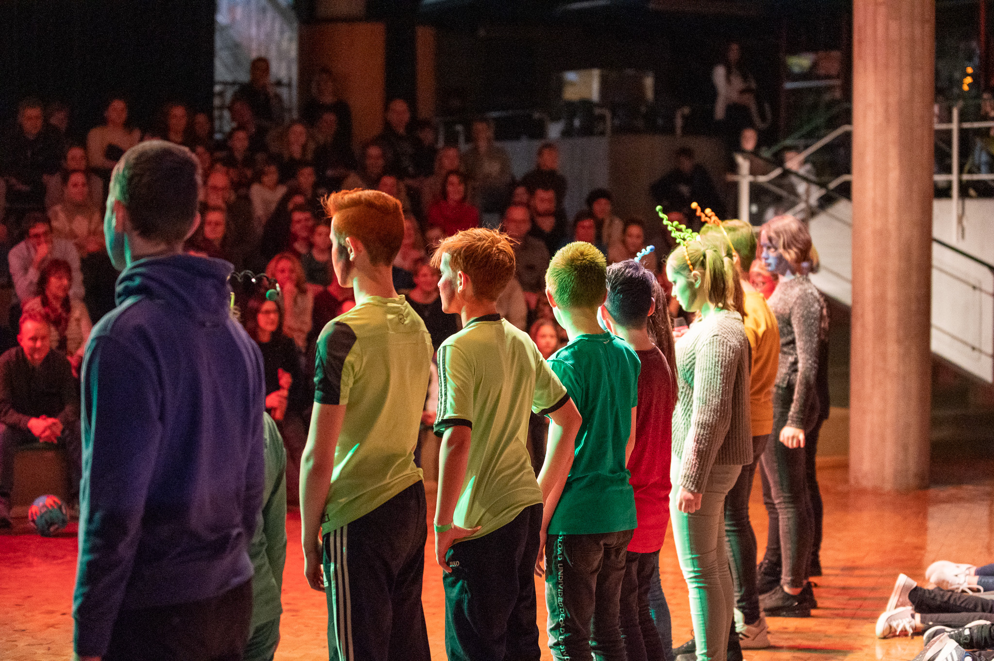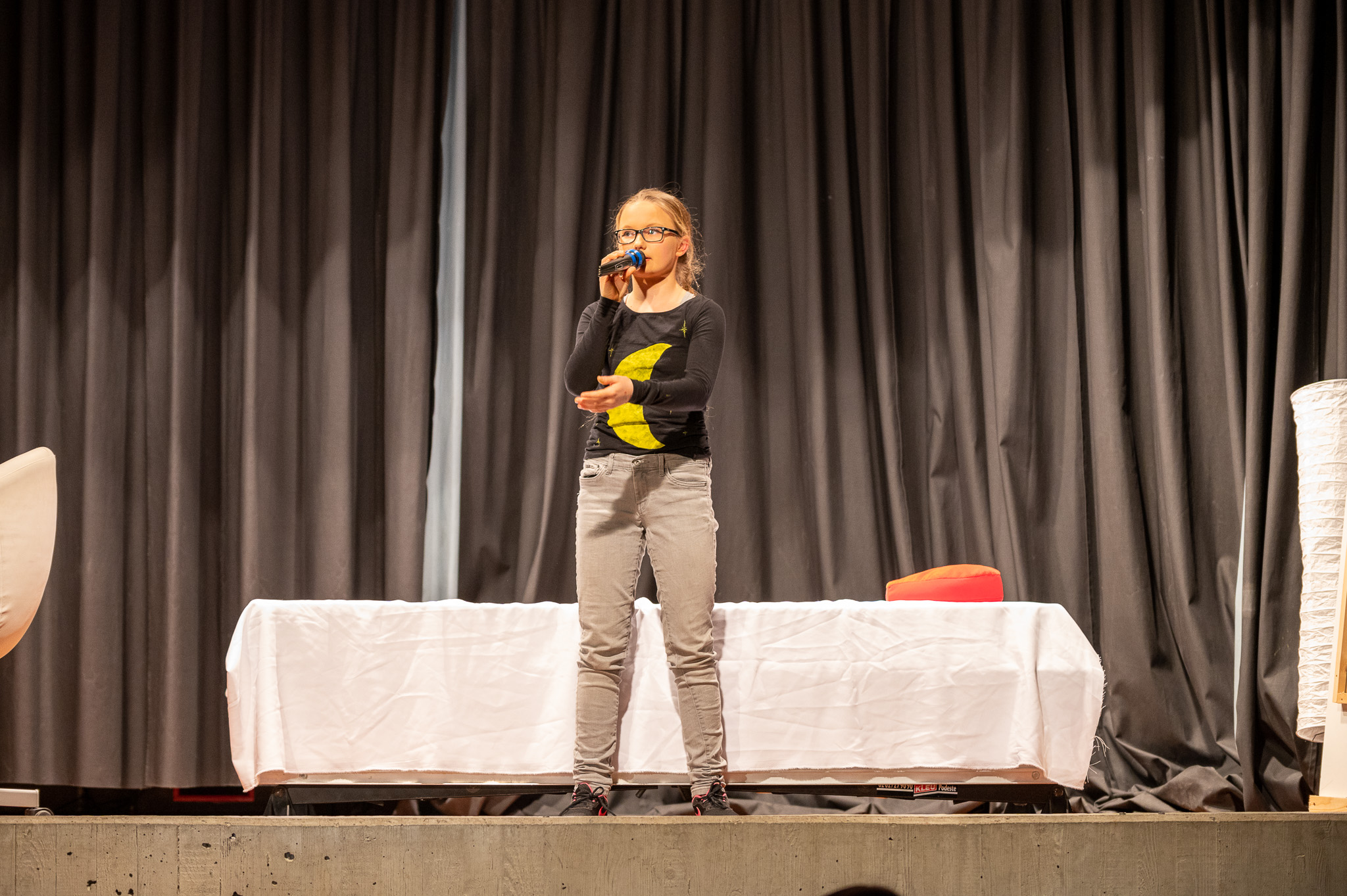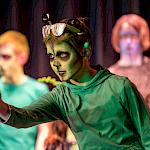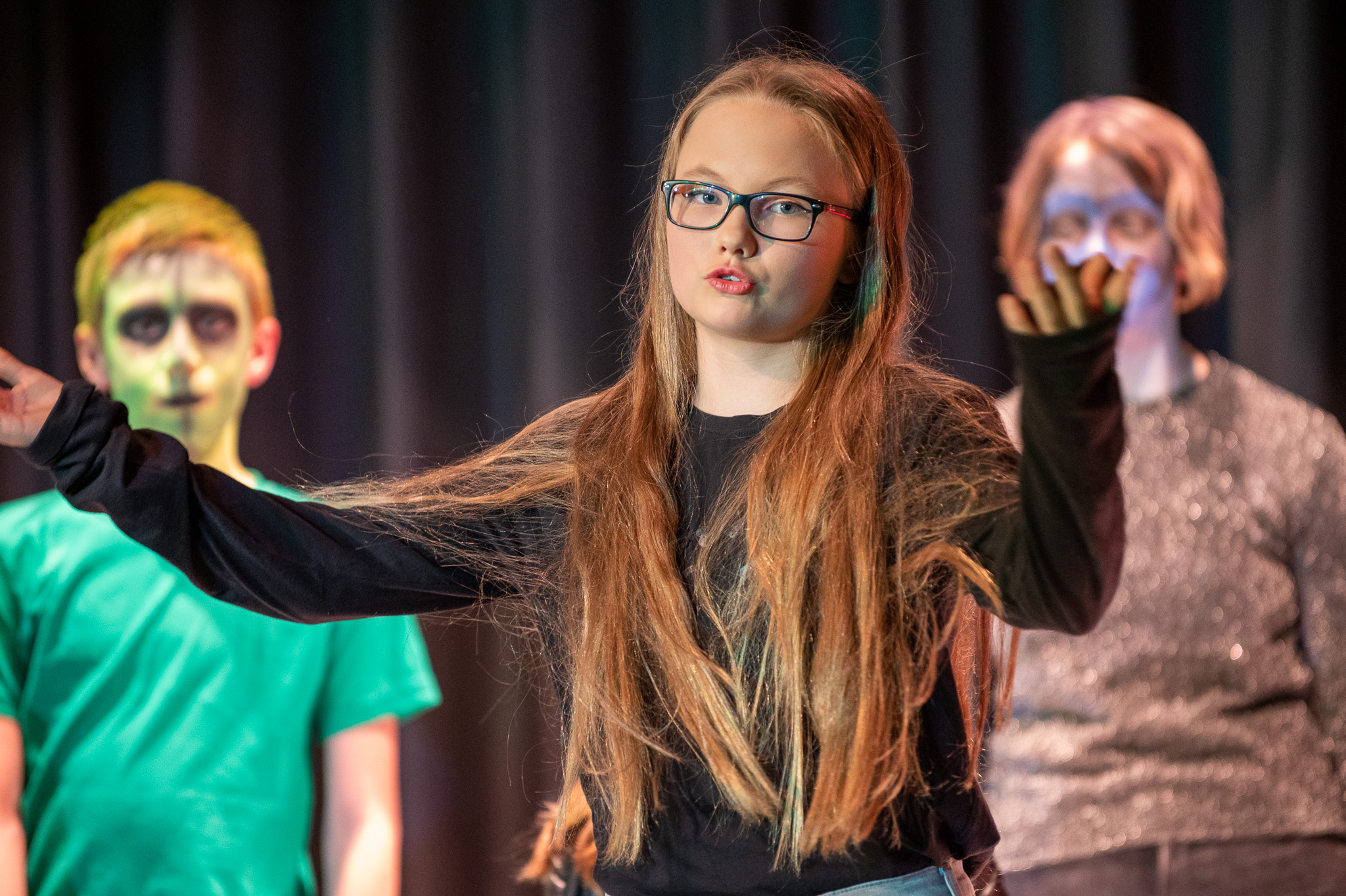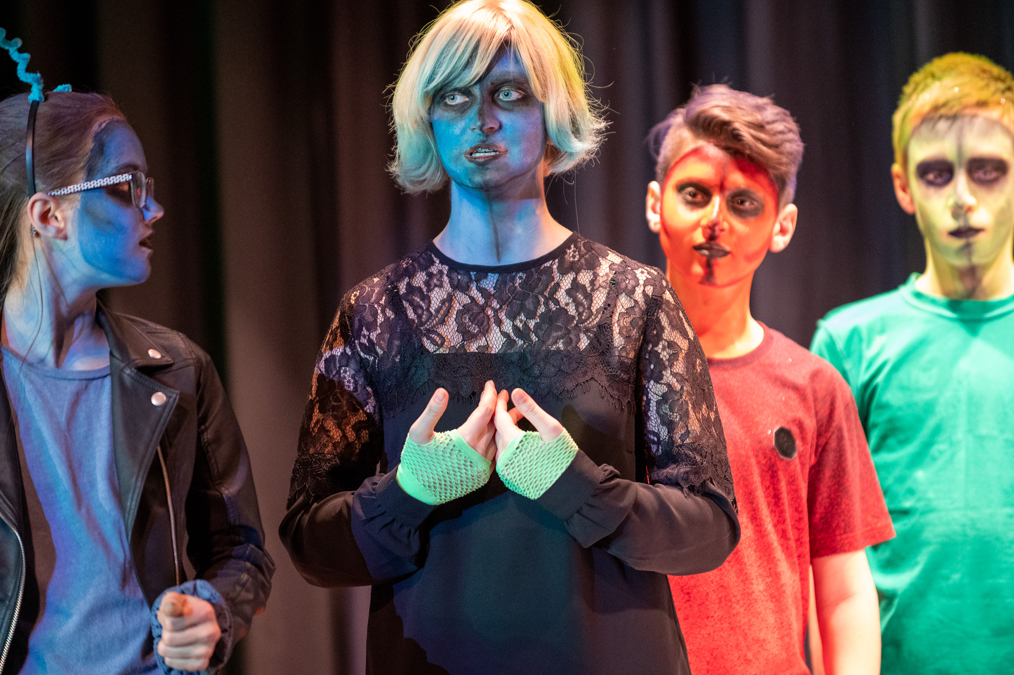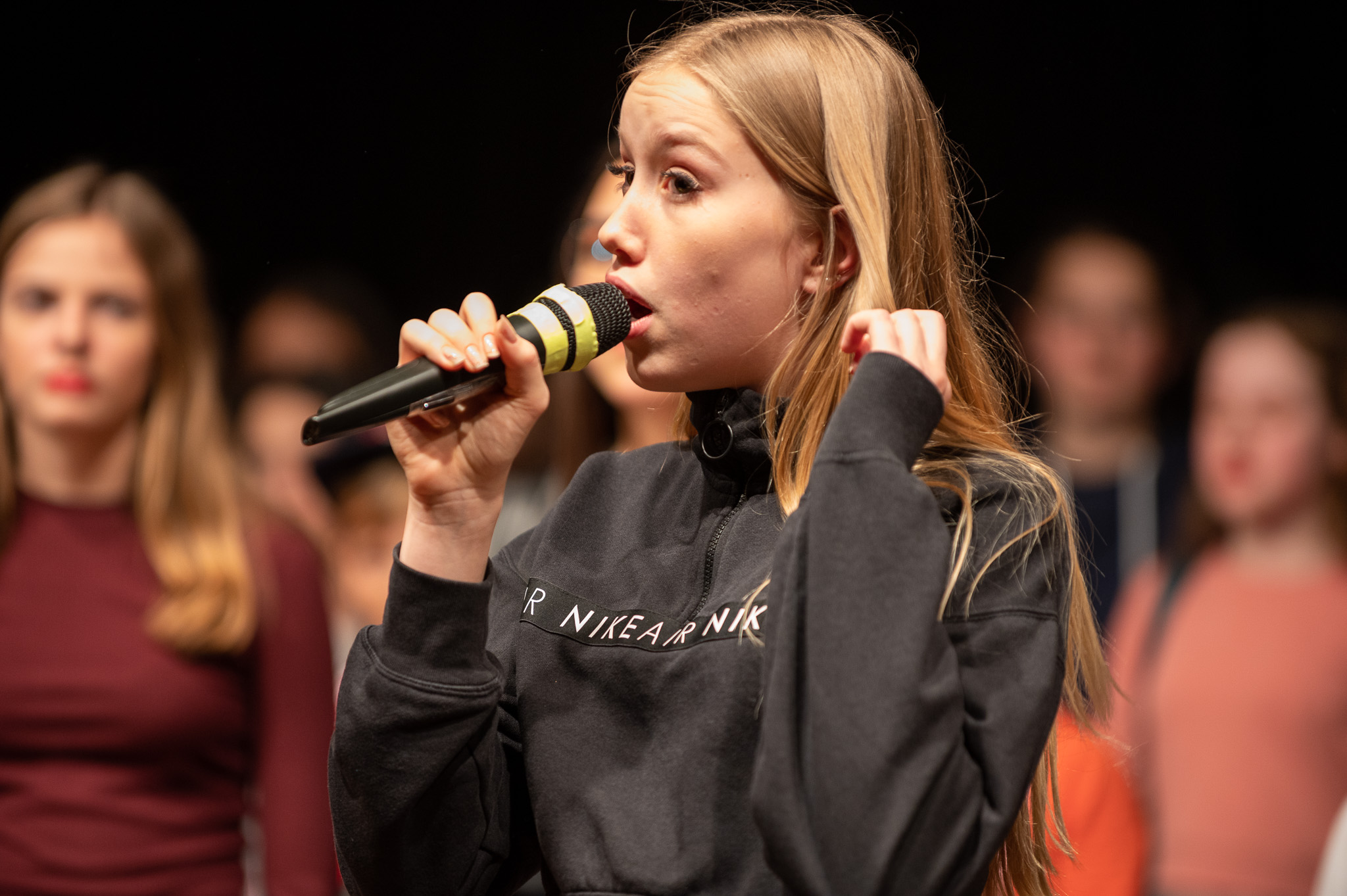 Eine Geschichte hat immer zwei Gesichter. Es kommt jedoch selten vor, dass das so wörtlich gemeint ist wie in der Poolaufführung, die unsere siebten Klassen am 14. Februar in der Kulturmulde unter der Leitung von Frau Strasser, Frau Weber, Frau Greulich und Herrn Kocsis präsentierten. In dem Musical zeigt uns die Hauptfigur Luna ihr zweites Gesicht als Alienmädchen Alienne. Als Luna noch von der Clique der Supercoolen der Schule angefeindet, entwickelt sie sich als Alienne zum absoluten Star. Dabei überzeugte uns besonders die Hauptdarstellerin Pauline ebenso wie die provokant zickig dargestellten „Supercoolen“, angeführt von Emily. In die Geschichte hineingezogen haben uns jedoch nicht nur die Darsteller und die Songs, die meist von einem Chor aus Kindern aller siebten Klassen begleitet wurden, sondern auch das Make—up von einem anderen Stern, das Adel auf die Gesichter der Aliens „beamte“. Nicht zu vergessen ist auch die musikalische Untermalung durch die Band, die durch Peter aus der JG12 tatkräftig unterstützt wurde.