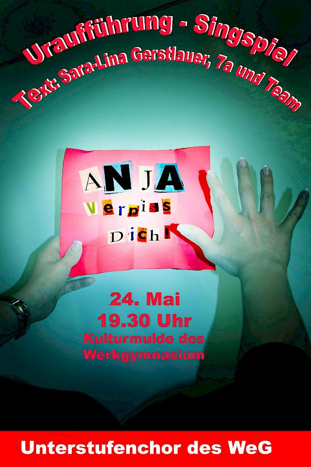 Die Gruppe beschäftigte sich drei Monate lang intensiv mit dem Thema Mobbing. Aus dieser Auseinandersetzung entstand das Singspiel. Die Texte wurden von der WeG-Schülerin Sara-Lina Gerstlauer geschrieben, die auch die Hauptrolle der Anja übernommen hatte. Untermalt wurde die Handlung durch vier Songs, die alle in ihrer Ehrlichkeit und Authentizität beim Publikum großen Eindruck hinterließen. Insbesondere der zweite Song, in dem sich Anja die Frage stellt: „Was mach ich falsch?“, brachte überaus eindrucksvoll die inneren Nöte der Schülerin auf die Bühne, die die immer aggressiveren Angriffe der Klasse bei Anja auslösen.