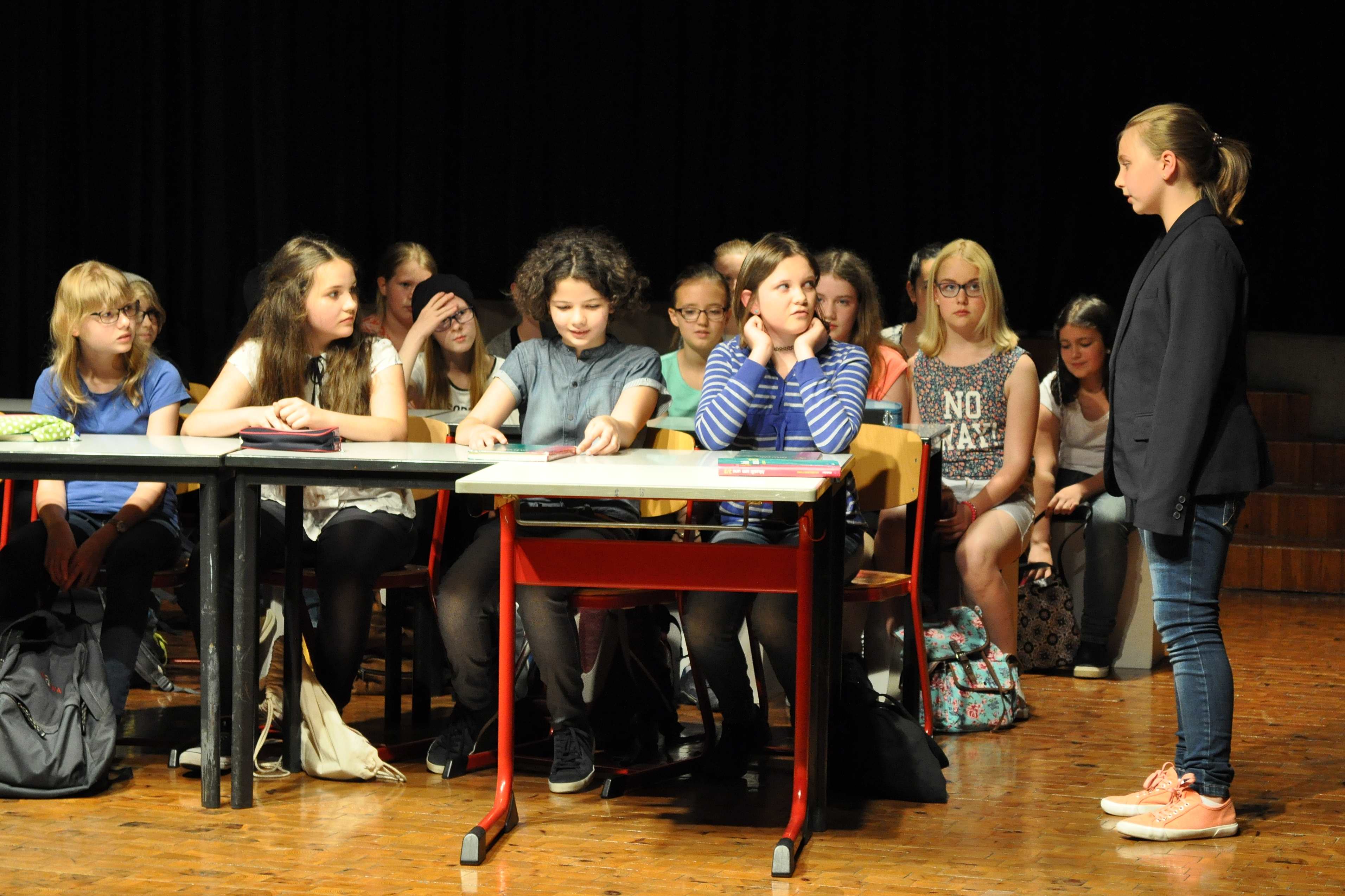 Am vergangenen Mittwoch wurde in der Kulturmulde des Werkgymnasiums ein Singspiel des Unterstufenchors der Klassen 5-7 zum Thema „Mobbing“ aufgeführt. In ihren einleitenden Worten verwies Chorleiterin Helga Weber, Musiklehrerin am WeG, darauf, dass der pointierte Titel des Singspiels „Anja, verpiss dich!“ aus dem Text des Stückes selbst stammt und von den beteiligten Schülerinnen und Schülern aufgrund seiner Aggressivität bewusst ausgewählt wurde.