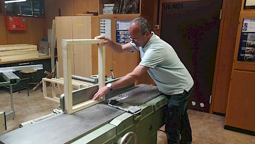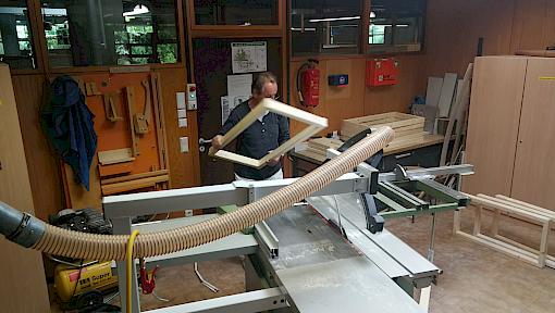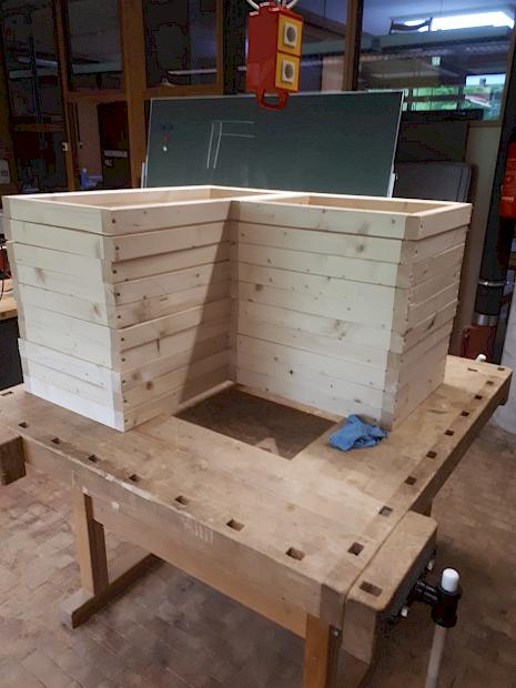 Ein Plan, die sich seit dem Rückzug der Stadtbibliothek Filiale Ost immer mehr verfestigt hatte, wird nun Wirklichkeit! Ein großes zweistufiges Sitz- und Universalmöbel in U-Form, das eine ganze Klasse fassen kann, entsteht gerade in unserer Profi-Holzwerkstatt. Herr Brodbeck und Herr Hampe hatten die Pläne erstellt und nun geht es ans Sägen, Hobeln, Schleifen, Leimen und Schrauben. Das hochwertige Holzmaterial wurde von unserem Förderverein finanziert und wird nun durch die erfahrenen Hände unseres Kurs A-Kollegen Herrn Brodbeck und unseres ehemaligen Kurs A-Lehrers Herrn Hampe bearbeitet. An dieser Stelle einen herzlichen Dank an unseren Förderverein und ganz besonders natürlich an Herrn Brodbeck und Herrn Hampe.