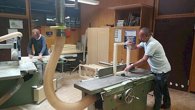 Ein Plan, die sich seit dem Rückzug der Stadtbibliothek Filiale Ost immer mehr verfestigt hatte, wird nun Wirklichkeit! Ein großes zweistufiges Sitz- und Universalmöbel in U-Form, das eine ganze Klasse fassen kann, entsteht gerade in unserer Profi-Holzwerkstatt. Herr Brodbeck und Herr Hampe hatten die Pläne erstellt und nun geht es ans Sägen, Hobeln, Schleifen, Leimen und Schrauben. Das hochwertige Holzmaterial wurde von unserem Förderverein finanziert und wird nun durch die erfahrenen Hände unseres Kurs A-Kollegen Herrn Brodbeck und unseres ehemaligen Kurs A-Lehrers Herrn Hampe bearbeitet. An dieser Stelle einen herzlichen Dank an unseren Förderverein und ganz besonders natürlich an Herrn Brodbeck und Herrn Hampe.