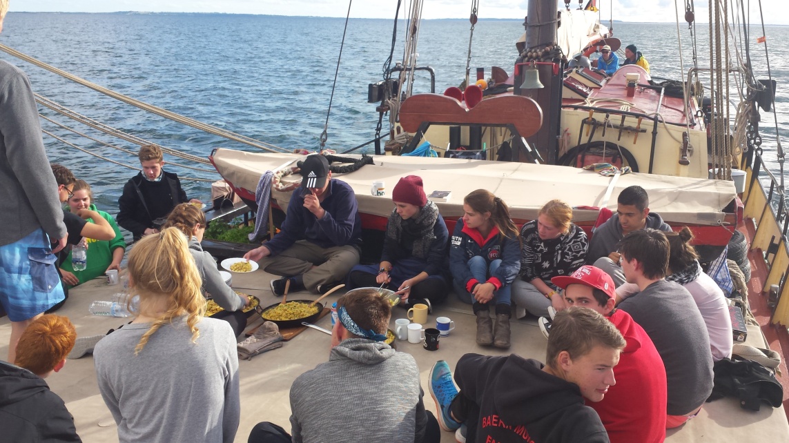 Schon zur schönen Tradition geworden ist die Studienfahrt Segeln auf der Ostsee: „Zu einer „Terra incognita“ begaben sich am Freitag Abend 20 Schülerinnen und Schüler mit ihren beiden Begleitlehrern mit einem ganzen Bus voll Lebensmitteln auf eine Nachtfahrt nach Kappeln an der Schlei. Die Ankunft bei leichtem Regen war wenig erquicklich und auch das Beladen des nun zu unserem Zuhause werdenden Schiffs, morgens um 7 Uhr bei Regen und unausgeschlafen, ließ fürs Erste wenig Stimmung aufkommen. Das Schiff, die „Fortuna“, mit dem wir dann 8 Tage unterwegs sein sollten, ist ein 100 Jahre alter, knapp 40 Meter langer Seeever mit zwei Masten und 480 qm Segelfläche, der von dem Verein Mignon in Hamburg betrieben wird und üblicherweise integrative Segelreisen mit behinderten oder schwerkranken Jugendlichen durchführt. Kaum waren zu Mittag die Leinen in Kappeln losgeworfen, gesellte sich die Sonne zu uns und der Auftakt für unsere Segelreise konnte kaum besser sein. Unserer erstes Ziel, die kleine Insel Lyö in der südfünischen Inselwelt, ist quasi Dänemark in klein, die Häuser, Landschaft, Gärten und die Menschen und natürlich am Abend Fußball auf dem Handy.