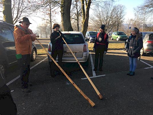 Zur Begrüßung auf dem Parkplatz des Waldfriedhofs gab es eine Kostprobe auf dem „Albhorn“ der Albschäfer, dem „Handy“, das die Schafhirten schon im 15. Jahrhundert benutzten, wobei unsere Musikpädagogin Frau Weber ihn kräftig unterstützen durfte.