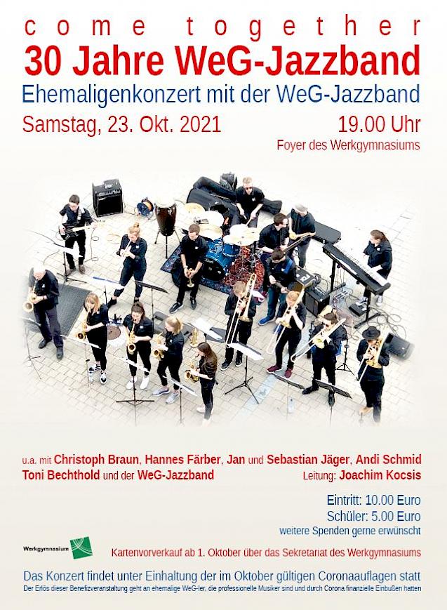 Nach 2011 kommt es jetzt am Samstag, 23. Oktober 2021, um 19.00 Uhr zu einer Neuauflage des „Come together“ aus Anlass des 30-jährigen Bestehens der „WeG-Jazzband“. Mehrere ehemalige Schüler wie Christoph Braun, Hannes Färber, Jan und Sebastian Jäger, Andi Schmid, Toni Bechtold und andere haben ihr Kommen schon zugesagt und sich für die Veranstaltung angemeldet.
