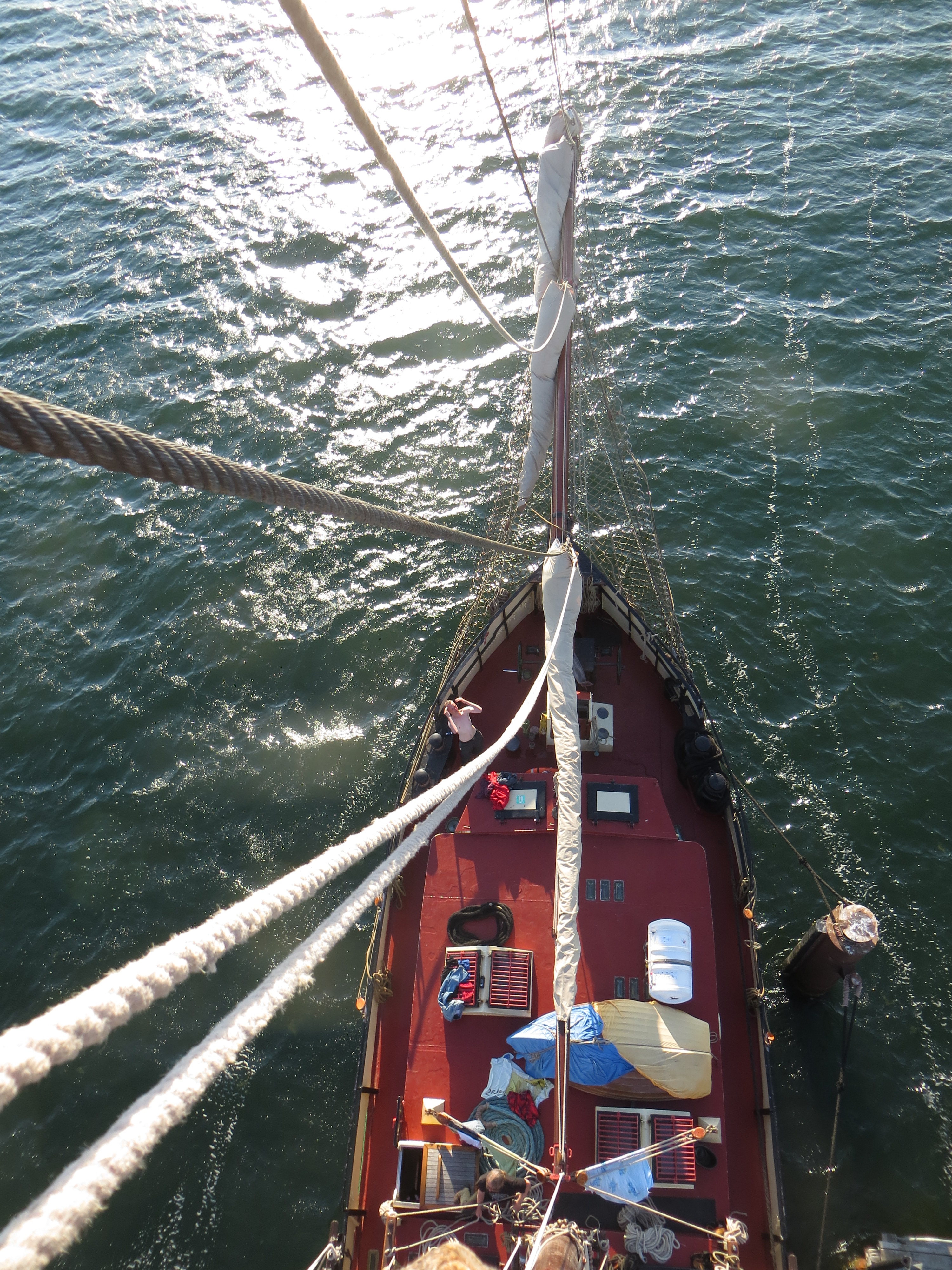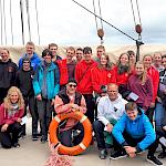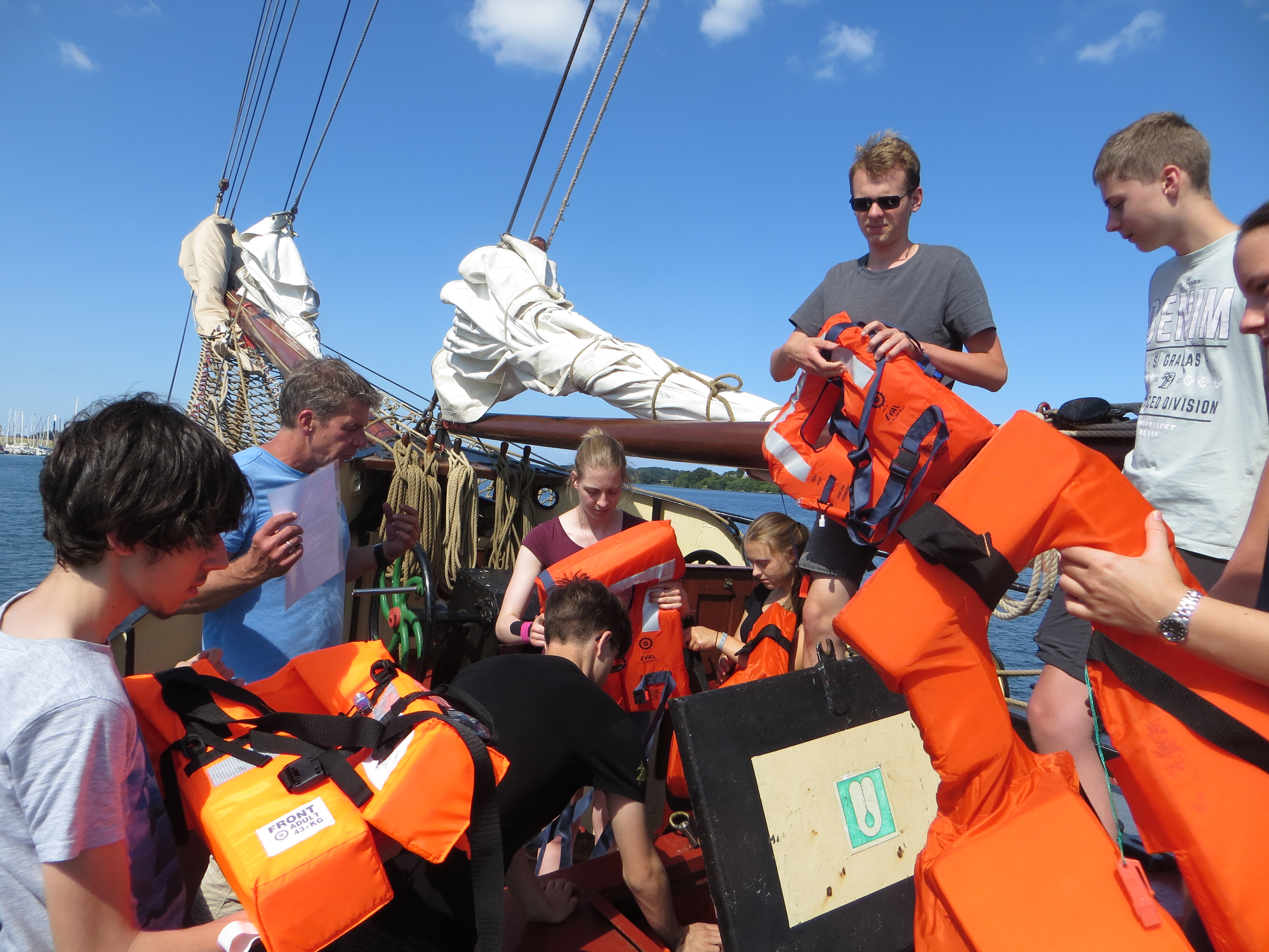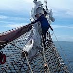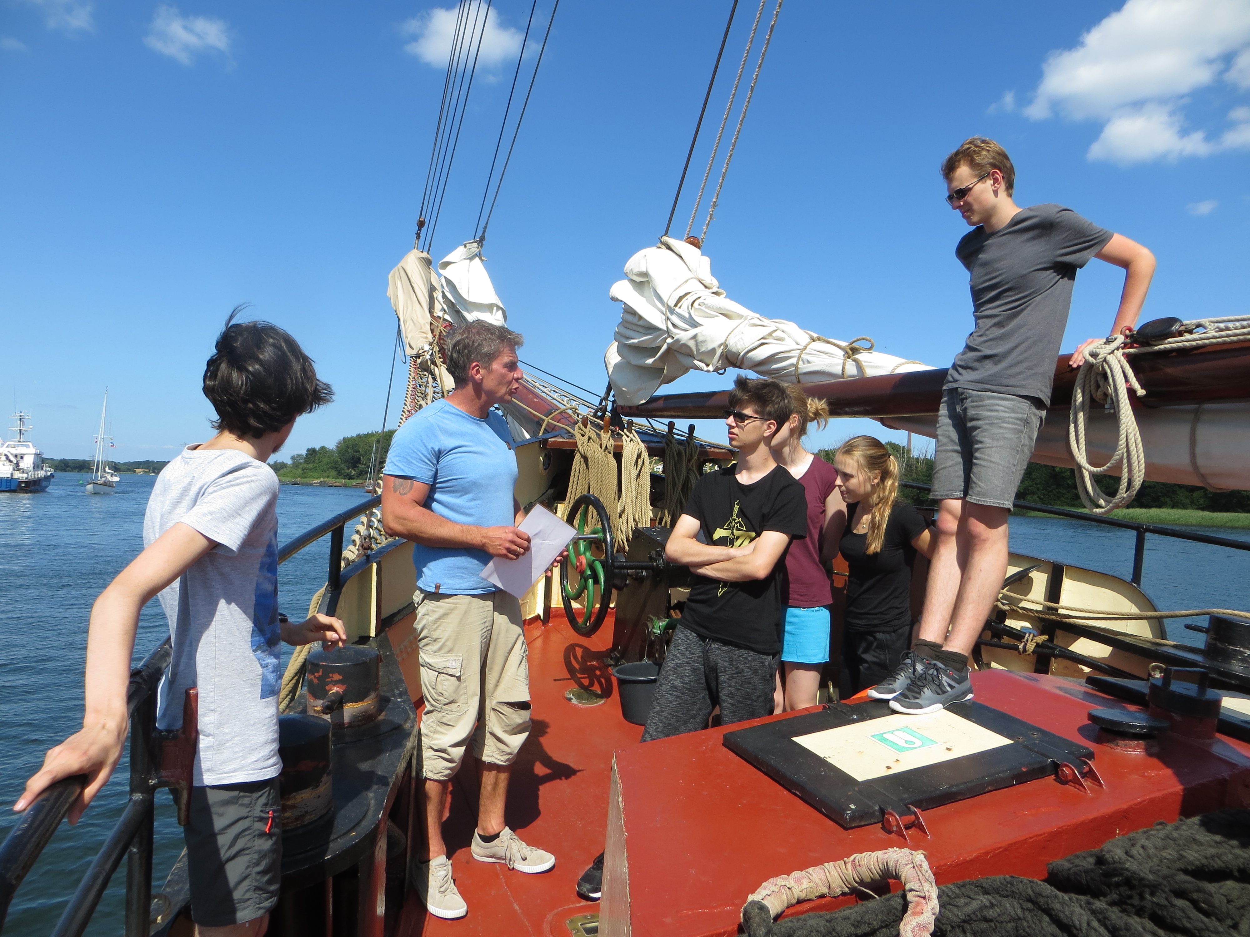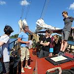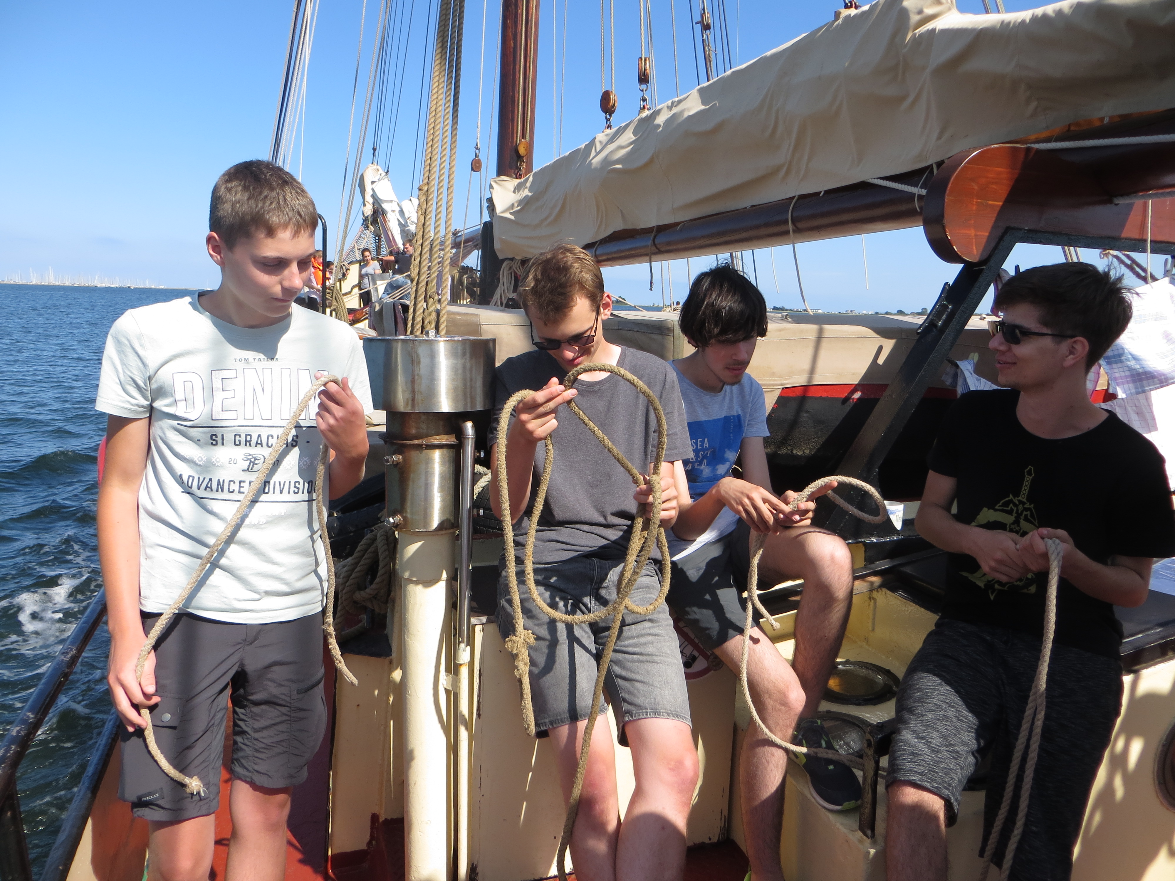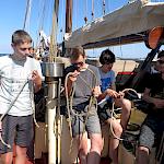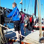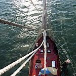 Kurz darauf: Leinen los, und drei Gruppen werden in ihre Segel eingewiesen. Das Schiff verlässt den Fluss. Wir setzen unter genauen Anweisungen der Stammcrew zum ersten Mal die Segel. Am Anfang der Reise war für uns nicht absehbar, dass die Befolgung des Kommandos "Innen und Außenklüver setzen" innerhalb kürzester Zeit so routiniert ablaufen würde, dass die Stammcrew dies nicht mehr beaufsichtigen musste.