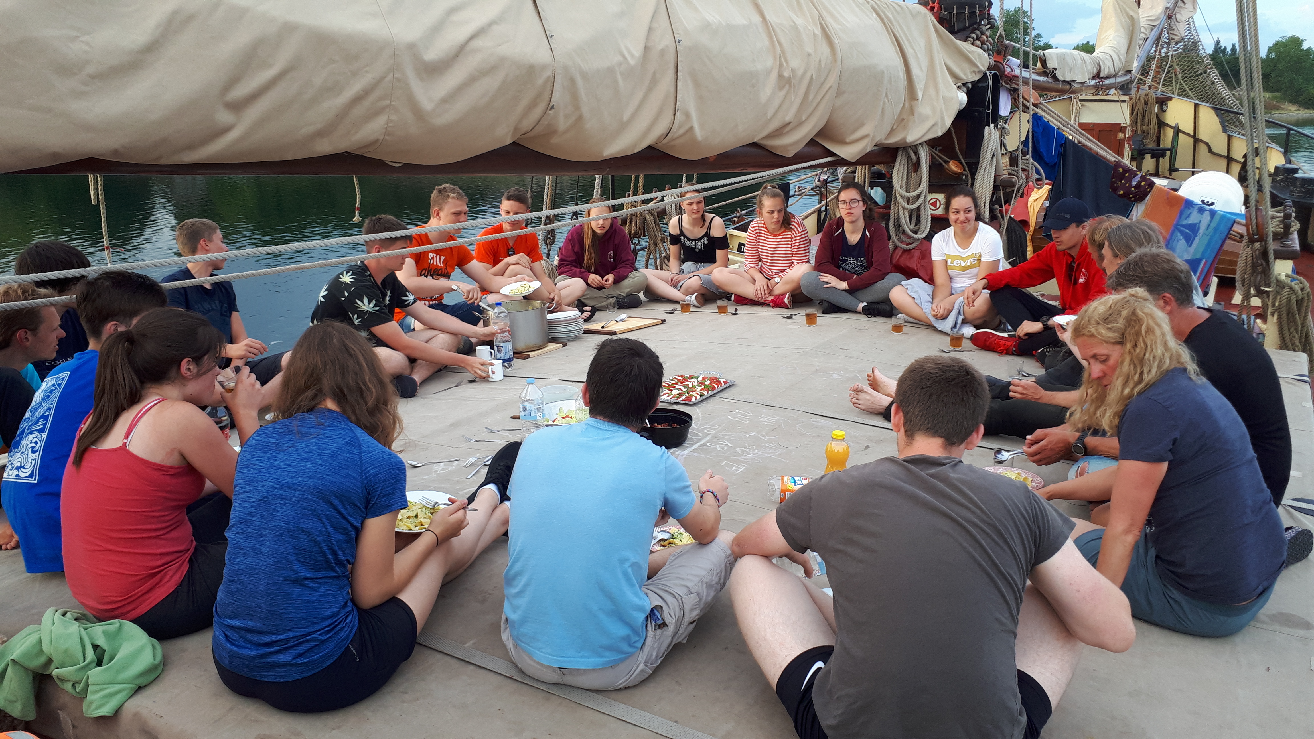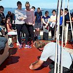 Viele in unserer Gruppe nahmen Bücher mit auf die Reise. Kaum einer hat auch nur eines durchgelesen. Zeit war genug da, aber unsere Gruppe hat sich meistens mit etwas anderem beschäftigt: mit dem “Nichtstun”. Wir lagen an Deck, während die Sonne uns ins Gesicht schien. Es war nie langweilig. Klar, manche ruhige Pause war recht abrupt beendet, von einem Manöver oder einem Eimer Wasser, der über nichtsahnende, unschuldige Schüler gegossen wurde. Trotzdem war das Rumliegen unglaublich entspannend.