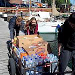 Start in Kappeln, Schüler ziehen zwei schwer beladene Wägelchen über Piers, die dafür gerade groß genug sind und laden dann eine Menge an Lebensmitteln ins Schiff, das absurd groß wirkt. Es ist schwer vorstellbar, dass man 50 Liter Milch in einer Woche verbrauchen kann.