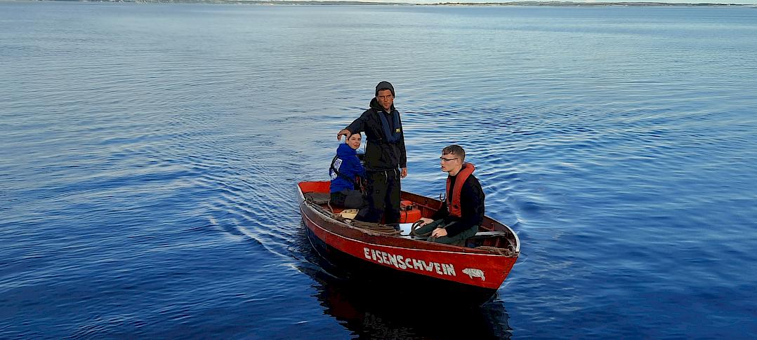 Die Besatzung lehrte einem immer wieder neue Dinge und einige von uns durften sogar an das Steuer. Ein weiteres Highlight des Tages war ein Probe-Rettungsmanöver, bei dem Kuno in einem Überlebensanzug „Tonja“, eine Plastiktonne die über Bord gegangen ist, rettete. Für uns alle wurde die Zeit auf der Fortuna nie langweilig, da immer Action geboten war. Vom Klettern im Netz, bis zum gesicherten Hochziehen auf den Masten - es gab immer coole Erlebnisse. Am Abend ankerten wir zum ersten Mal auf „hoher See“. Immer, wenn wir nicht in einem Hafen anlegten, hieß es Nachtwache für uns. In Zweiergruppen waren wir schichtweise verantwortlich, uns um den Anker, das Schwojen des Schiffs, die Wetterbeständigkeit und um die Petroleumlampe am Mast zu kümmern. Dabei konnte man immer wieder einige Sternschnuppen am klaren Himmel sehen und auch die leuchtenden Plankton-Algen waren in der Nacht zu beobachten. Nach der Nachtwache war es oftmals eines der besten Gefühle, sich anschließend, warm eingepackt, in sein Bett zu legen und sich von einem aufregenden Tag zu erholen. Am Anfang unserer Reise waren viele die kalten und windigen Temperaturen noch nicht sehr gewohnt und bis zu 6 Schichten Kleidung wurden im „Zwiebellook“ angezogen.