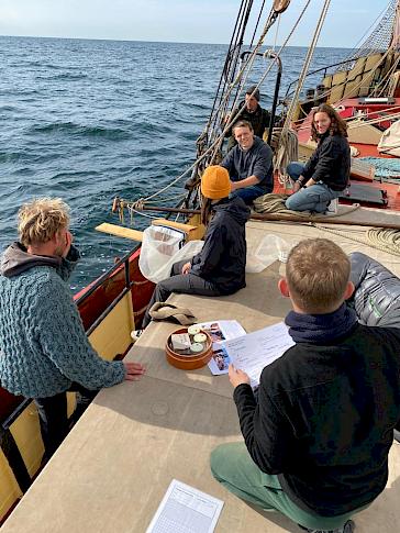 Der Montagmorgen startete für die meisten mit dem Zähneputzen oben an Deck, oder aber auch mit dem Bewundern des Sonnenaufgangs. Es folgte ein ausgiebiges Frühstück mit frisch gebackenem Brot, Müsli usw. und die Pläne für den Tag wurden mit Carsten und der Crew besprochen. Es war schönes Wetter, was lediglich durch spontane Regenschauer unterbrochen wurde, welche dann aber auch wieder sehr schnell vorbeizogen. Der Wind lag bei etwa Windstufe 4 und war für das Segeln in unsere Wunschrichtung sehr praktisch. Unsere gesamte Fahrt lang steuerten wir aber nie genaue Ziele oder Pläne an, da die Seefahrer abergläubisch sind und glauben, dass der der Wettergott der Segler namens „Rasmus“ sonst ihre Pläne durchkreuzt, wenn der diese erfährt. Als die Segel nun erst einmal gesetzt waren, backten wir einen Geburtstagskuchen für unser „Geburtstagskind“ Yusuf und erledigten andere kleinere Tätigkeiten an Bord. Zwischendurch, als weder ein Manöver wie „Wende oder Halse“ durchgeführt wurde und auch die Segel richtig standen, war Entspannen und Spielzeit angesagt. Mittags gab es meistens geschmierte Brote, die wir dann mit schöner Aussicht auf die Ostsee verspeisten.