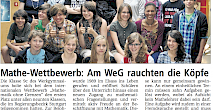 Die Klasse 9c war beim Wettbewerb "Mathematik ohne Grenzen" überaus erfolgreich und belegte den 1. Platz im Regierungsbezirk Nord-Württemberg. Deshalb durfte die ganze Klasse Anfang Juli zur Siegerehrung nach Stuttgart fahren...mehr. Damit ist die 9c bereits die zweite Klasse des Werkgymnasiums, die diesen Wettbewerb gewinnt. Im Jahr der Mathematik 2008 war die damalige Klasse 10b die Siegerklasse.. mehr.