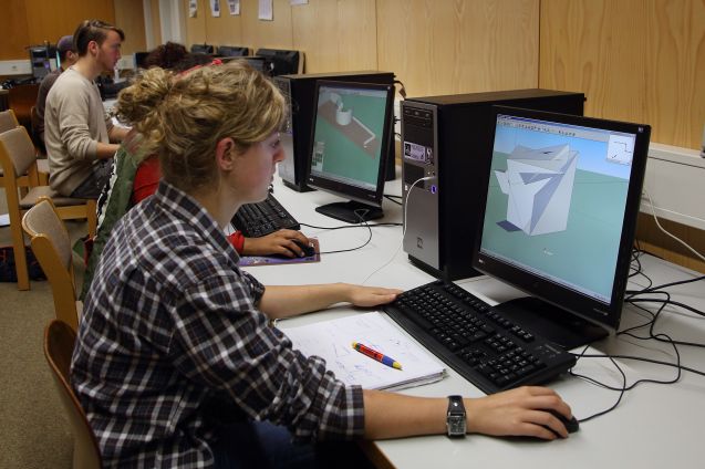 In diesem Trimester lernen die Schüler einfache 3D Anwendungen kennen. Mithilfe des Programmes SketchUp werden Körper generiert und beispielsweise architektonische Aufgaben – wie etwa ein fiktiver Umbau der Schule anhand eines Modells - bewältigt. Es werden aber auch eigene Entwürfe angefertigt und so neue digitale Baukörpermodelle von Wohn- oder Bildungseinrichtungen erstellt. Dabei beschäftigen sich die Schüler nicht nur mit der rein funktionalen Zuweisung von Flächen, bzw. der Oberflächengestaltung ihrer Architekturen, sondern auch der bewussten/gestaltenden Verteilung und Proportionierung der Baukörper(-teile) zu sich selbst und zu ihrer Umgebung.