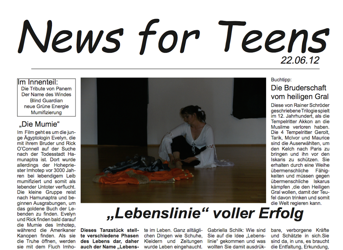 Im Projekt „Zeitung“ im Kurs D der KS 9 lernen die Schülerinnen und Schüler eine Zeitung als das Ergebnis eines planvollen Gestaltens auf den Ebenen von Text und Grafik kennen. Im Kursmodul „Zeitung“ geht es zunächst um ein „manuelles Layout“, also um den Nachbau einer Zeitungsseite aus Zeitungsbruchstücken. Hierbei lernen die Schülerinnen und Schüler alle Wesensmerkmale des Zeitungssatzes intuitiv. Dann nähern sich die Schülerinnen und Schüler dem digitalen Layout an und produzieren selbstständig redaktionell und layouttechnisch eine vollfarbige Zeitungsdoppelseite im Format DIN-A3.