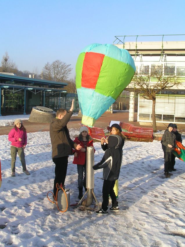 Der Start des Ballons mit Hilfe eines Gasbrenners und eines Ofenrohres zum Transport der heißen Luft bildet den Abschluss und Höhepunkt des Projekts.